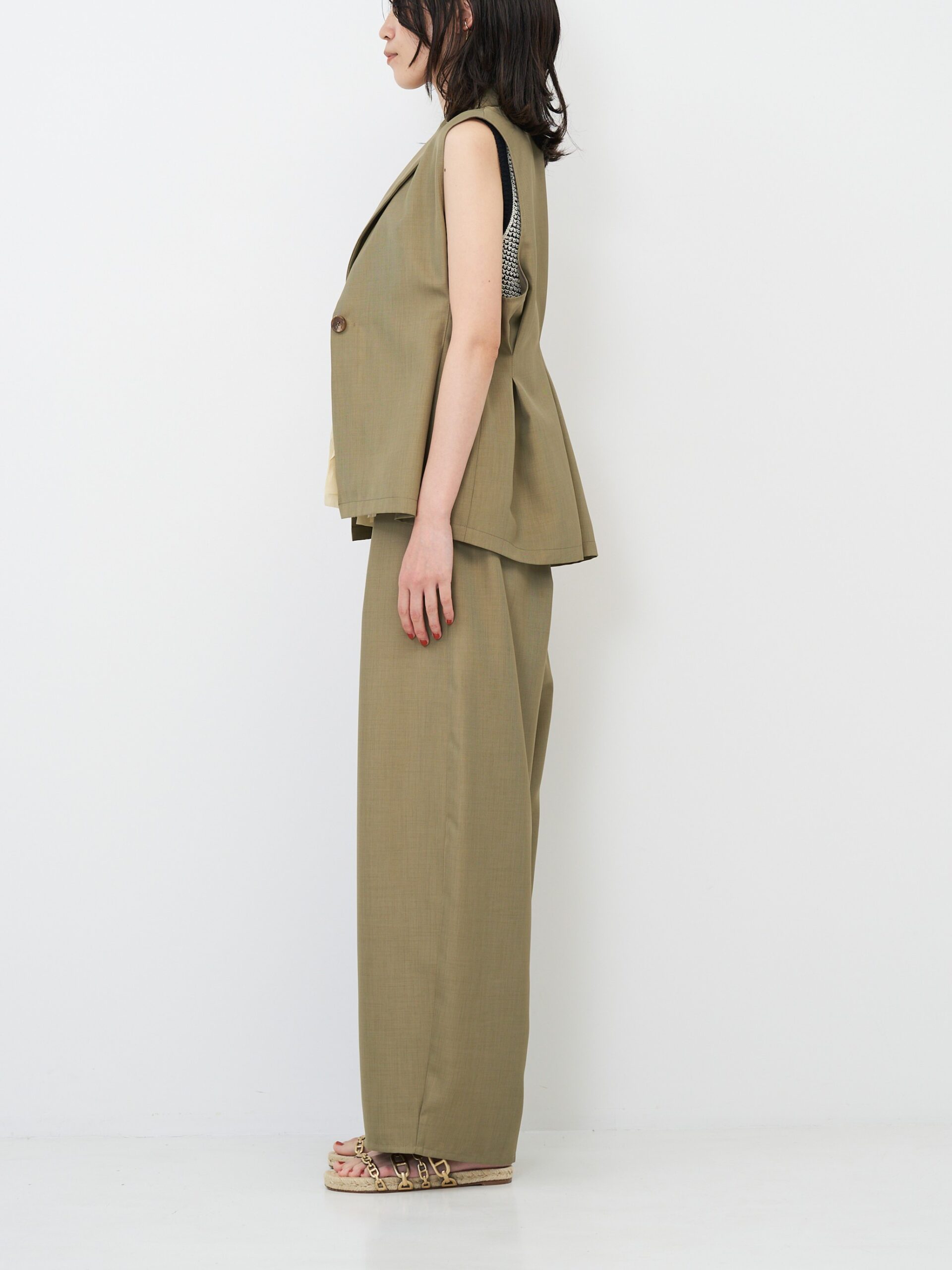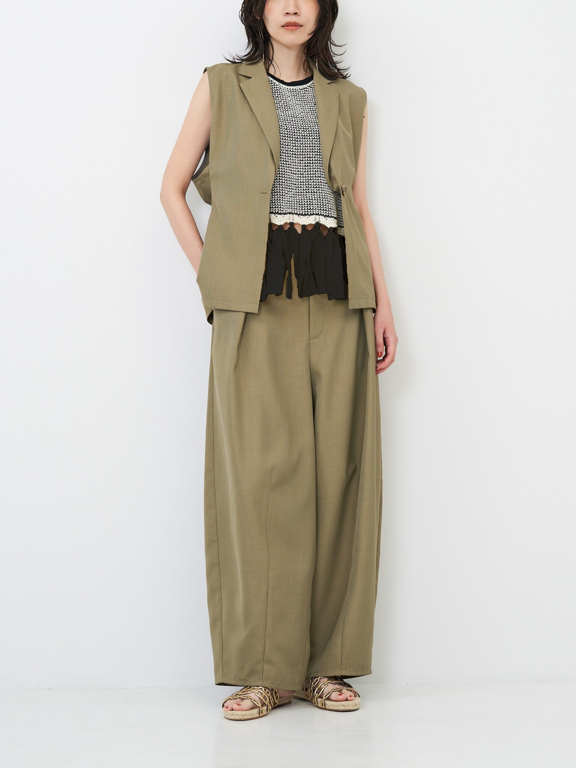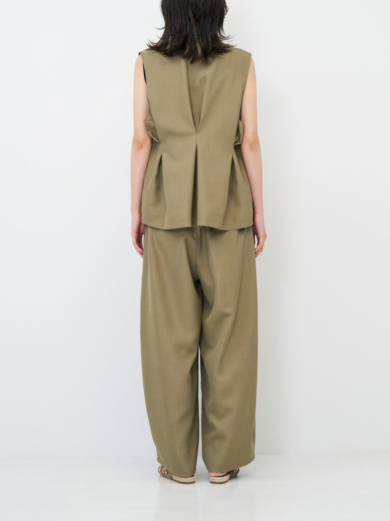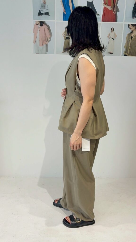 腰回りは少しだけ丸みのあるシルエットに。構築的なシルエットを麻ライクな素材感でつくることで、キレイ目過ぎない、やわらなか表情を引き出しています。