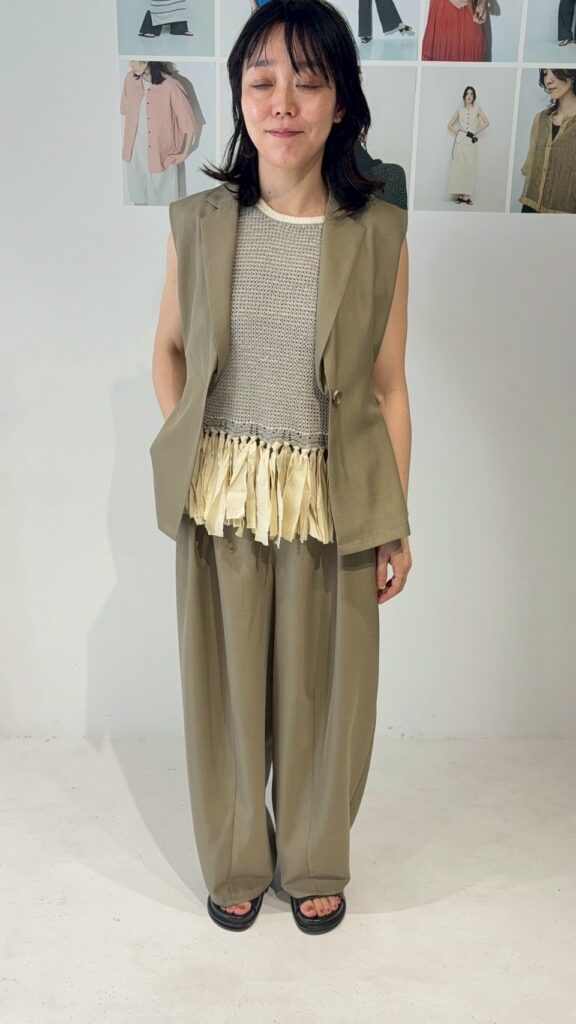 同素材のコクーンパンツとセットアップで着用することで、より視覚的にもスタイルアップ効果が高いスタイリングを楽しめます。