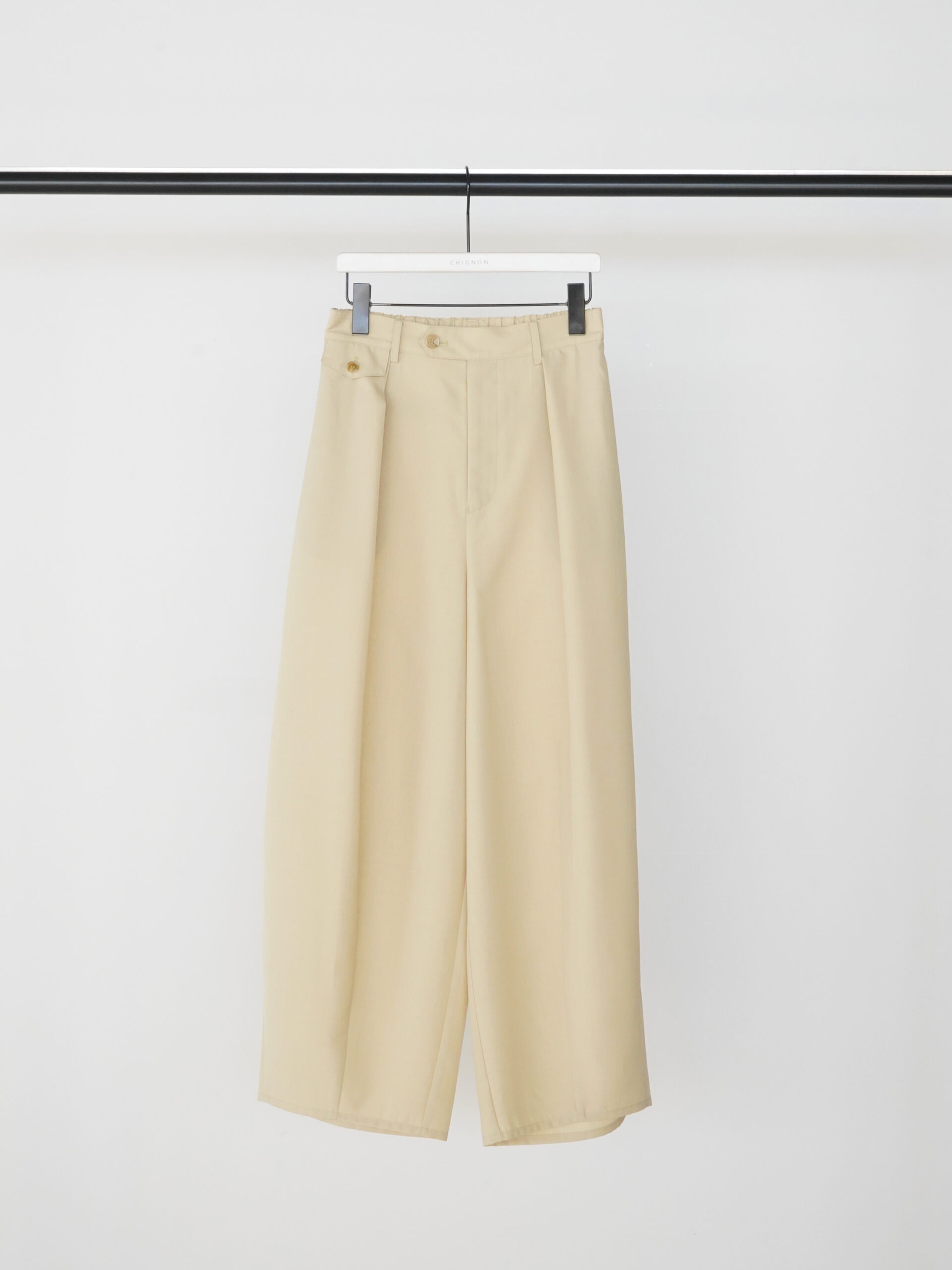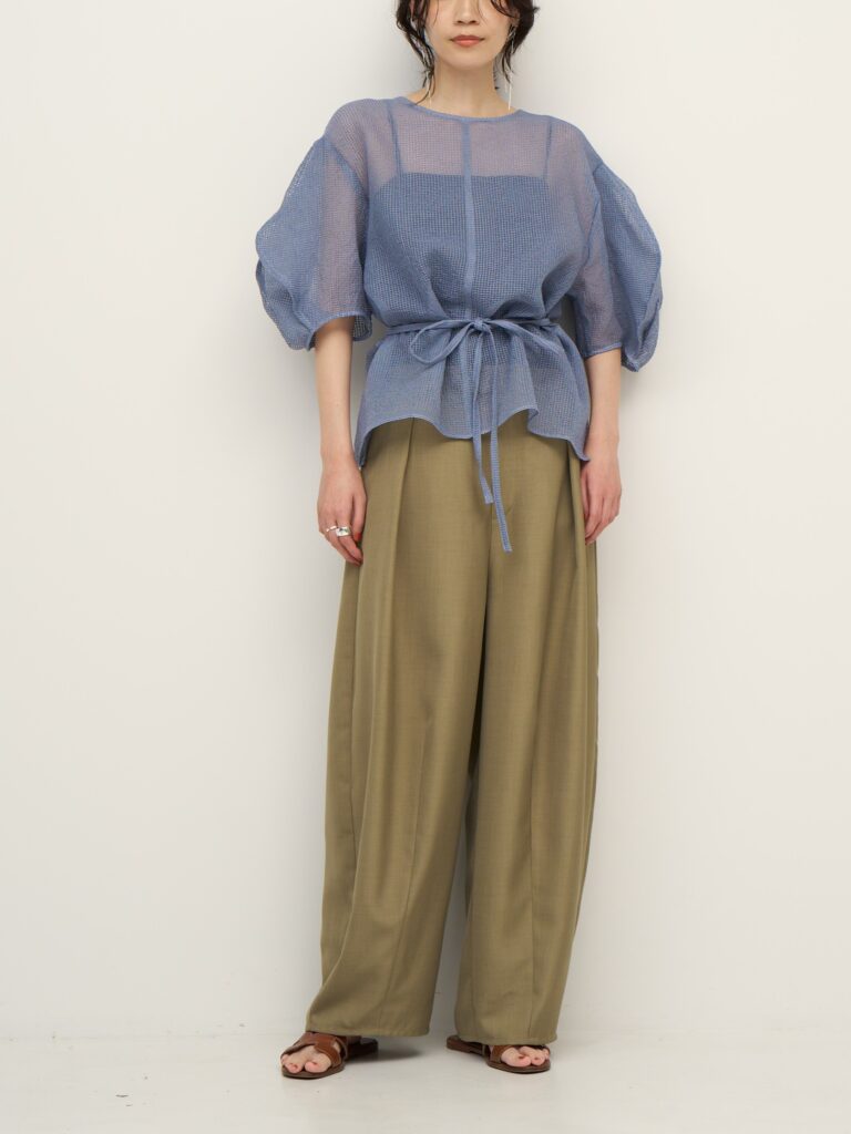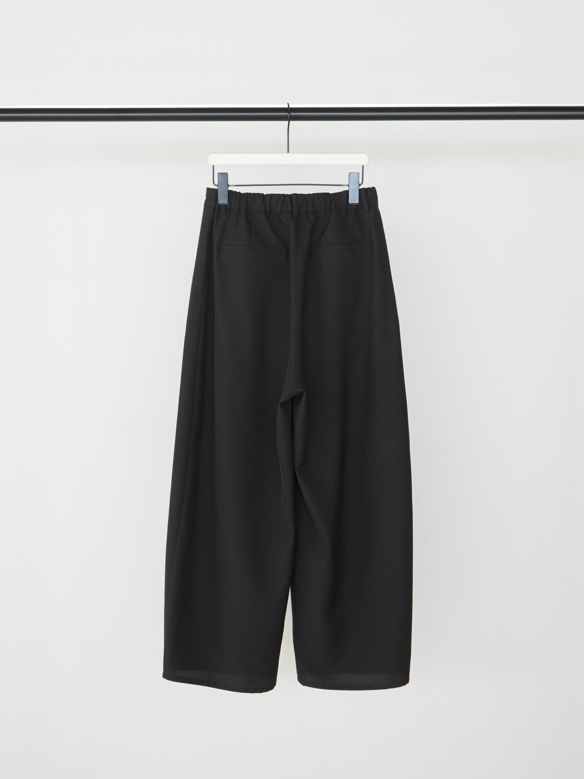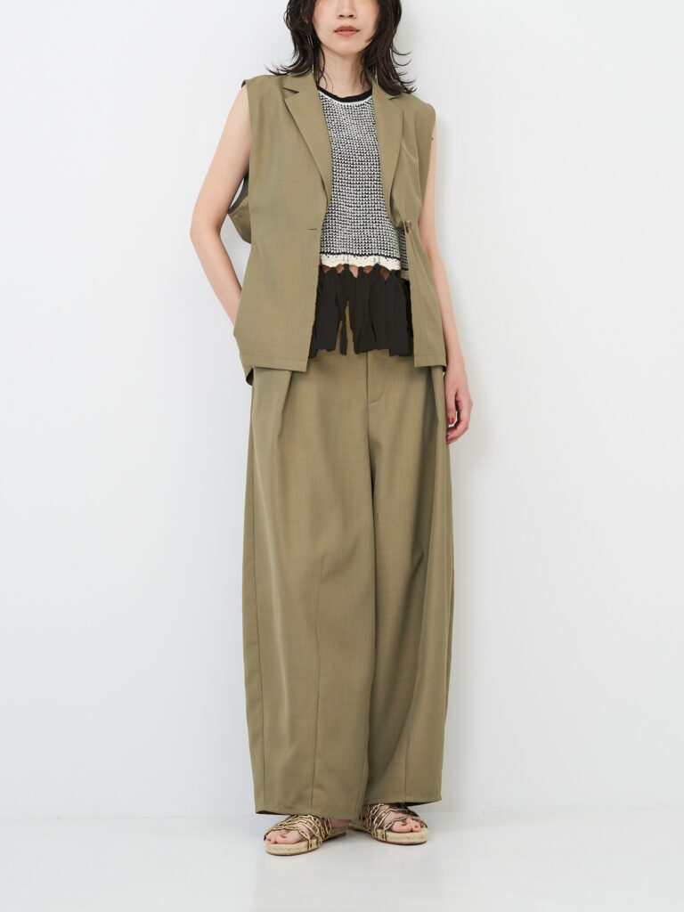 程よいハリのある素材なのでキレイなコクーンシルエットに。後より前側に分量感を多く設定し、ボリュームを感じながらもスッキリとしたラインで、コーディネートしやすいボトムになっています。メンズライクなスラックスをイメージしたウォッチポケットもアクセント。単品使いではもちろん、同素材のジレとセットアップでのコーディネートでモード感のあるスタイルもおススメです。