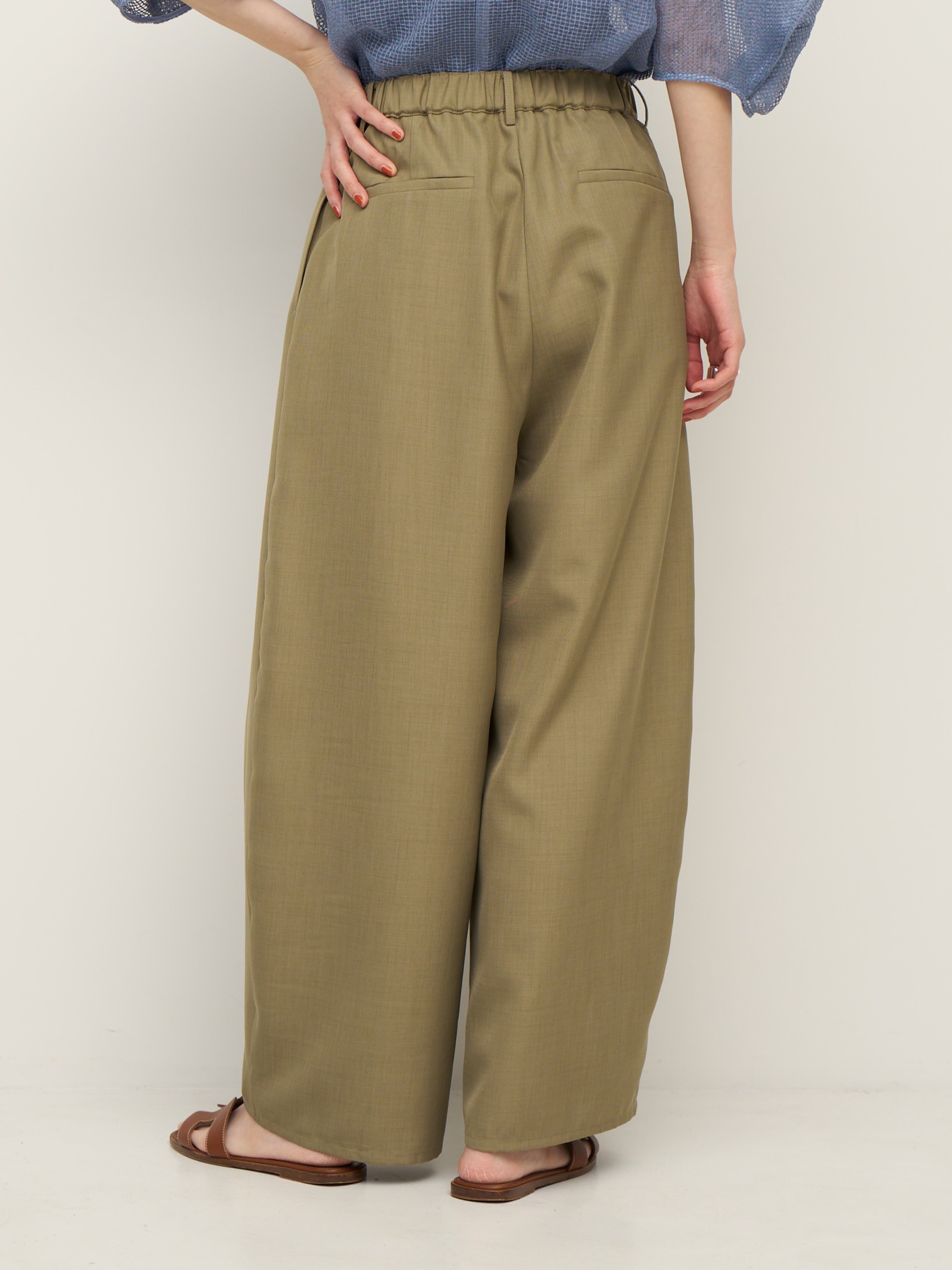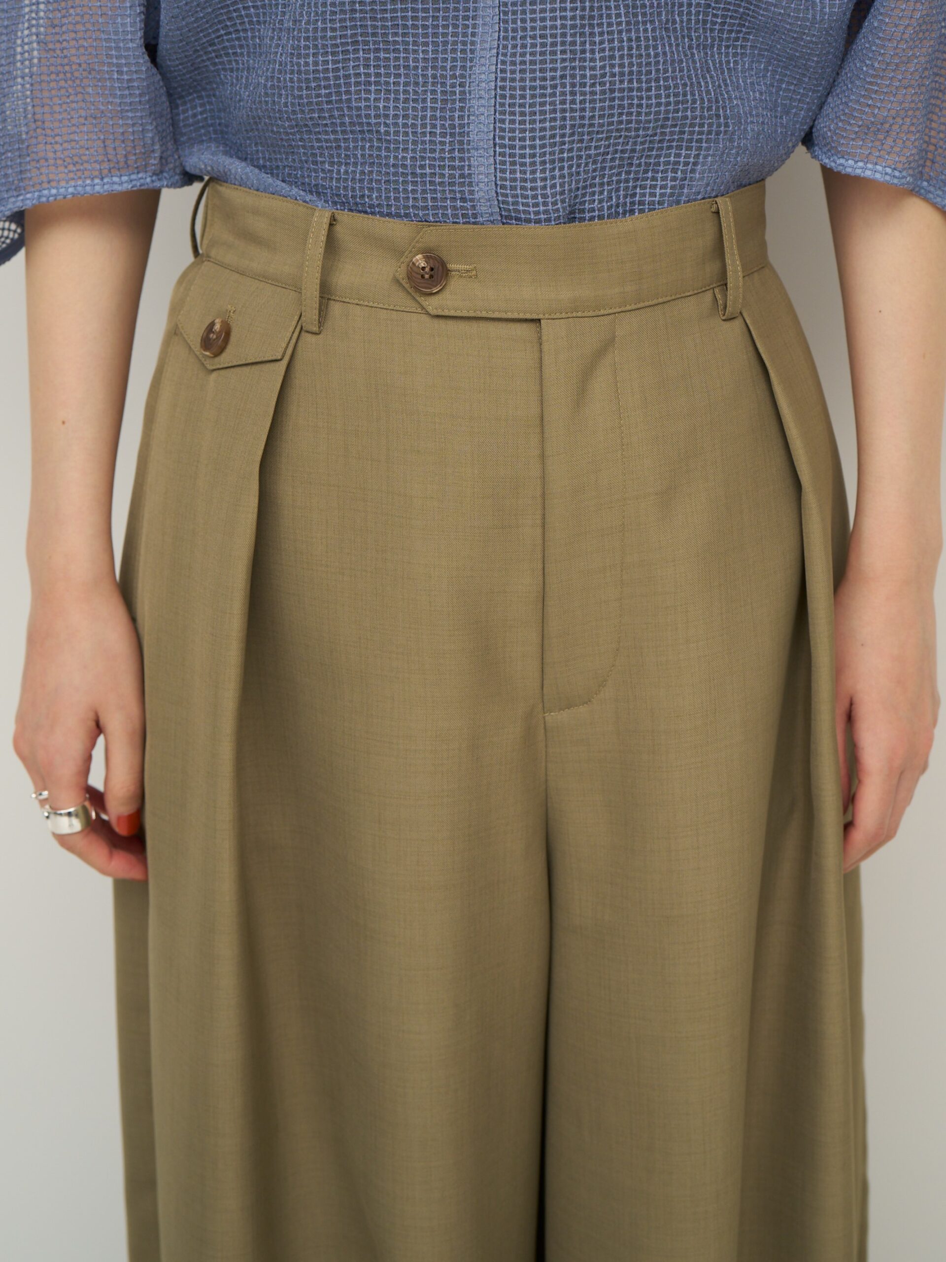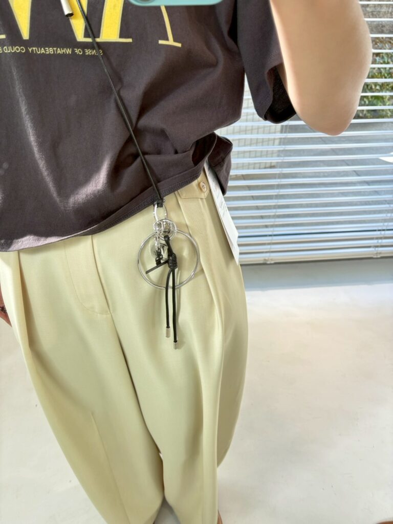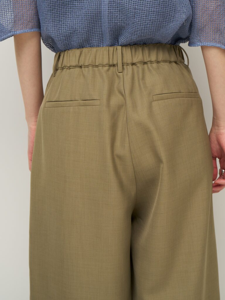 程よいハリのある素材なのでキレイなコクーンシルエットに。後より前側に分量感を多く設定し、ボリュームを感じながらもスッキリとしたラインで、コーディネートしやすいボトムになっています。メンズライクなスラックスをイメージしたウォッチポケットもアクセント。単品使いではもちろん、同素材のジレとセットアップでのコーディネートでモード感のあるスタイルもおススメです。