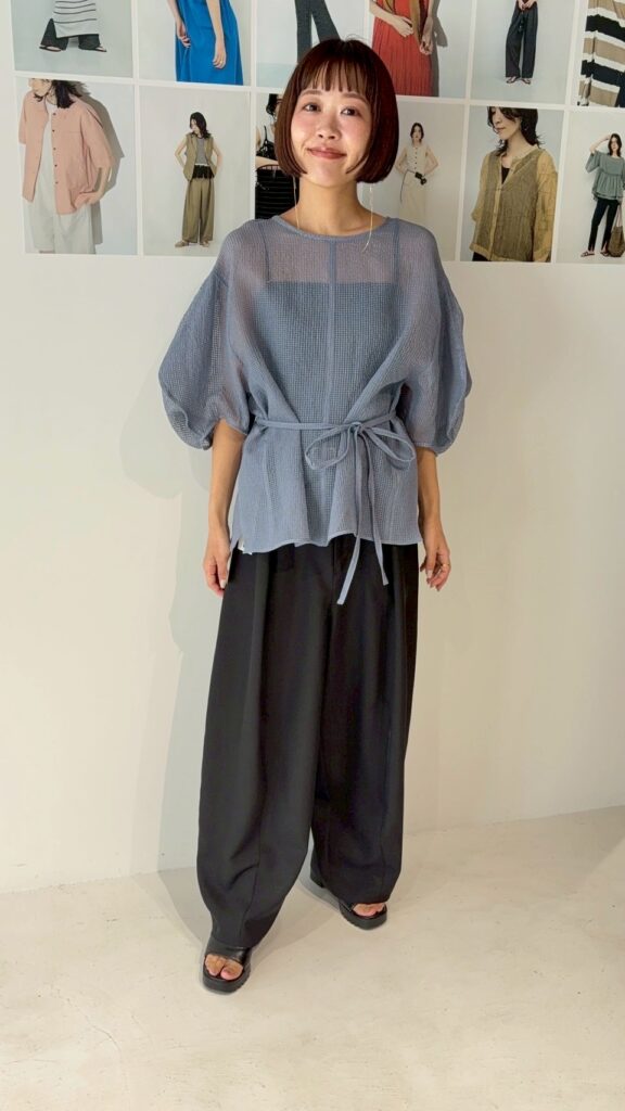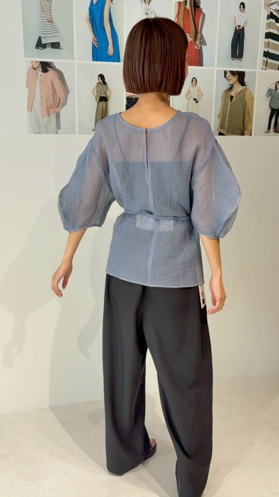 麻ライクな表情を持ちながら、シワになりにくい機能性を合わせもつ素材を使用。強撚糸調ならではのドライタッチと肌離れの良さで、盛夏でも快適な着用感を実現しています。