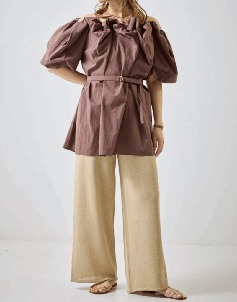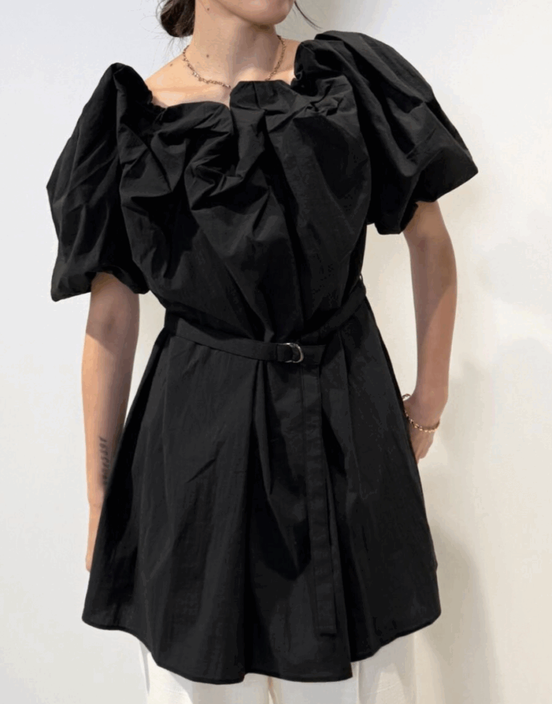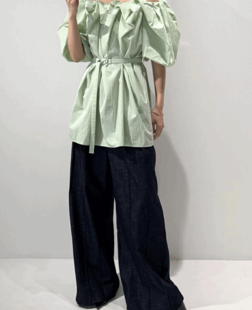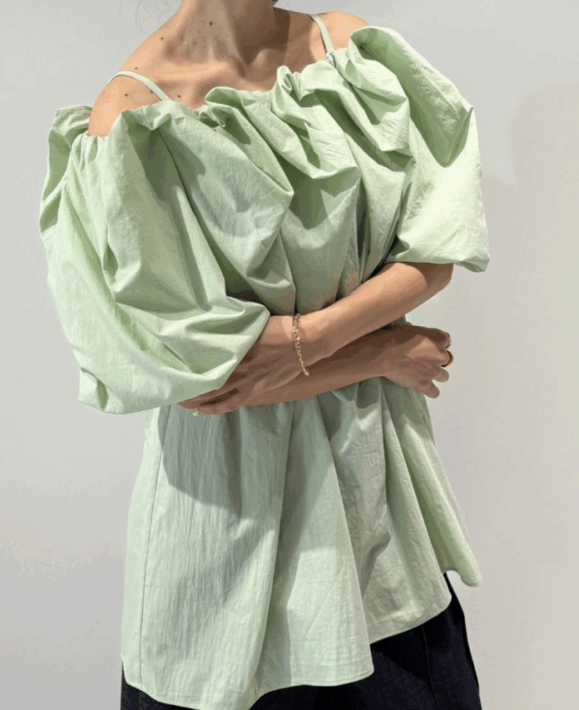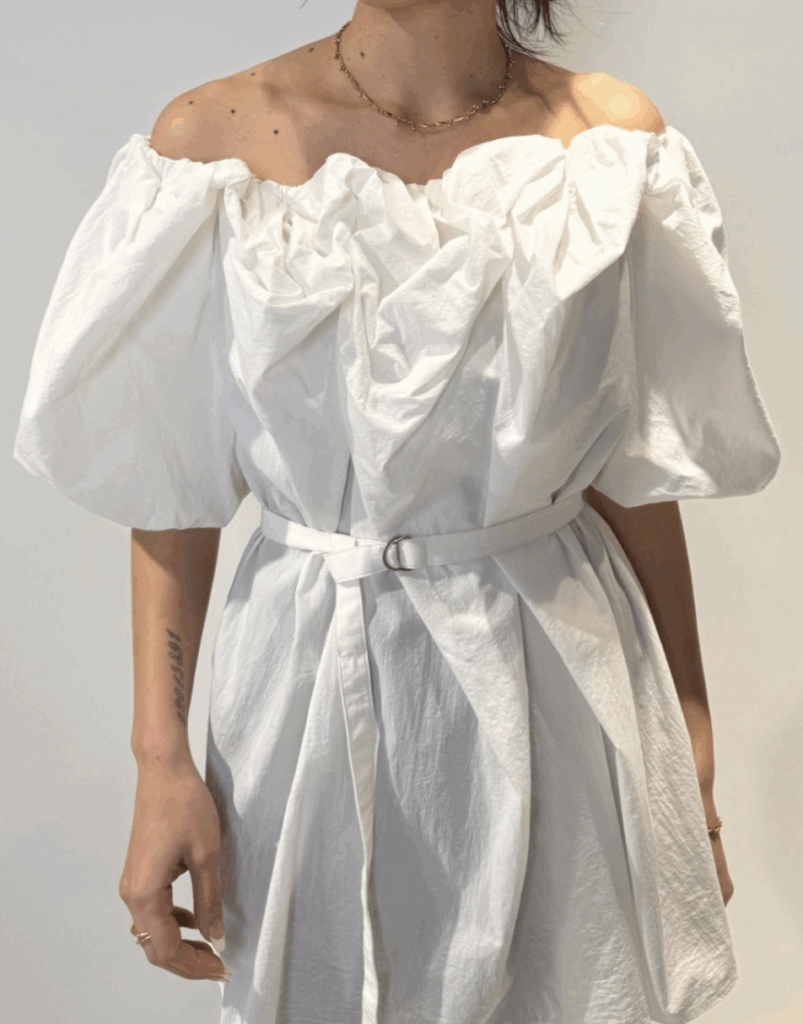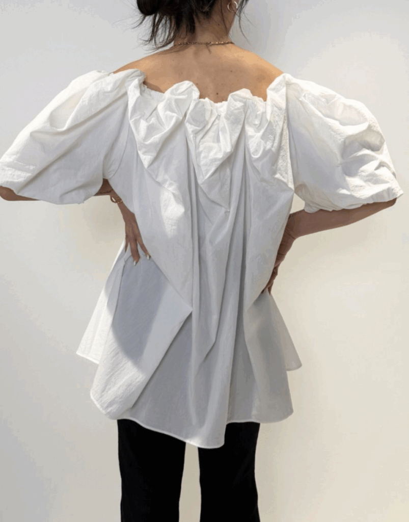 ゴム入りの仕様で、オフショルとしても、肩を出さないボートネックとしても着用可能。