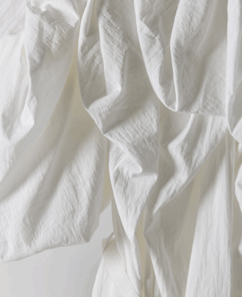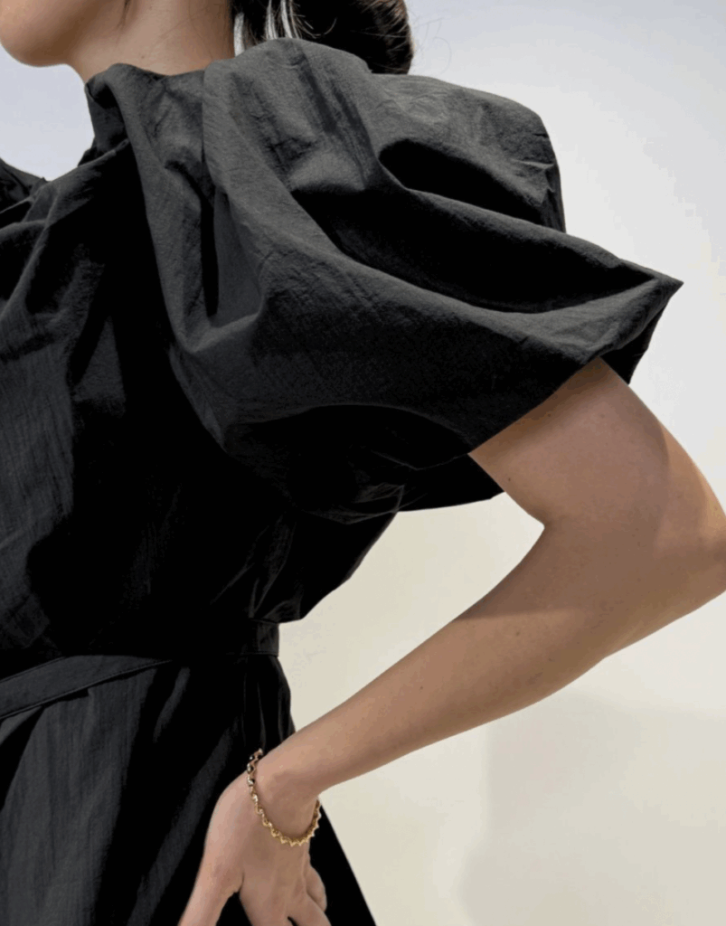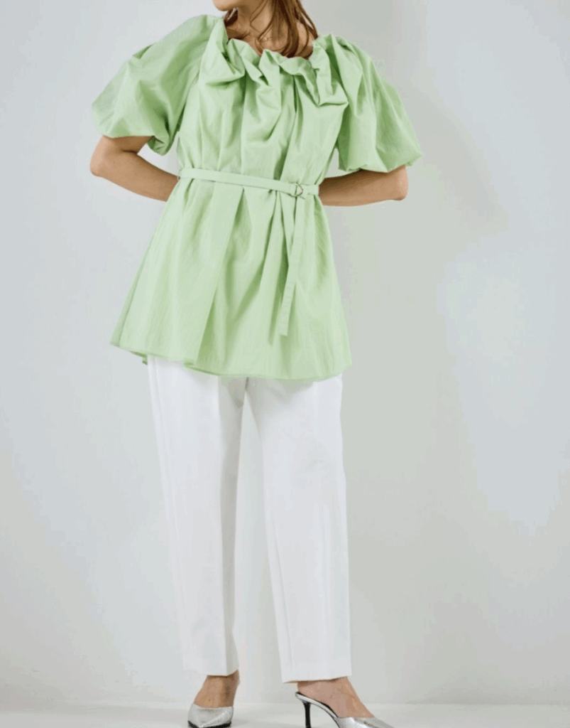 衿まわりに施した立体的なタックが、顔まわりとデコルテを華やかに演出する2WAYブラウス。