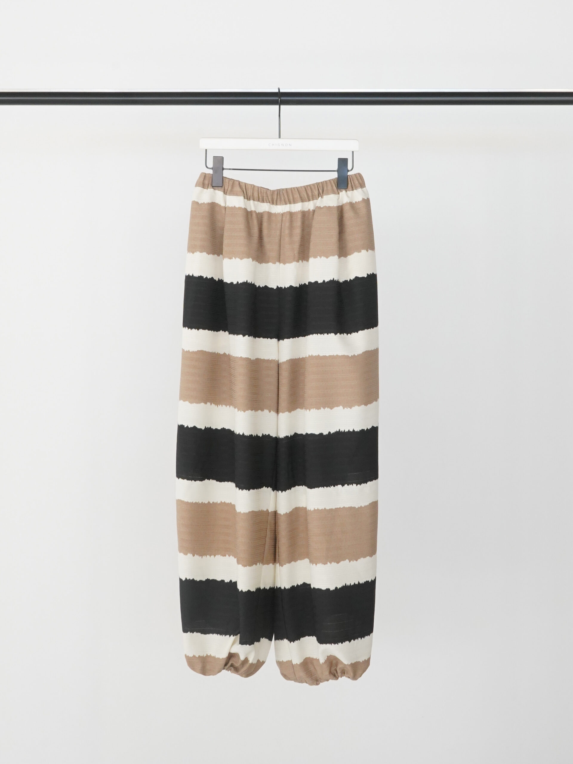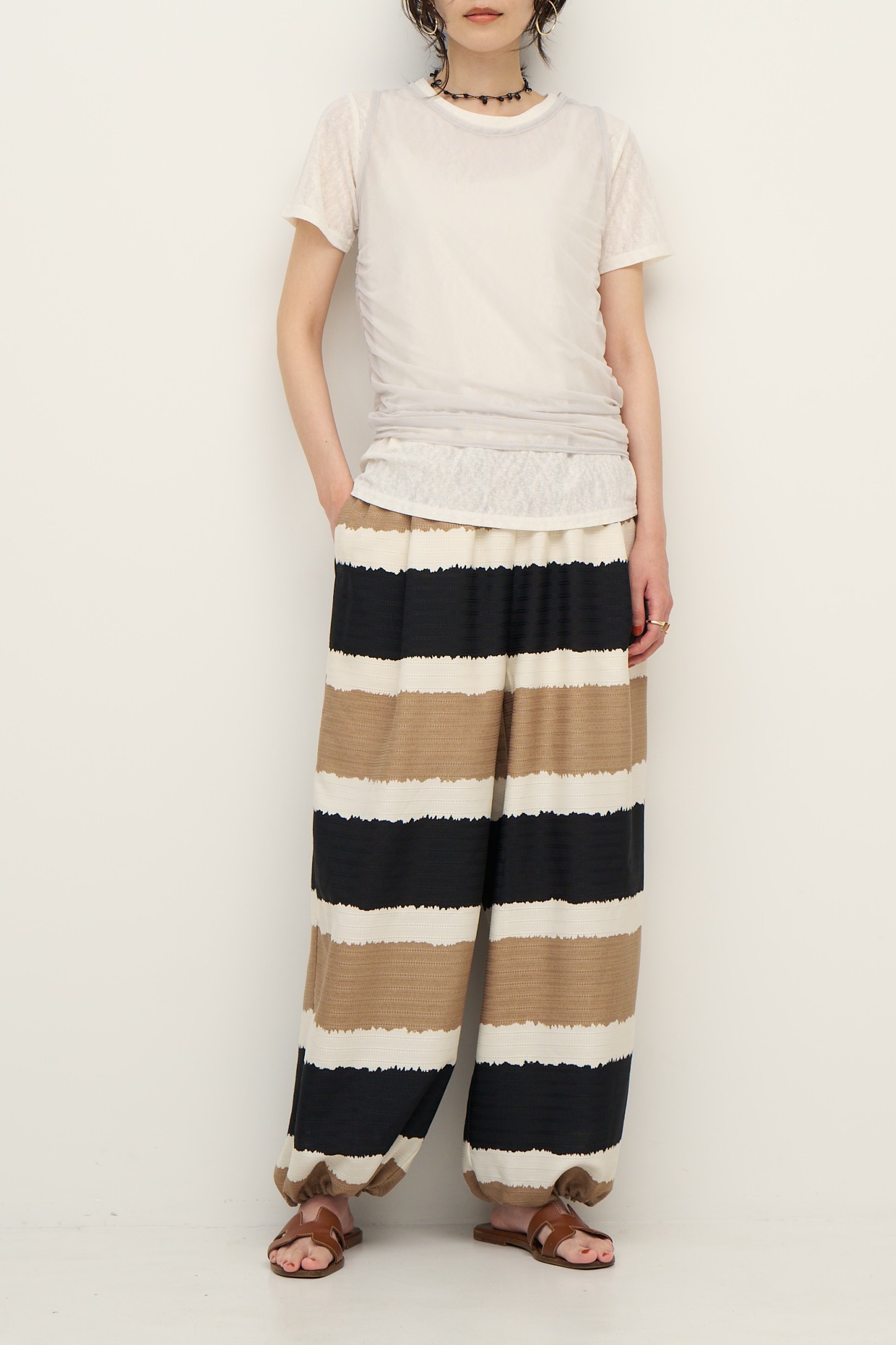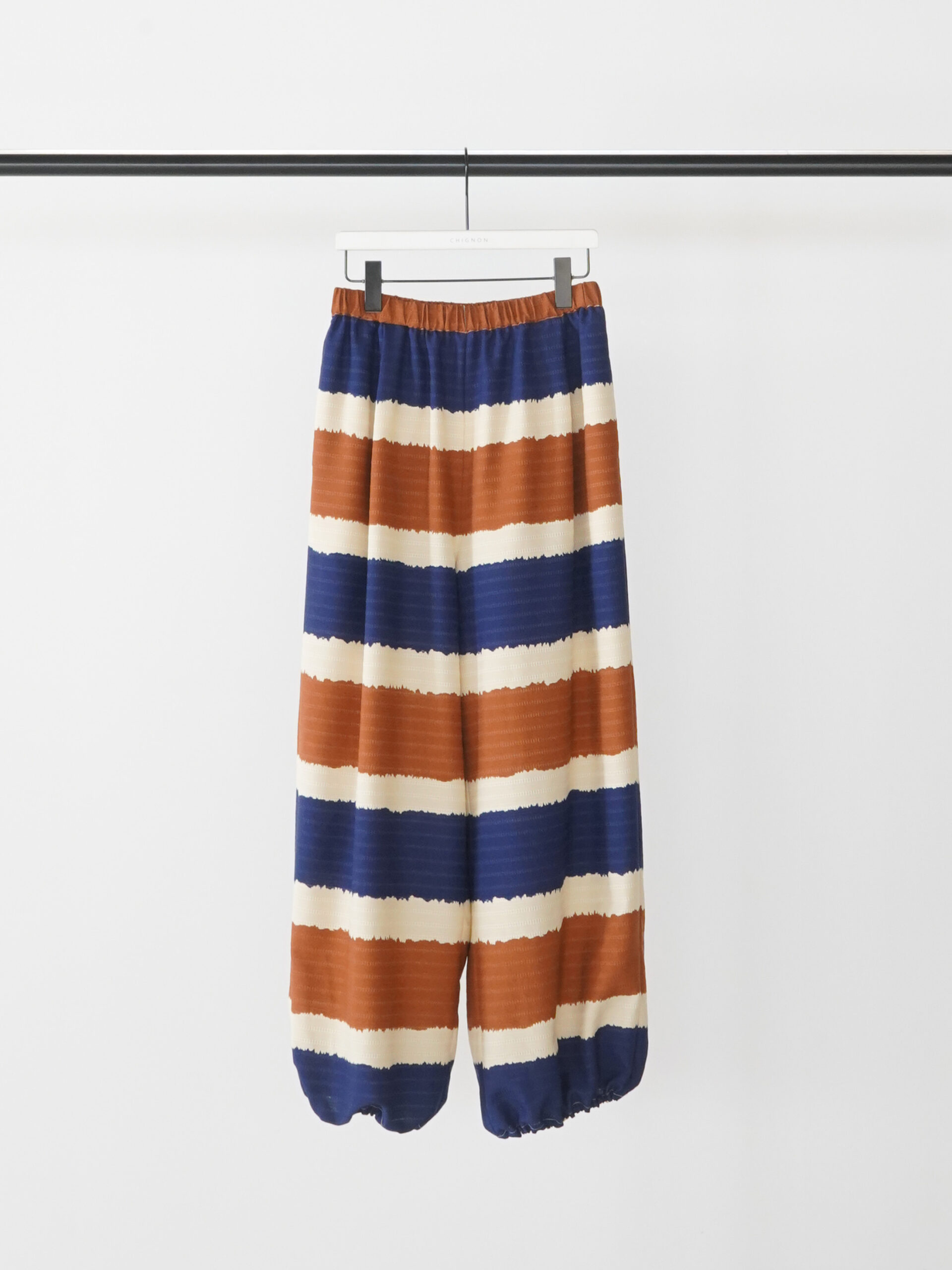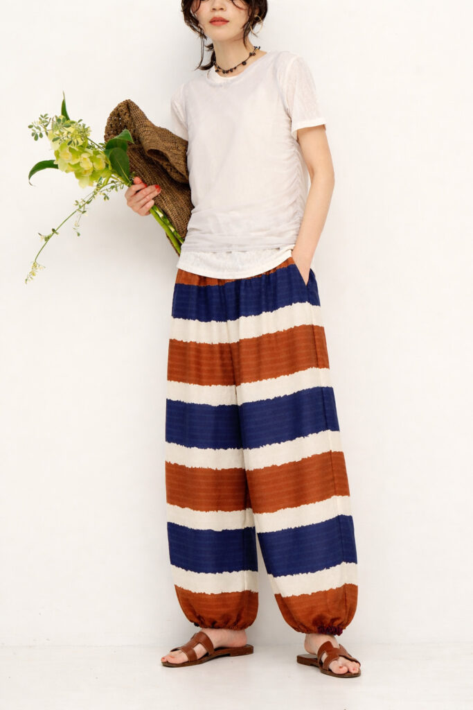 着映えするオリエンタルなボーダー柄で作った、2WAYバルーンパンツ。