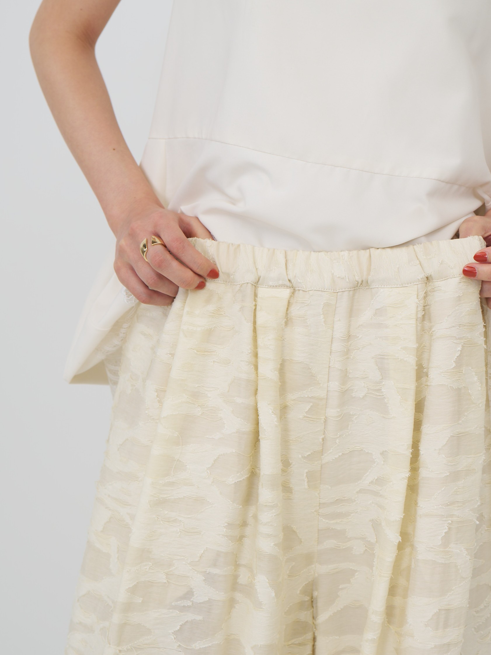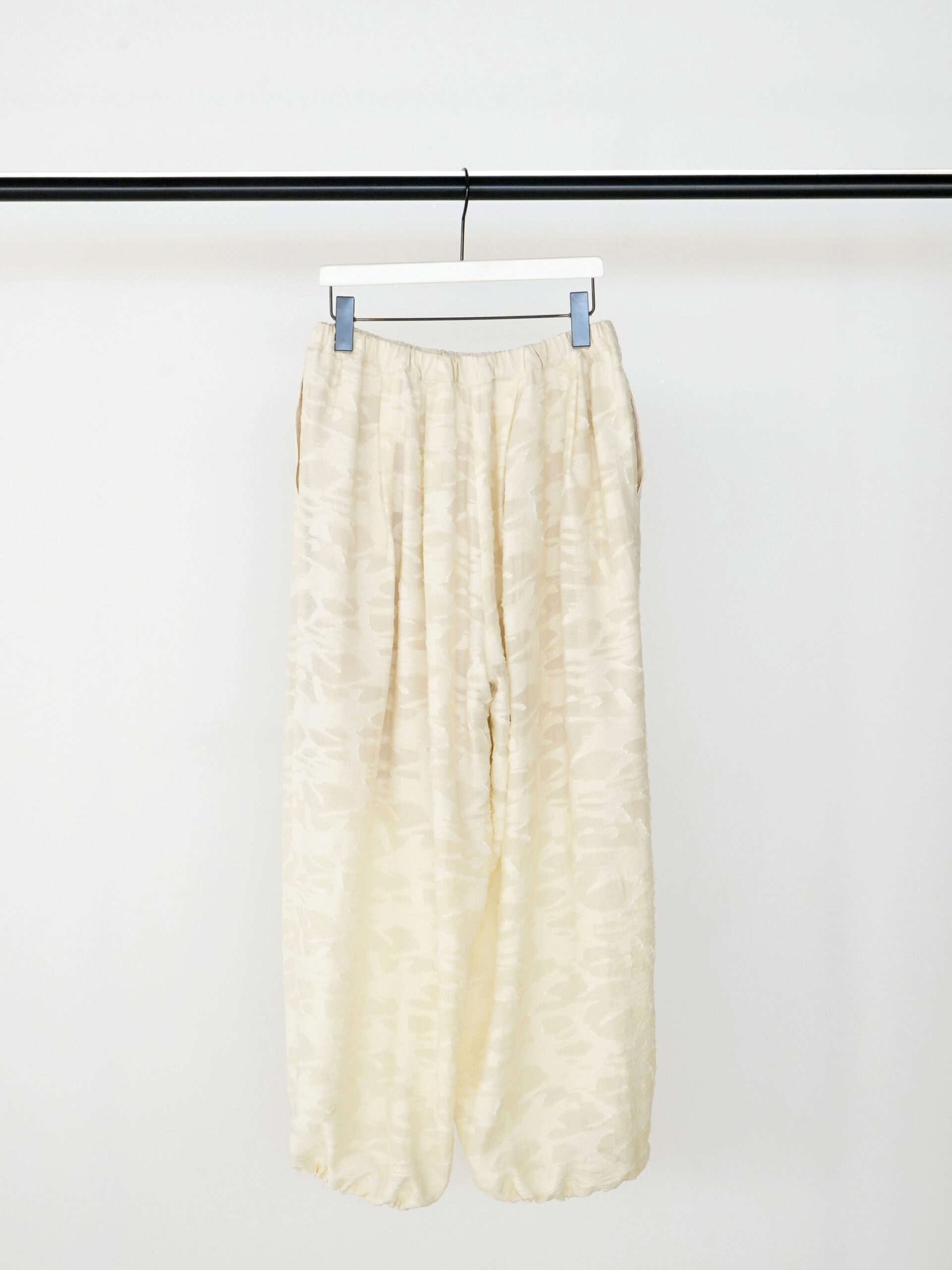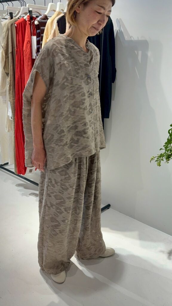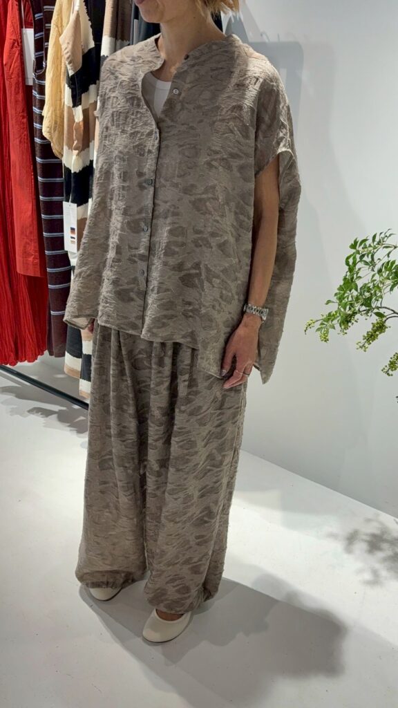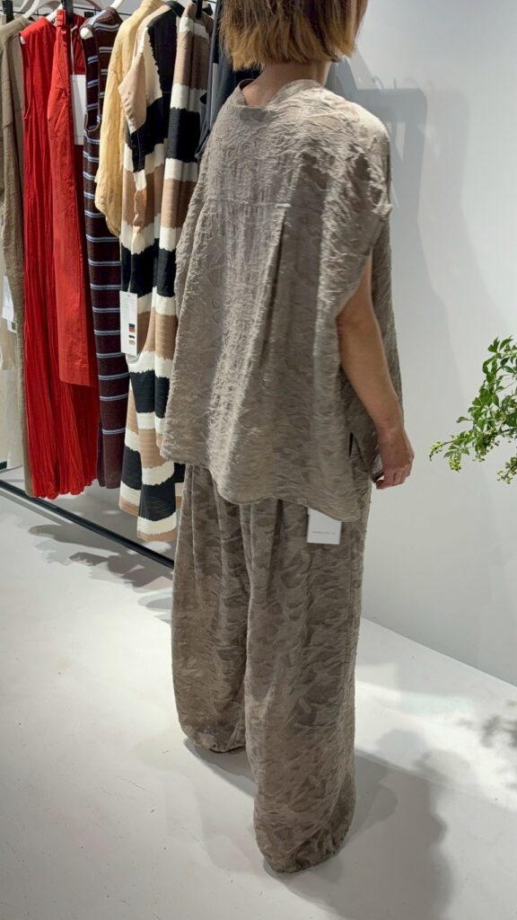 今季のトレンドアイテムのバルーンパンツを意匠生地で提案。横畝に太い糸を走らせた、表情豊かなカットジャカードを使用しました。一目でわかる凹凸感と陰影は、クラフト感がありつつ、どこかモードな雰囲気も漂わせる高級感を併せ持った素材です。