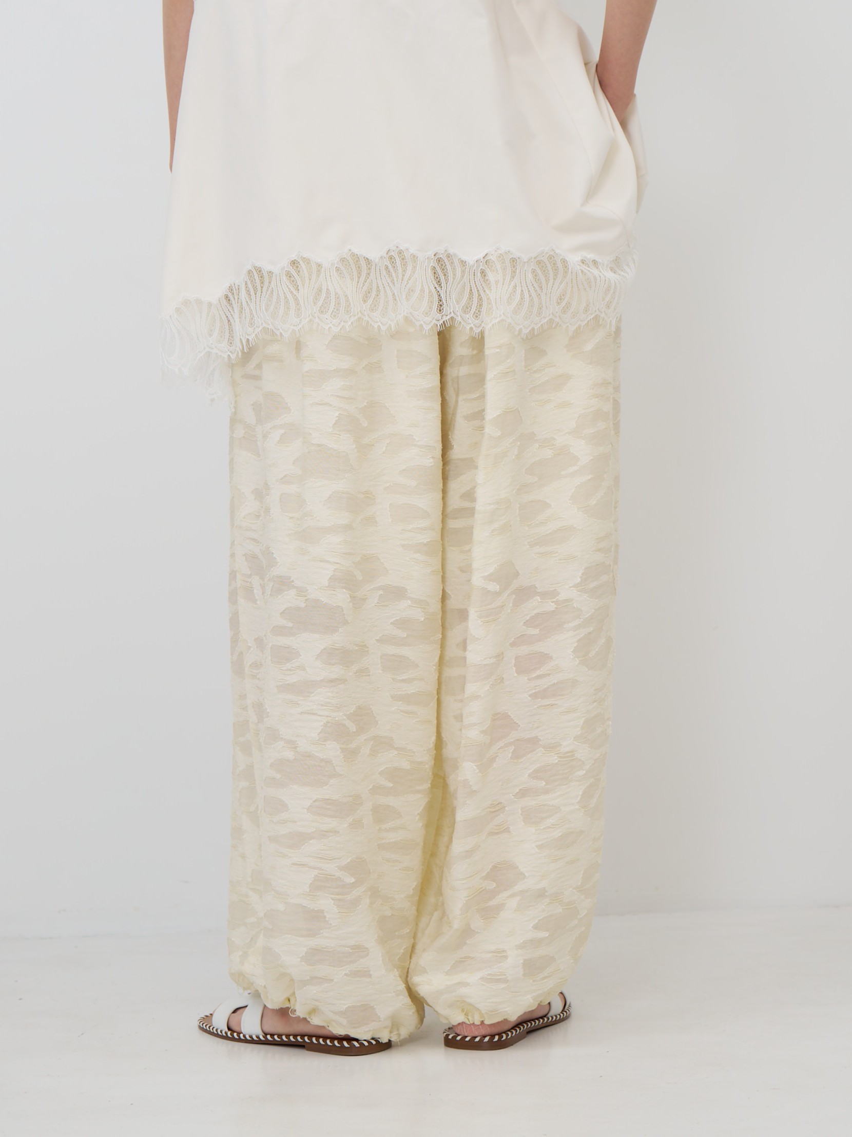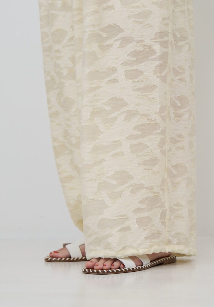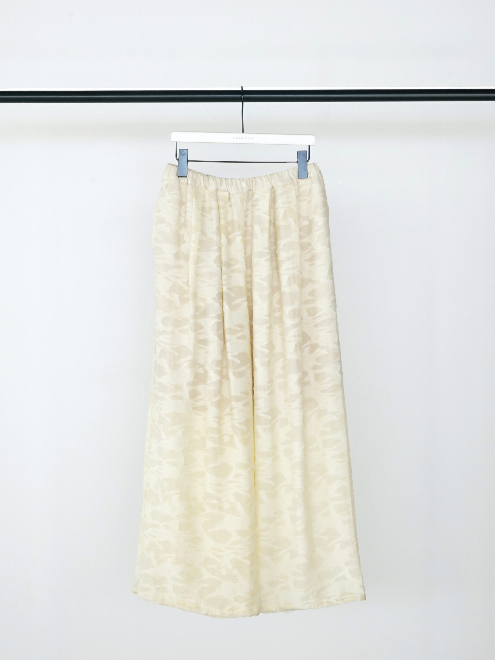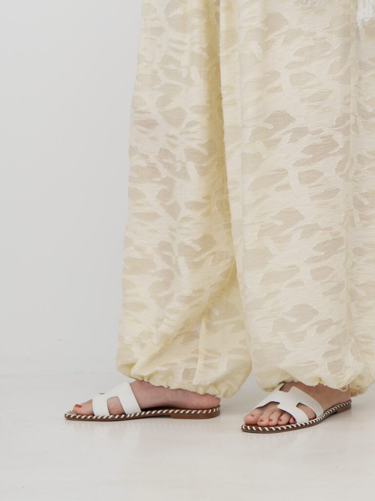 今季のトレンドアイテムのバルーンパンツを意匠生地で提案。横畝に太い糸を走らせた、表情豊かなカットジャカードを使用しました。一目でわかる凹凸感と陰影は、クラフト感がありつつ、どこかモードな雰囲気も漂わせる高級感を併せ持った素材です。