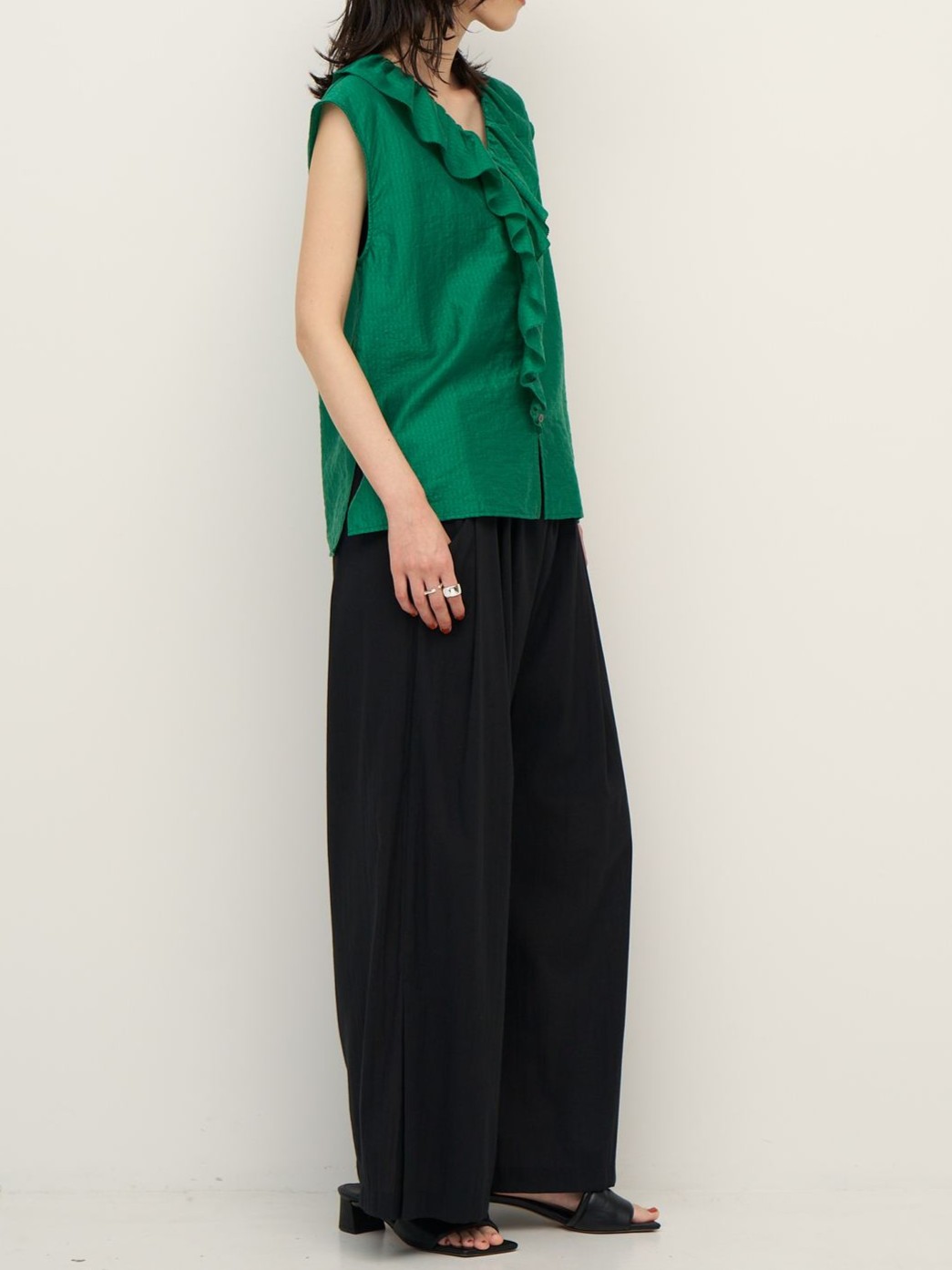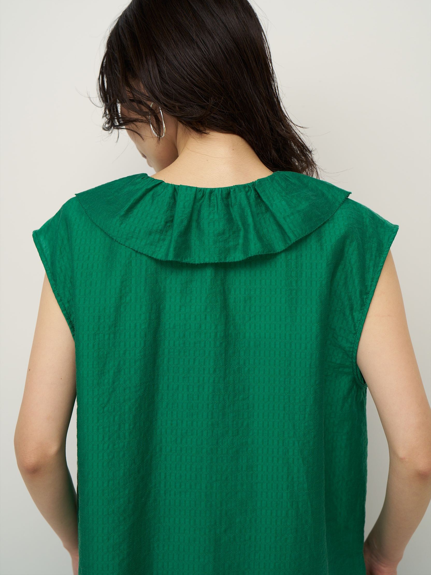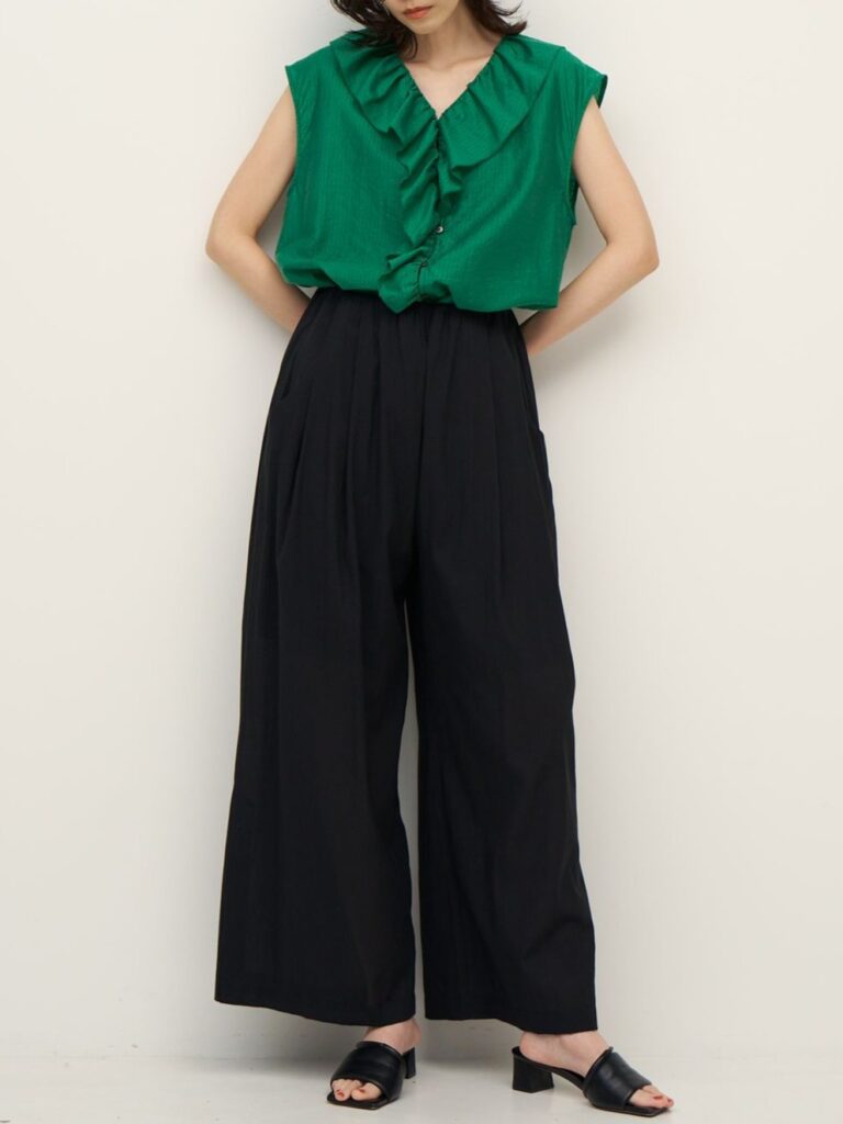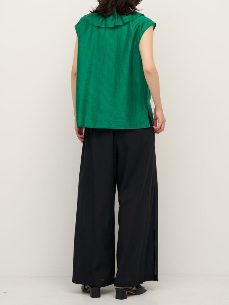 フリルは甘くなりすぎないようバランスにこだわり、大人の方でも取り入れやすいデザインに。フリルの端はピコミシンで仕上げ、さりげない華奢さをプラスしています。
