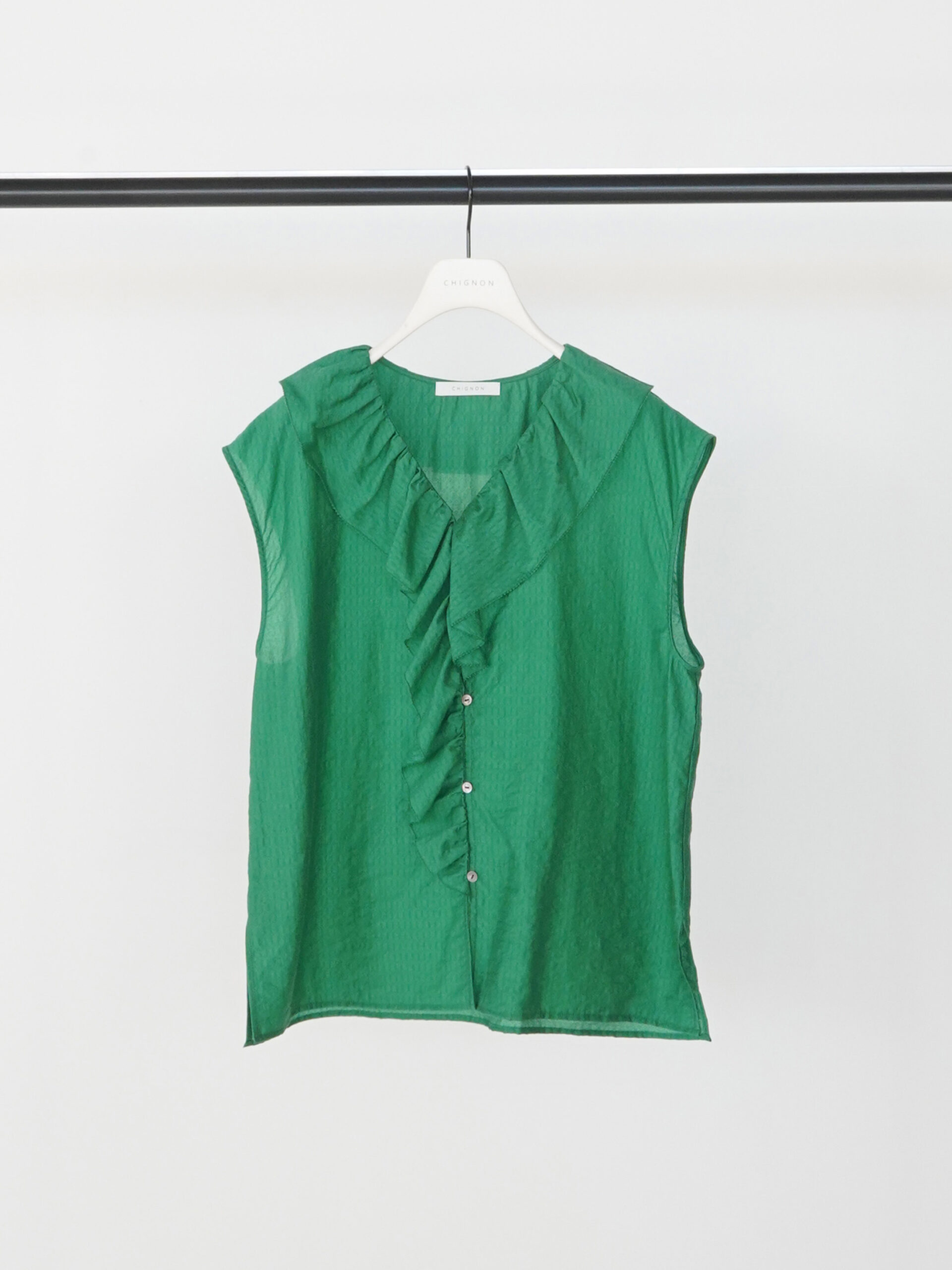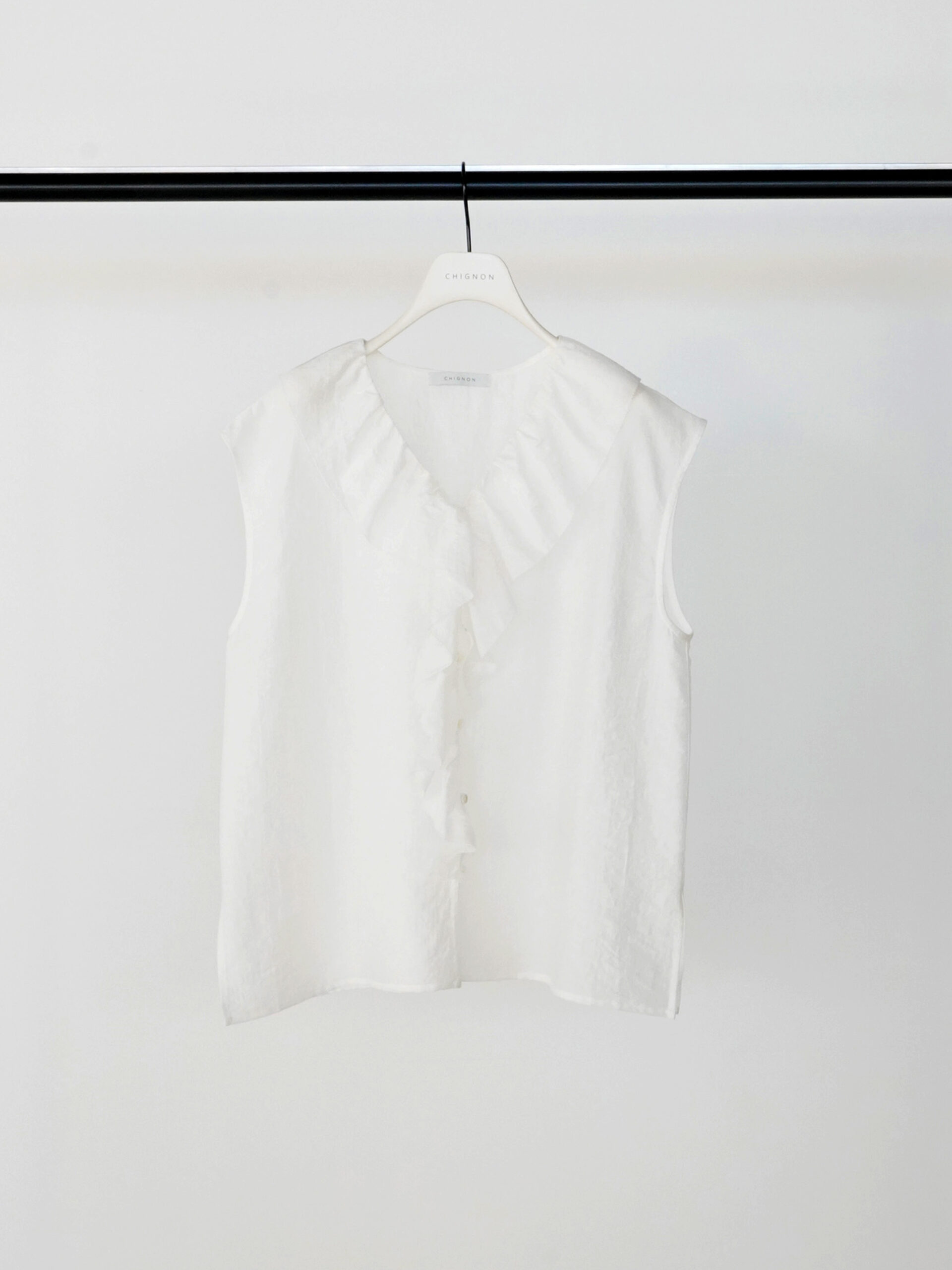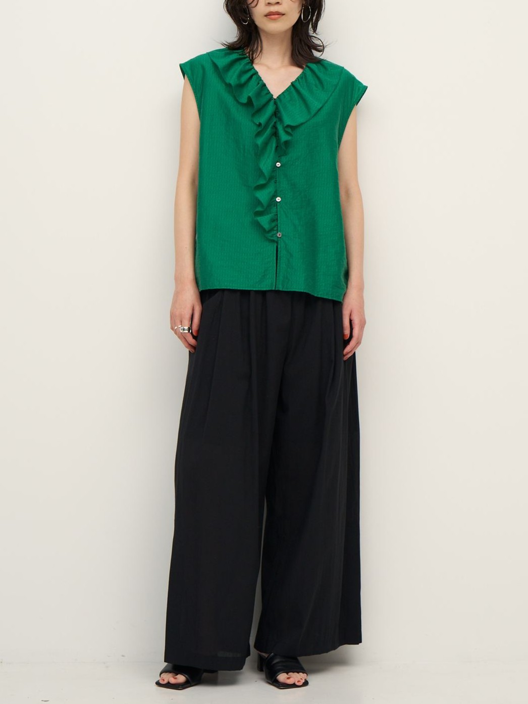 フリルは甘くなりすぎないようバランスにこだわり、大人の方でも取り入れやすいデザインに。フリルの端はピコミシンで仕上げ、さりげない華奢さをプラスしています。