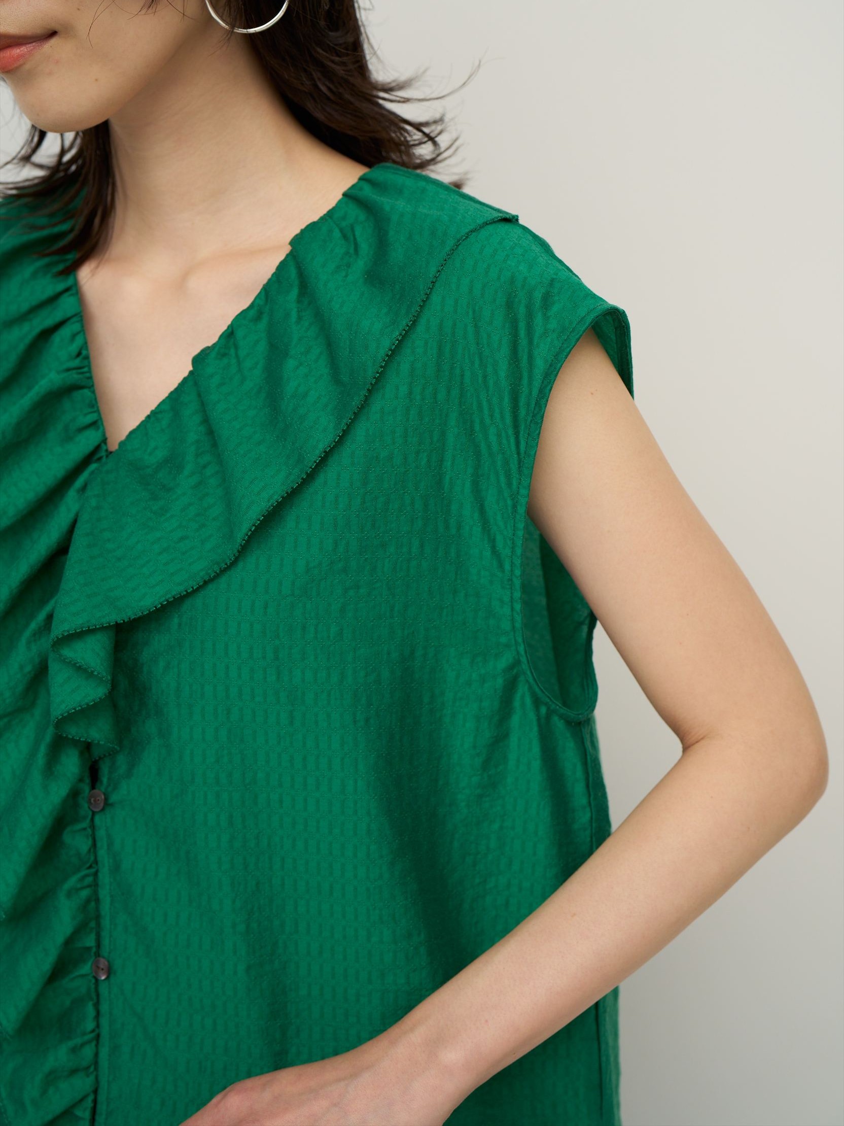 フロントはボタン開きの仕様なので、ブラウスとしてはもちろん、軽い羽織りとしても活躍。様々な着こなしを楽しめる、幅広く使えるアイテムです。