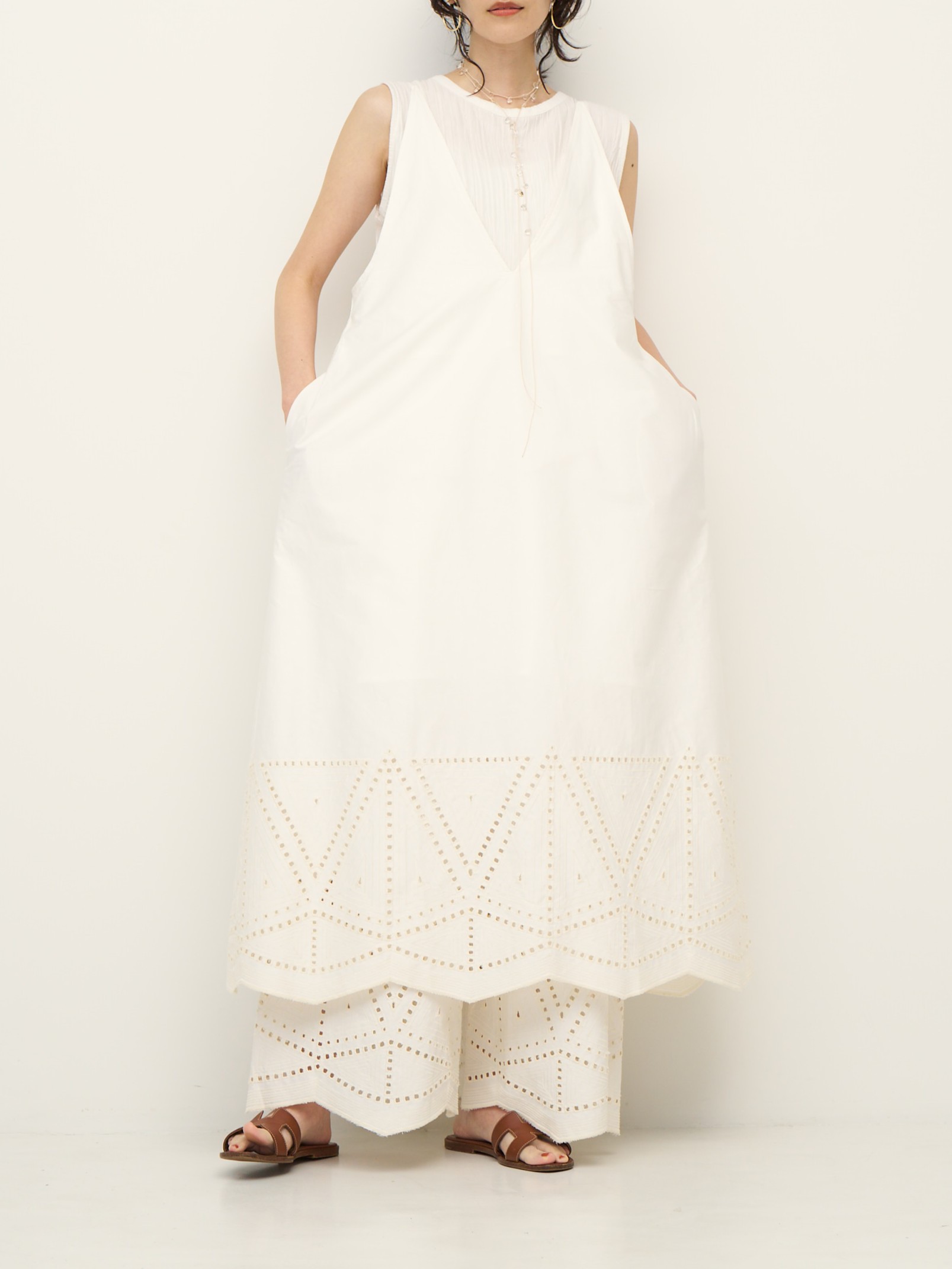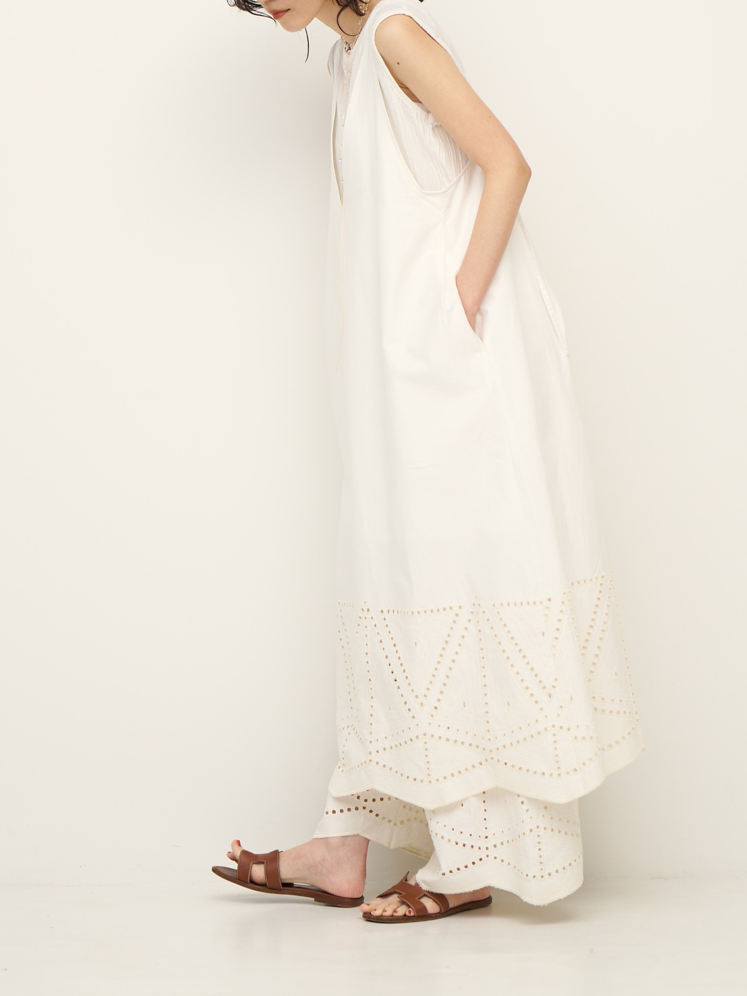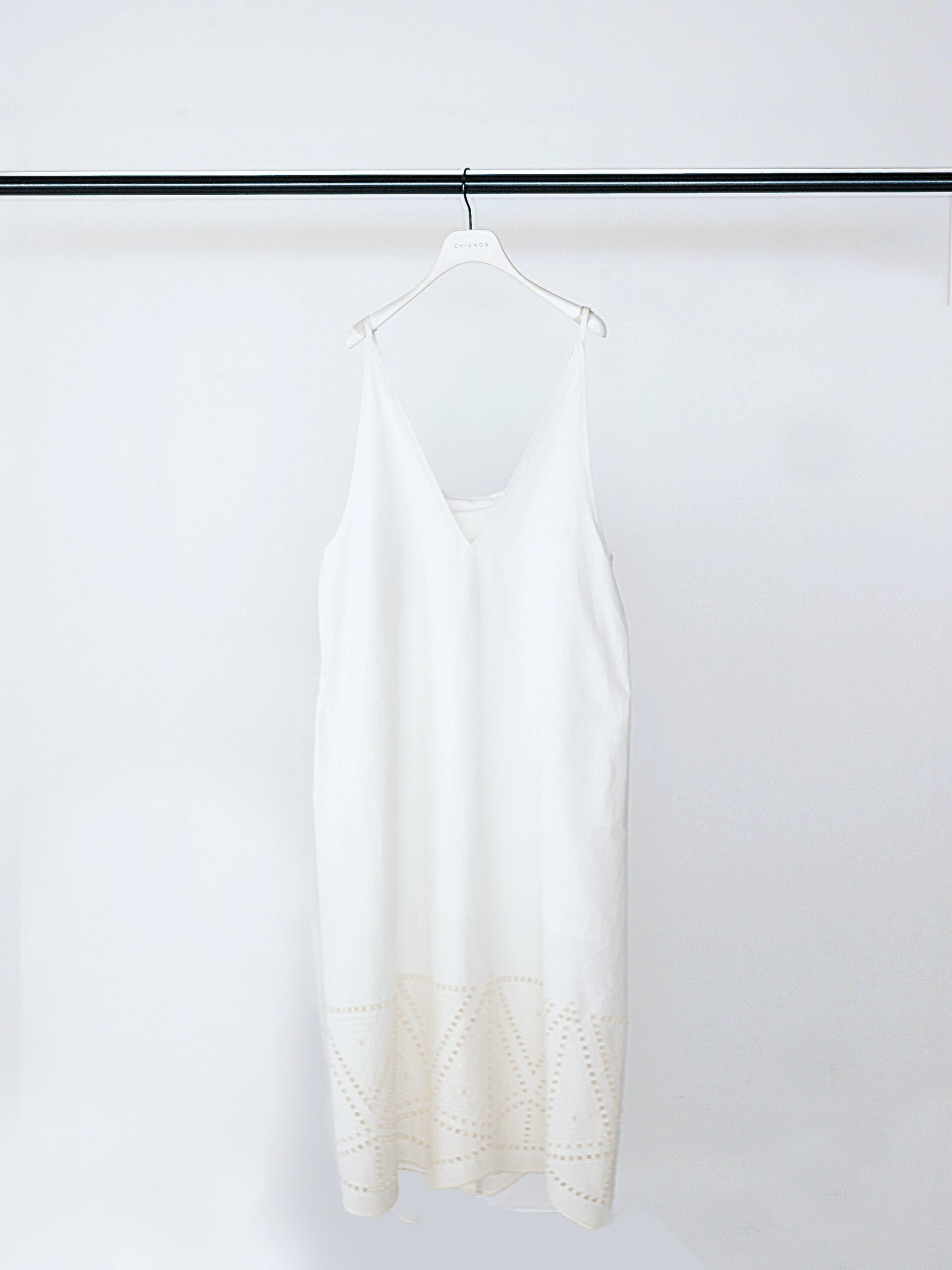 裾に施されたカットワーク刺繍が印象的なキャミソールワンピース。