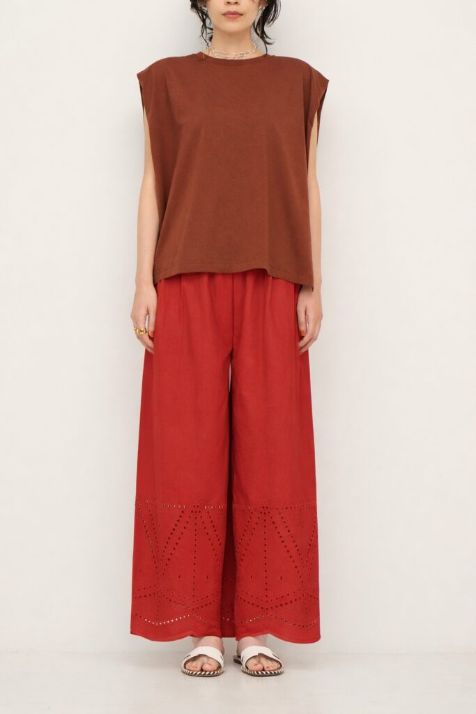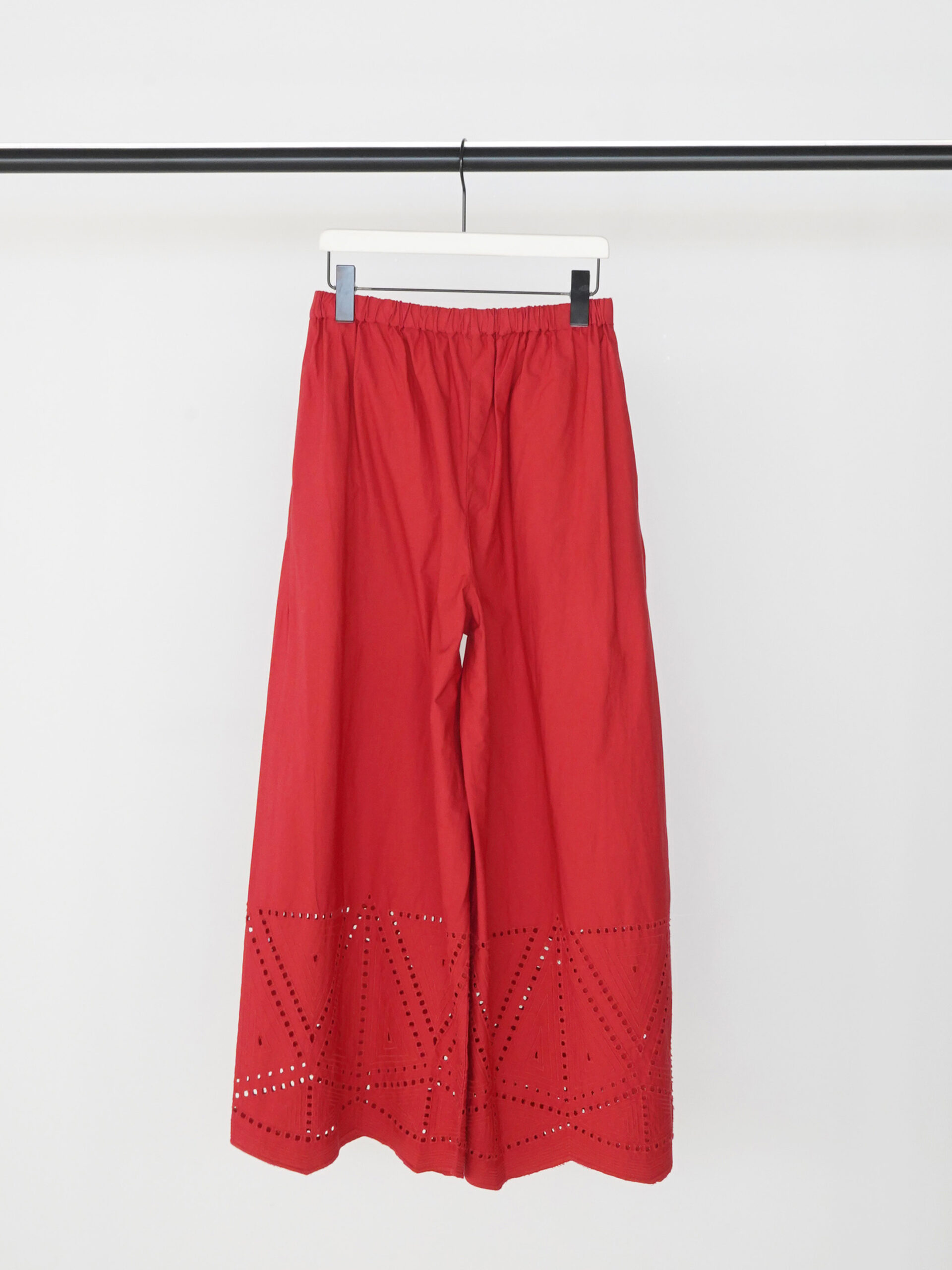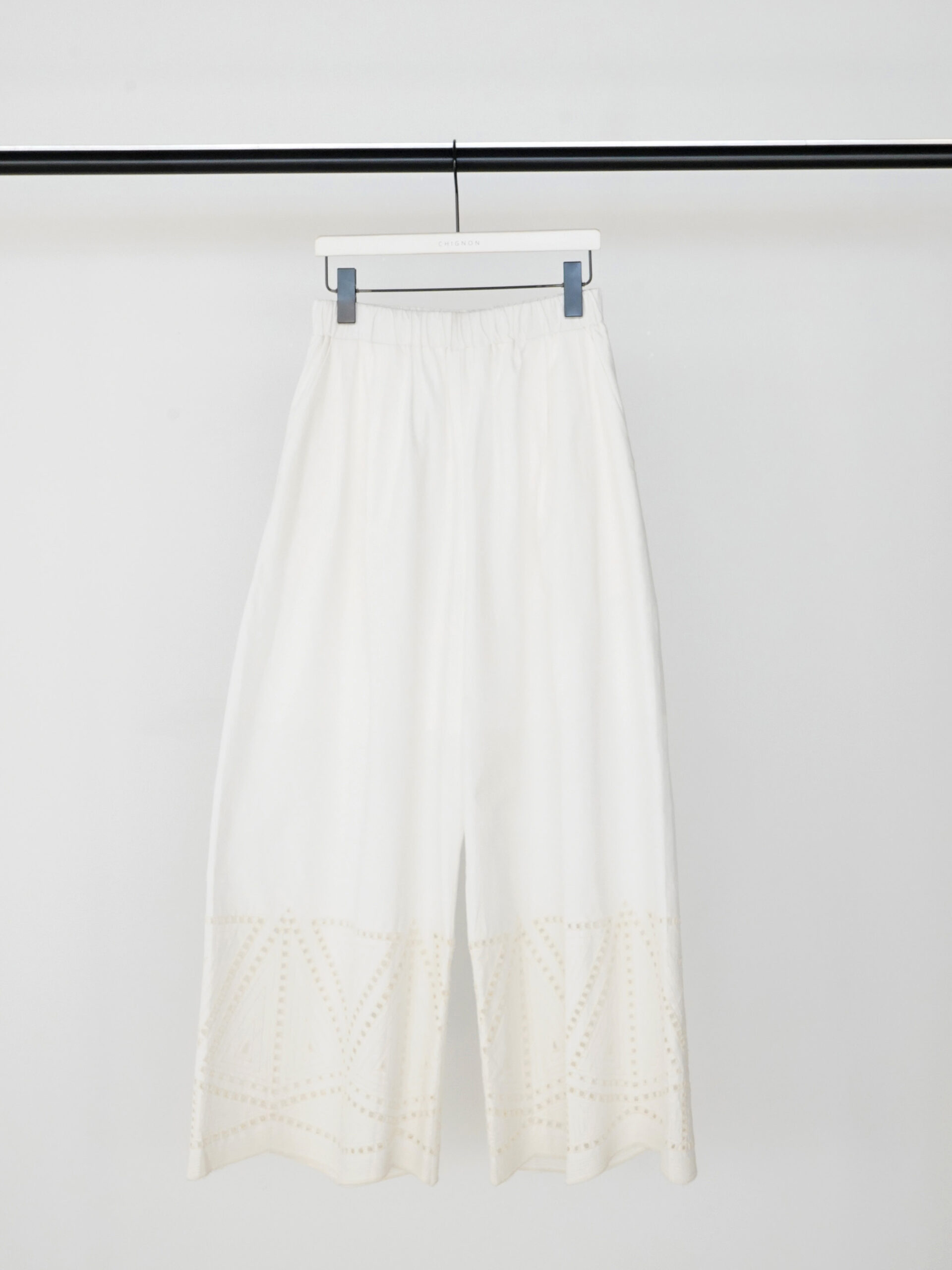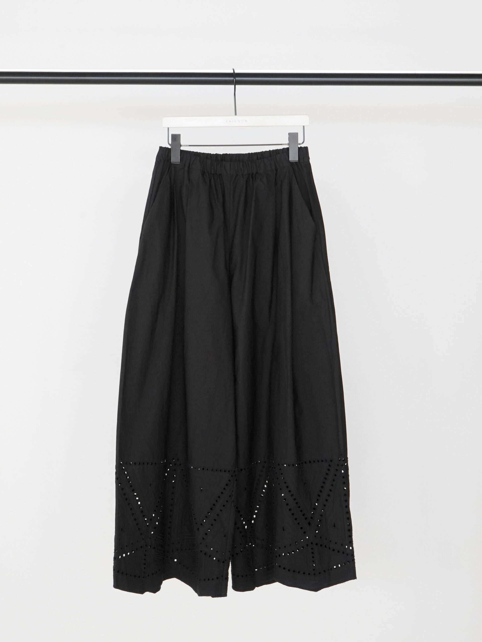 裾に施されたカットワーク刺繍が印象的なストレートワイドパンツです。