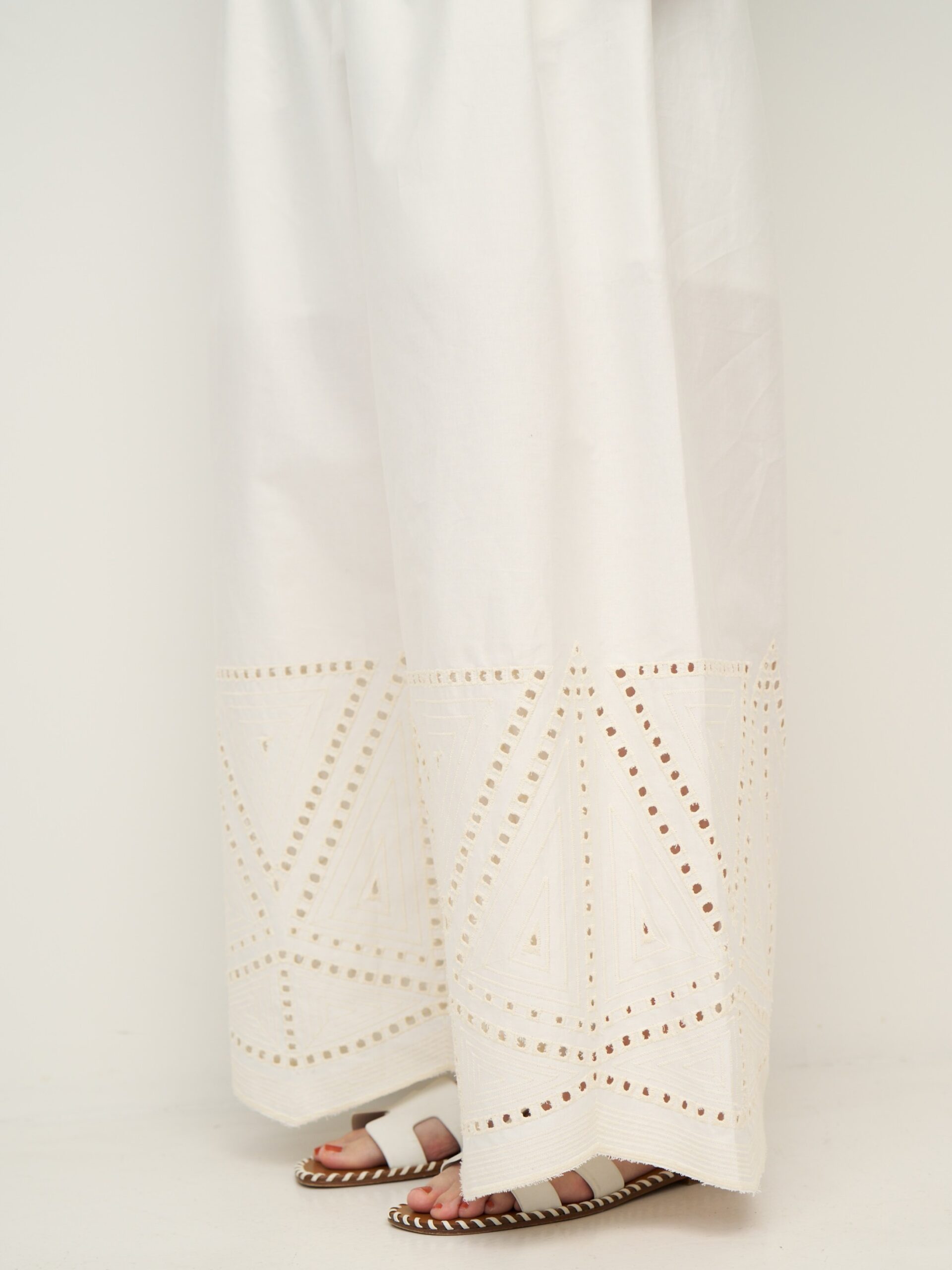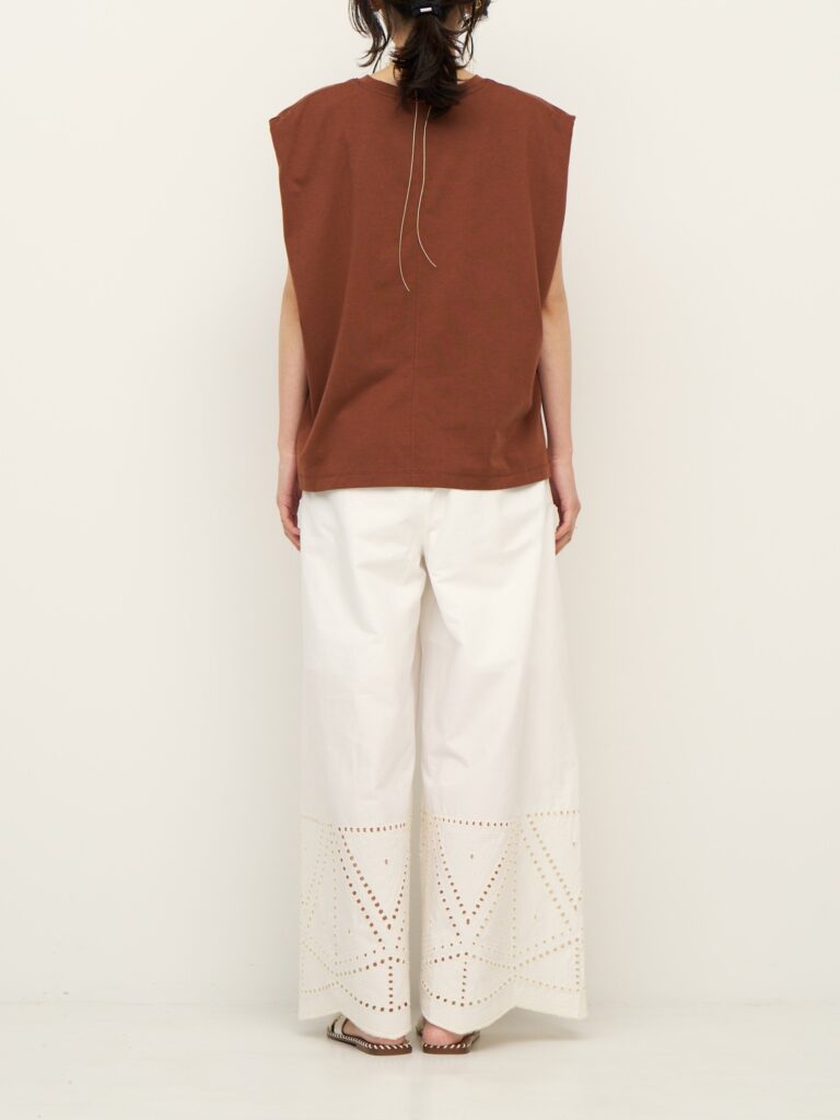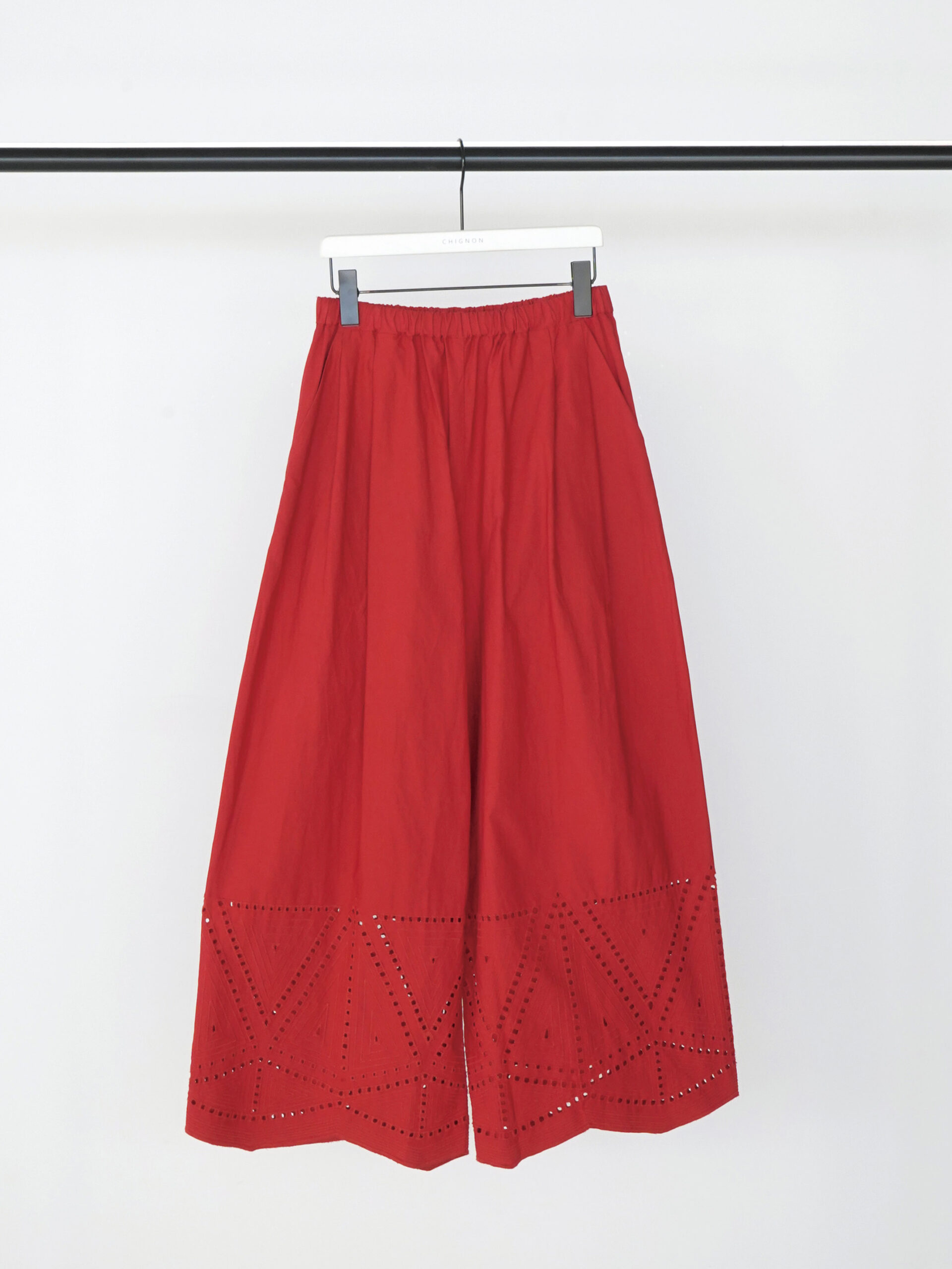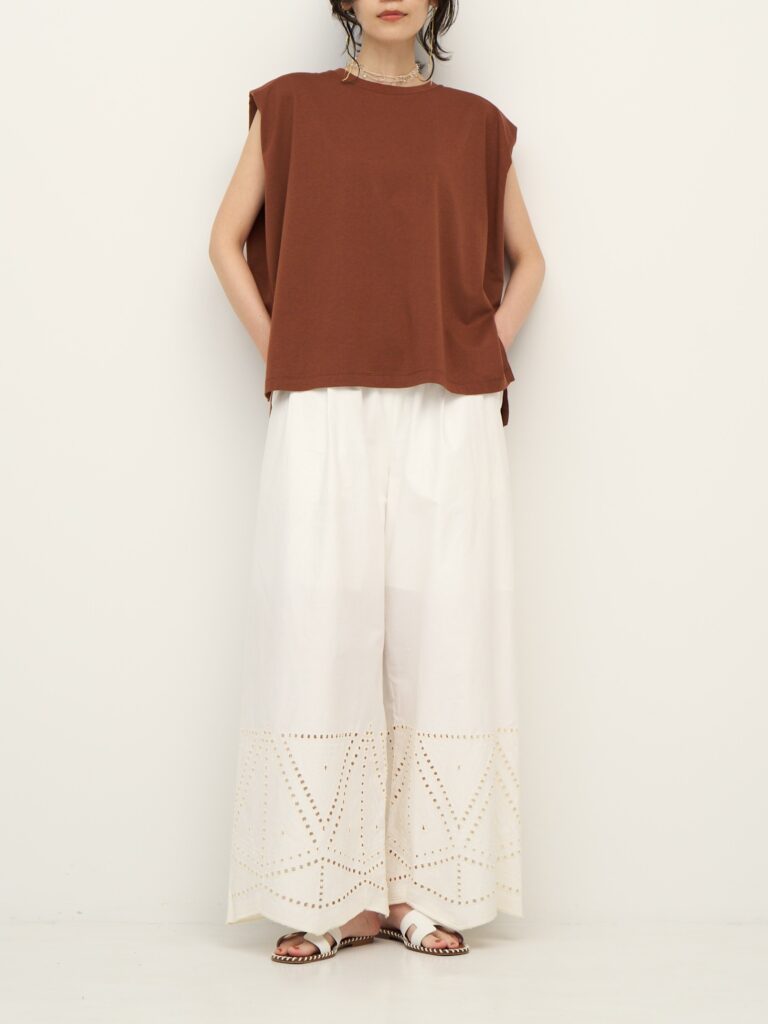 裾に施されたカットワーク刺繍が印象的なストレートワイドパンツです。