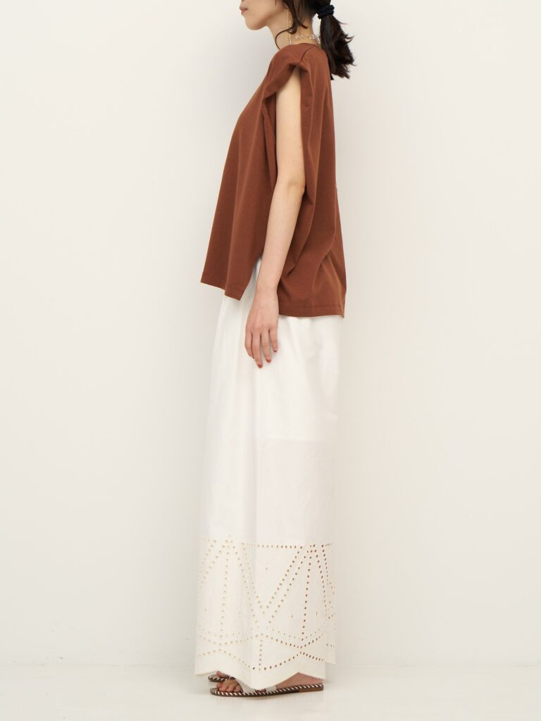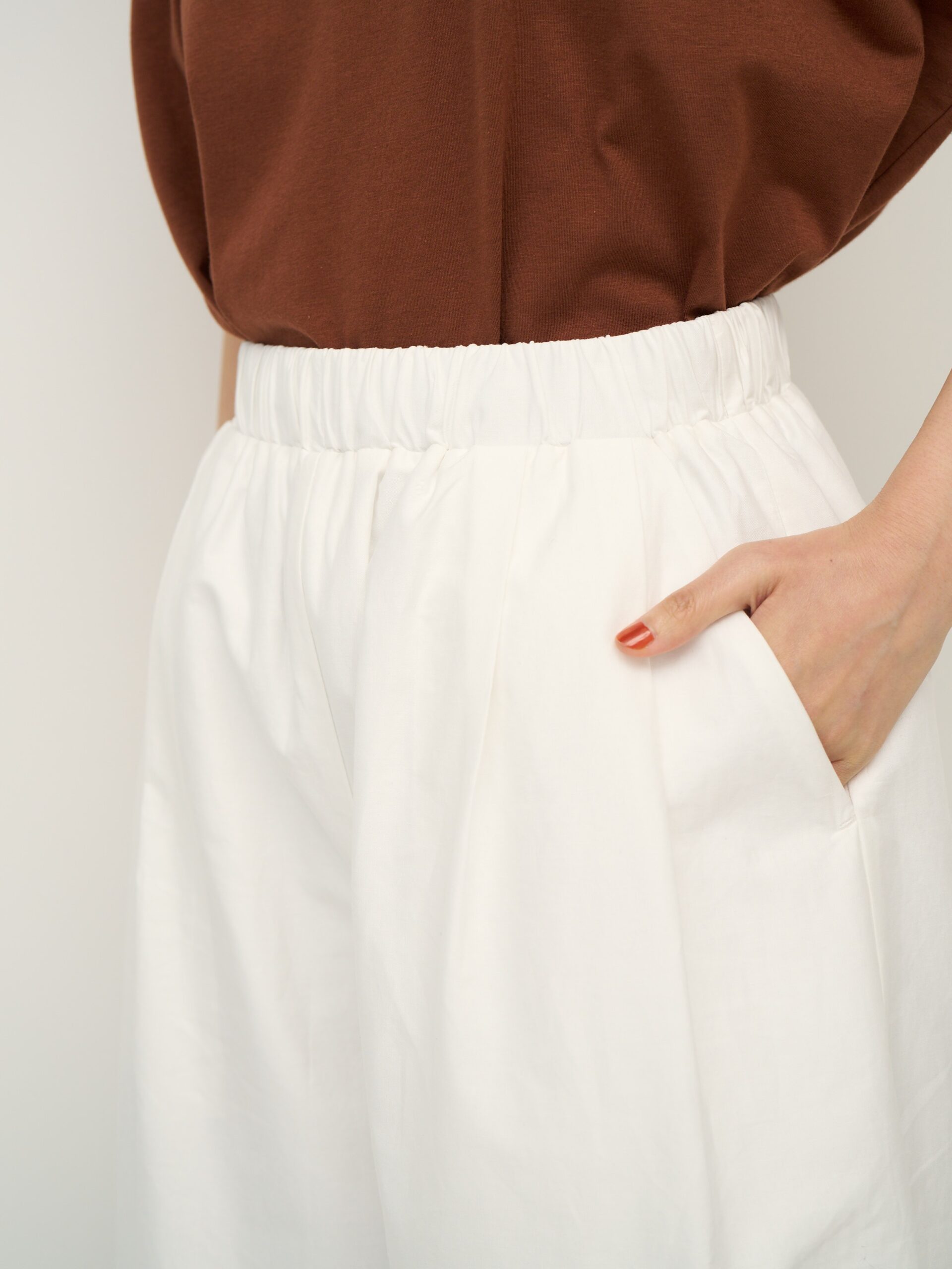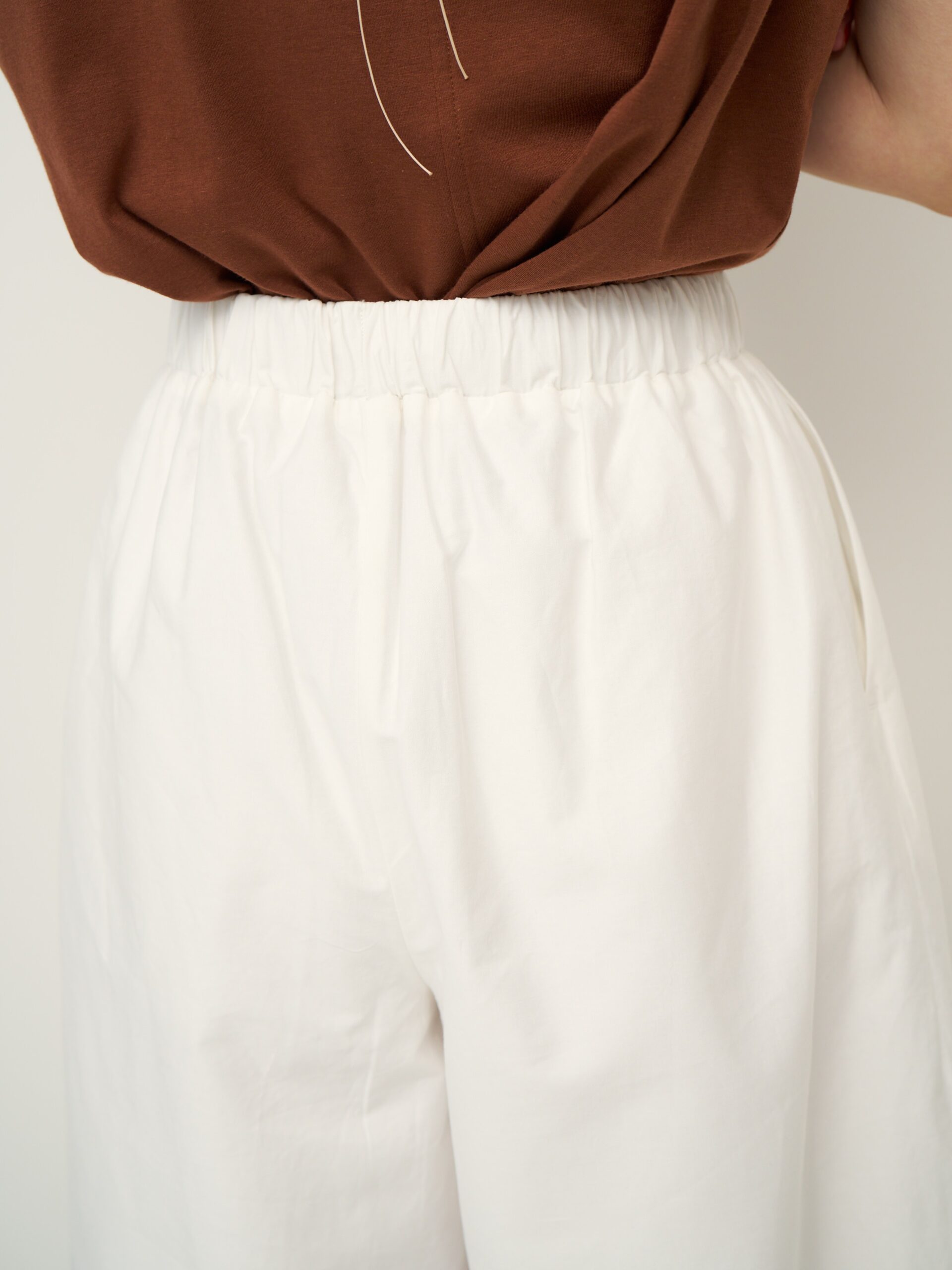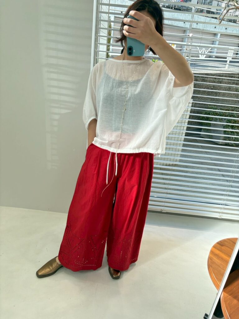 ウエストはゴム仕様でストレスフリー、軽やかな素材感でリラックスした穿き心地を叶えます。