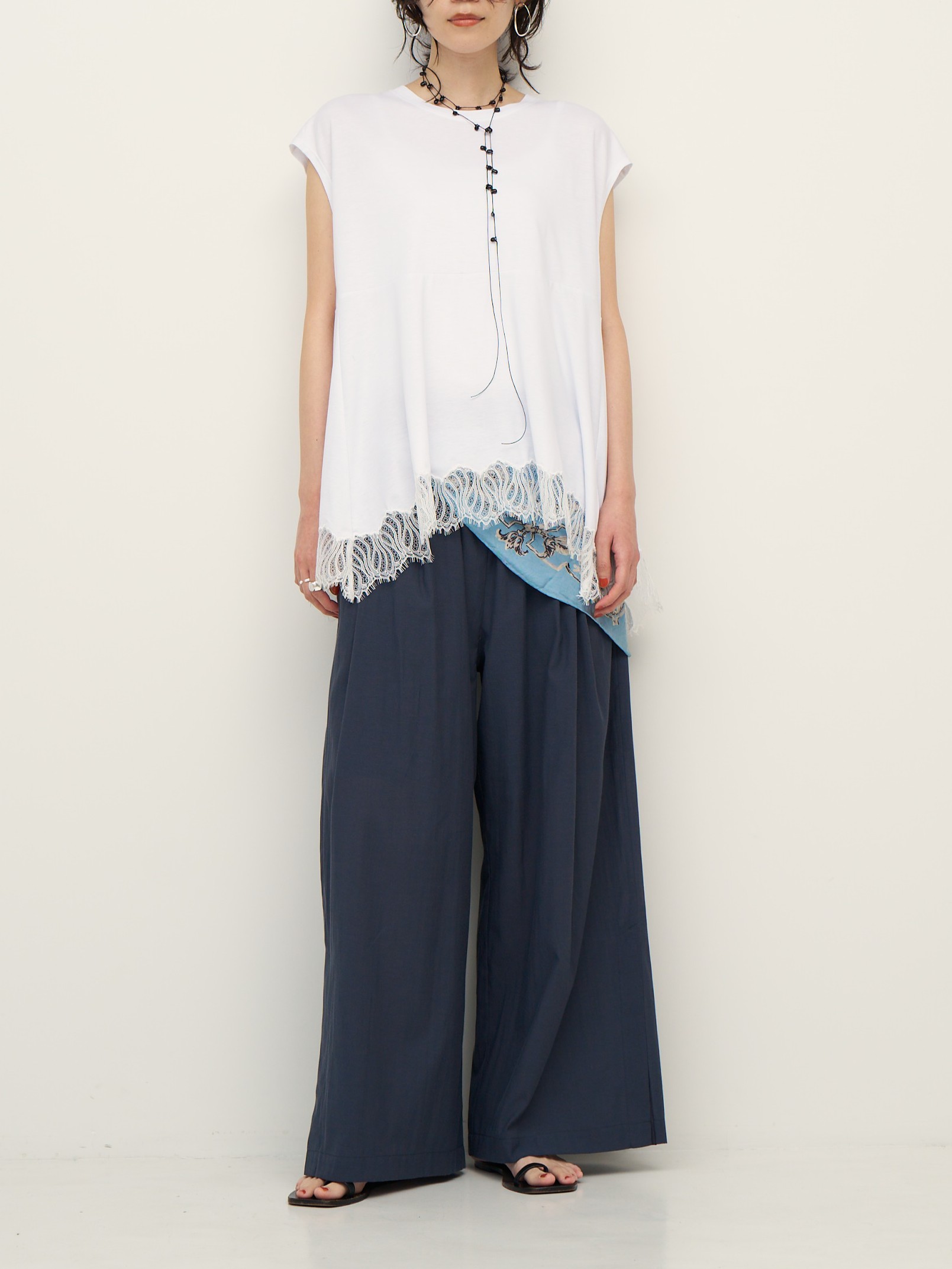 肌触りの良いカットソー素材に、レースを刺繍して組み合わせることで女性らしい華やかさをプラスしています。