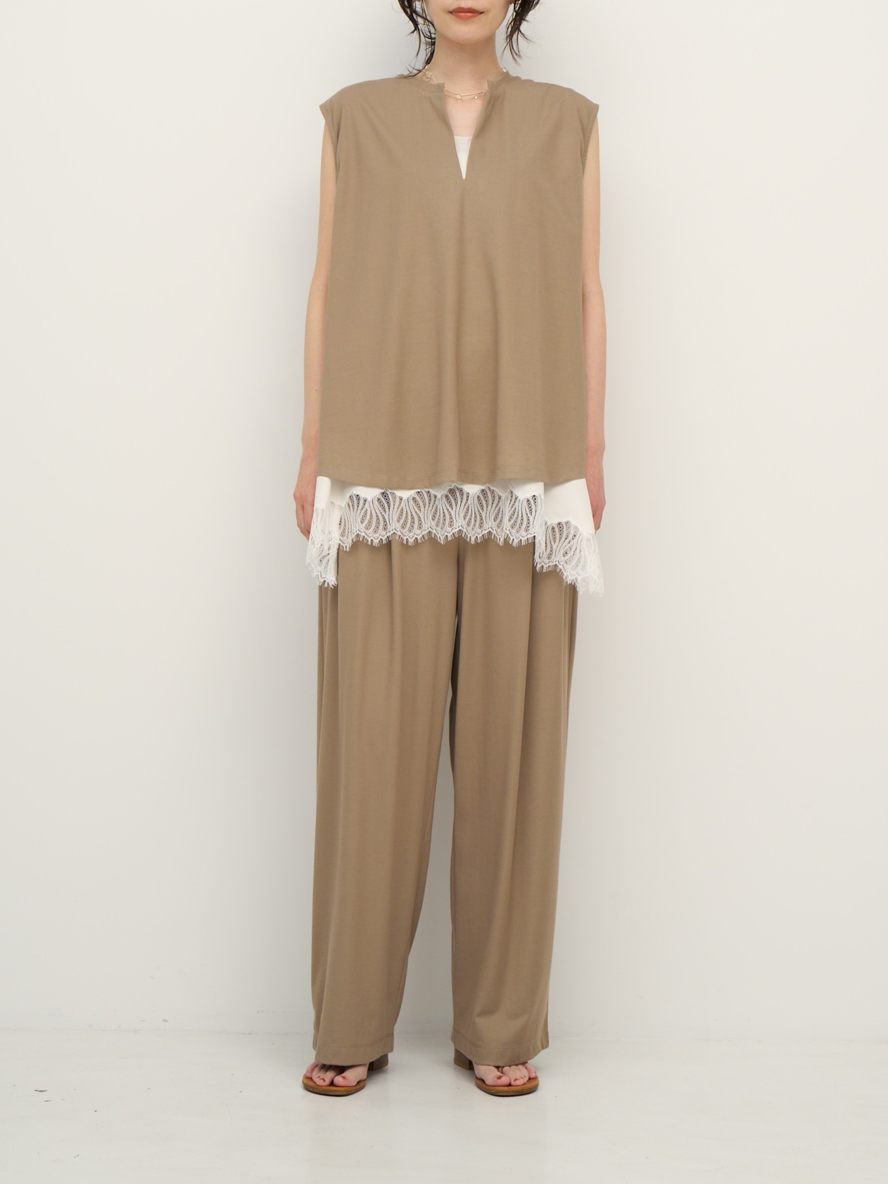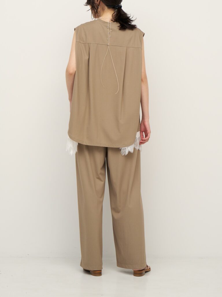 同素材のボトムも展開しており、リラックス感のあるセットアップになっています。イージーケア性が高く、猛暑時期の需要にマッチした実用性の高いアイテムです。