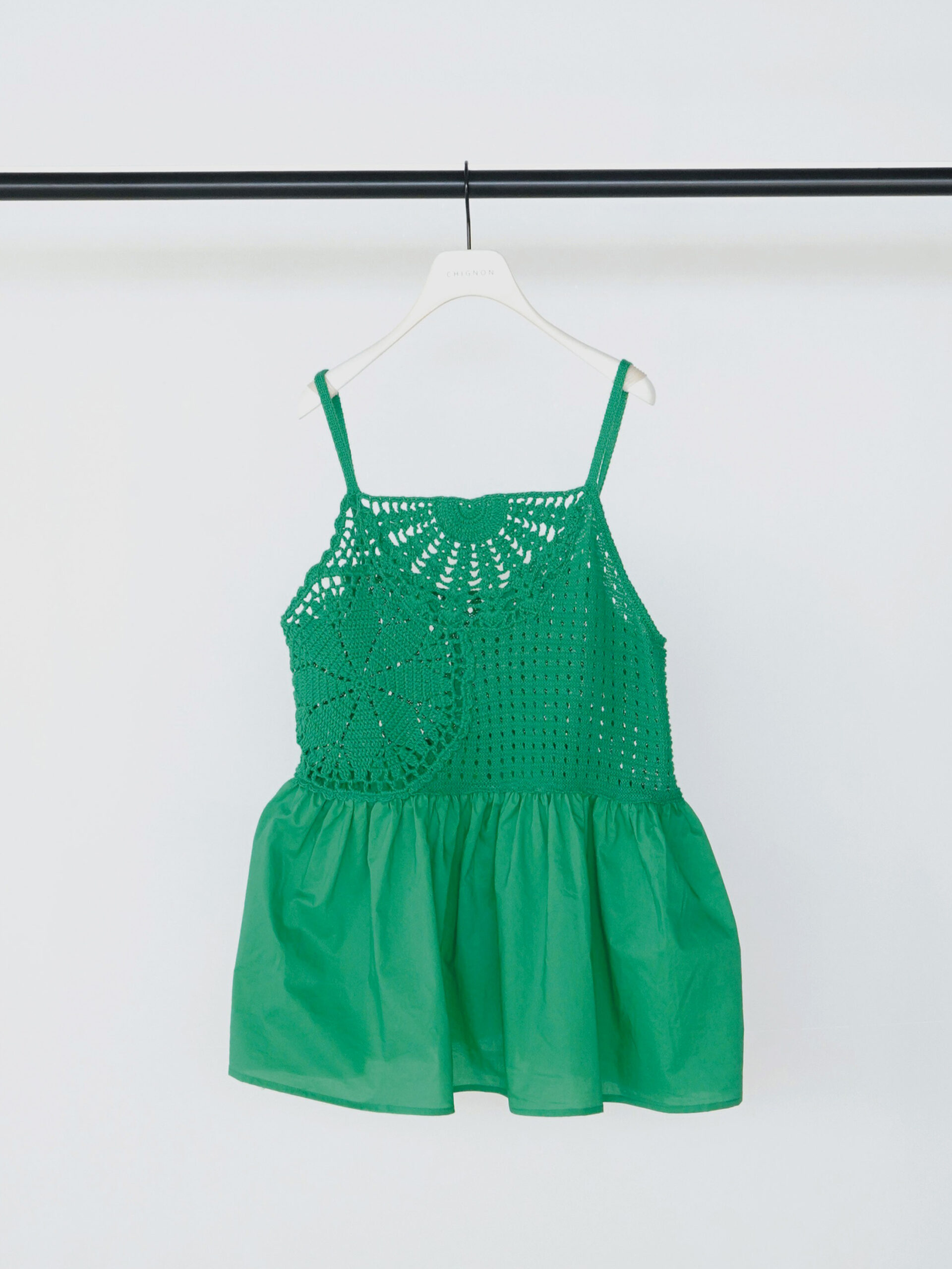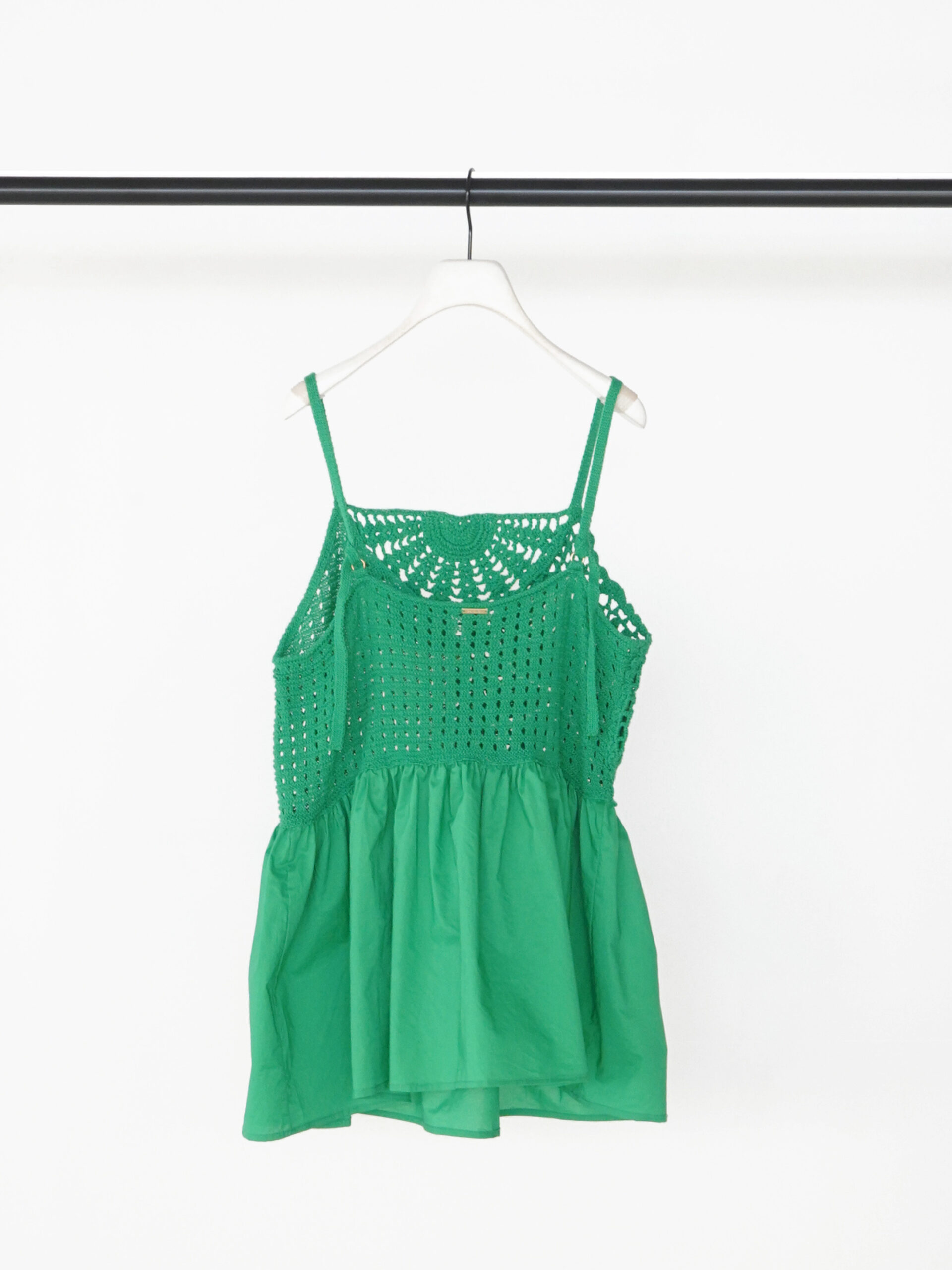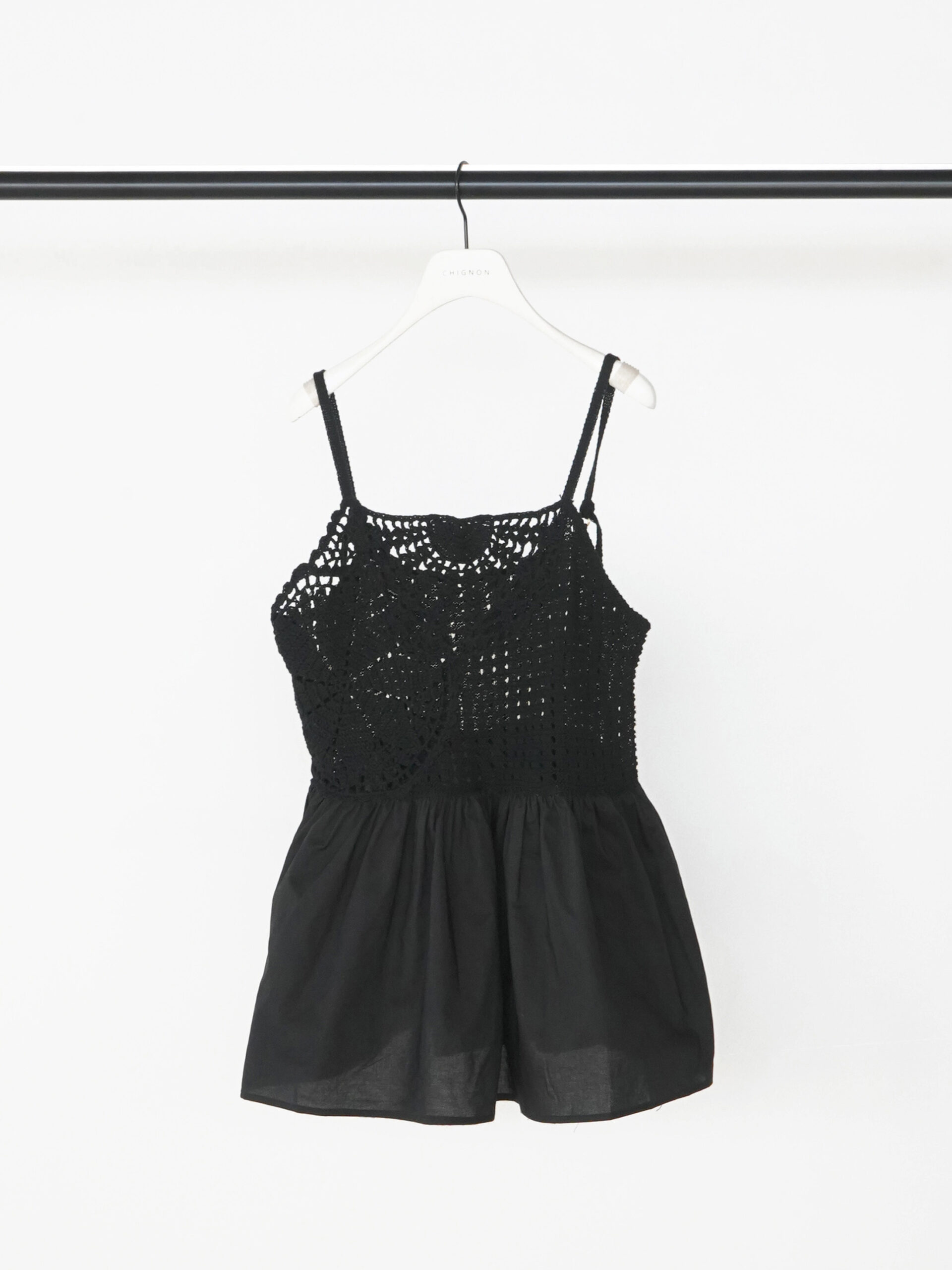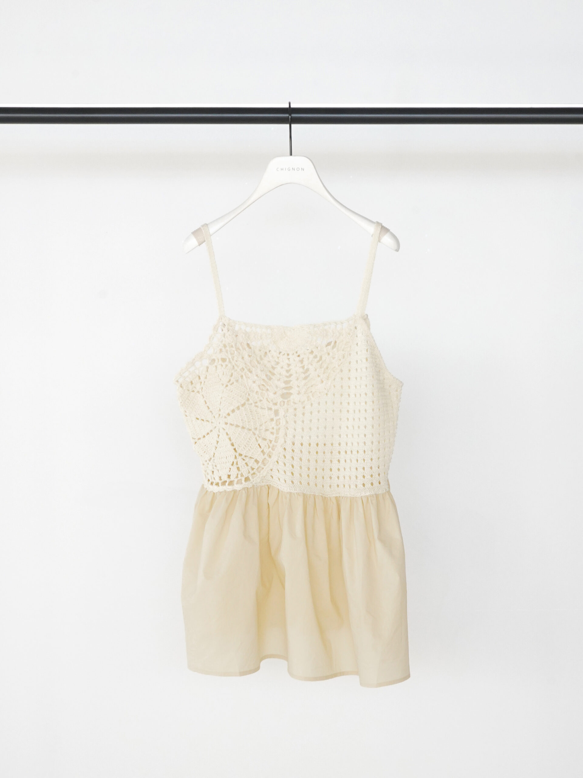 手編みのかぎ針編みが目を引く、存在感のあるプラスワンキャミソールトップス。