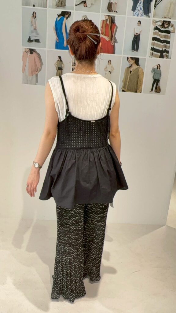 下身頃は布帛素材に切り替えたフレアデザインで、軽やかな動きを演出します。
