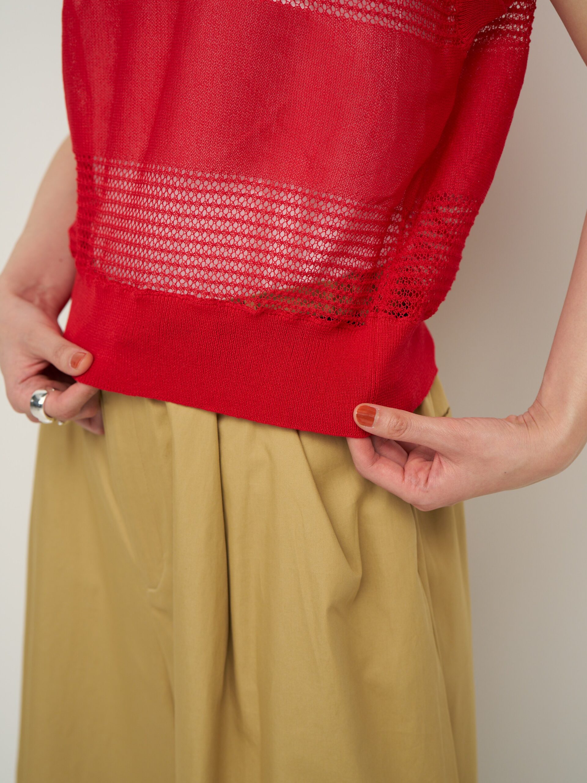 レース編みと天竺のボーダーで、シンプルながら存在感のあるニットになっています。コンパクトな着丈感でコクーンパンツなどボリューム感のあるボトムとの相性が抜群です。