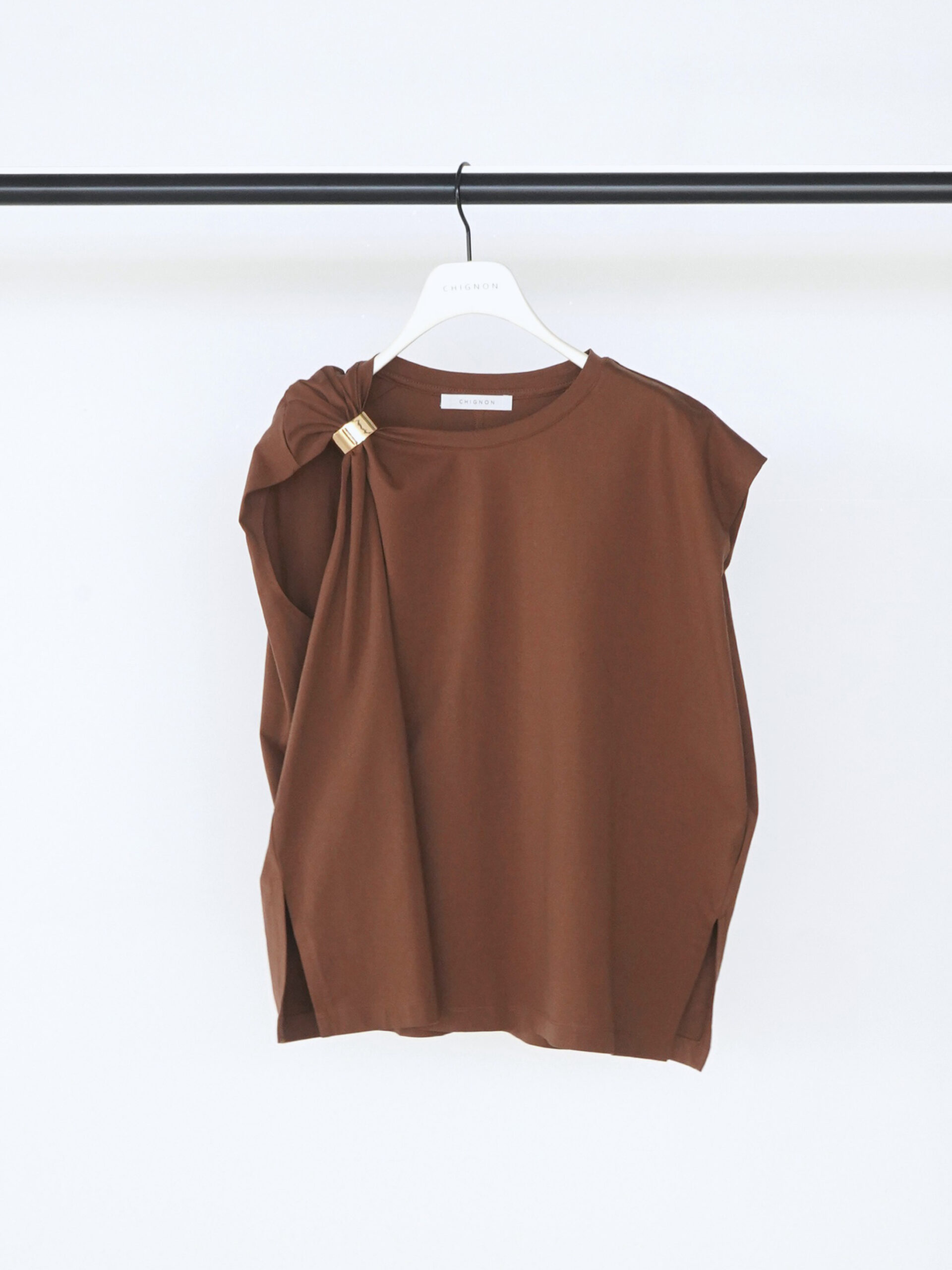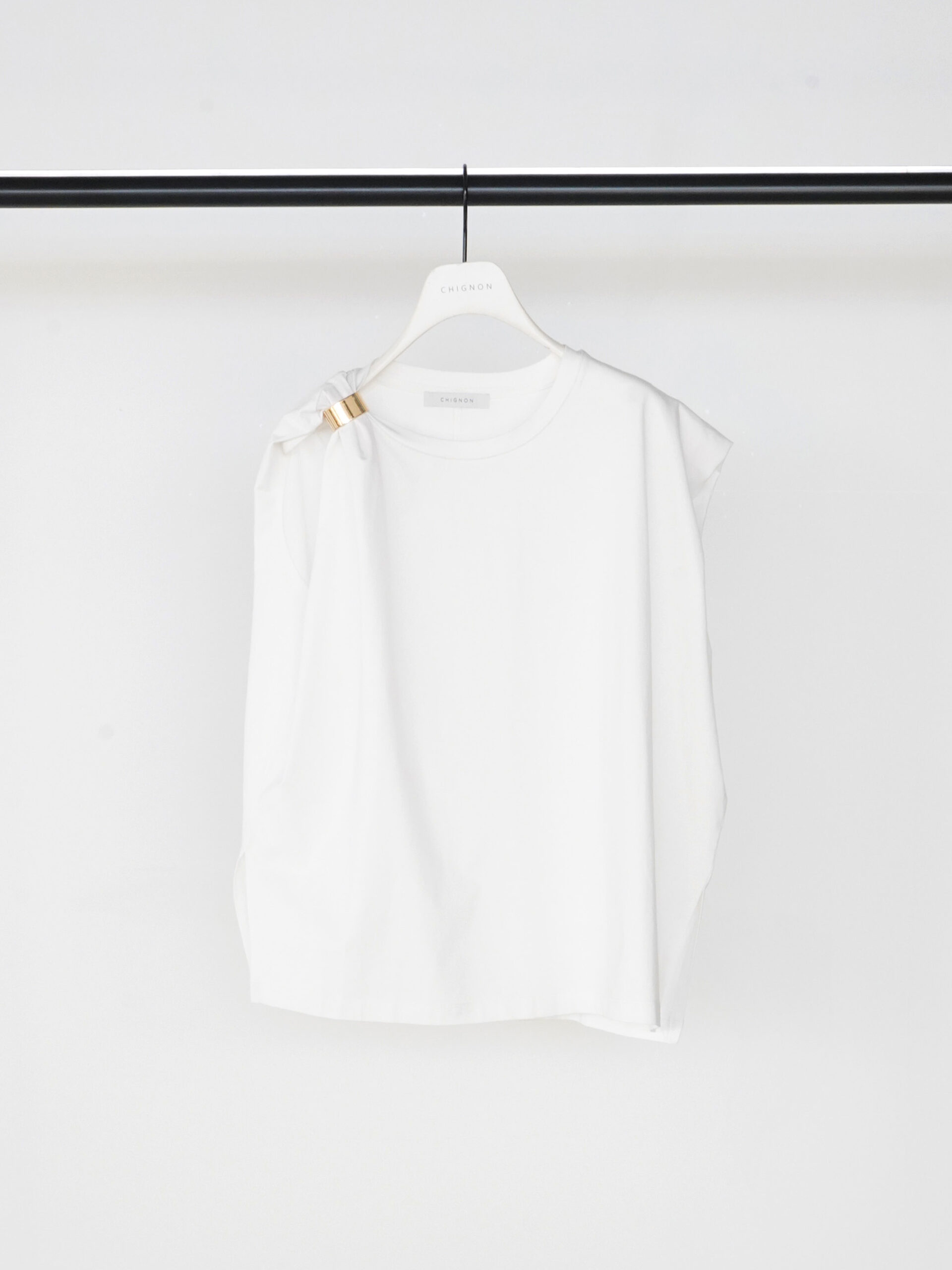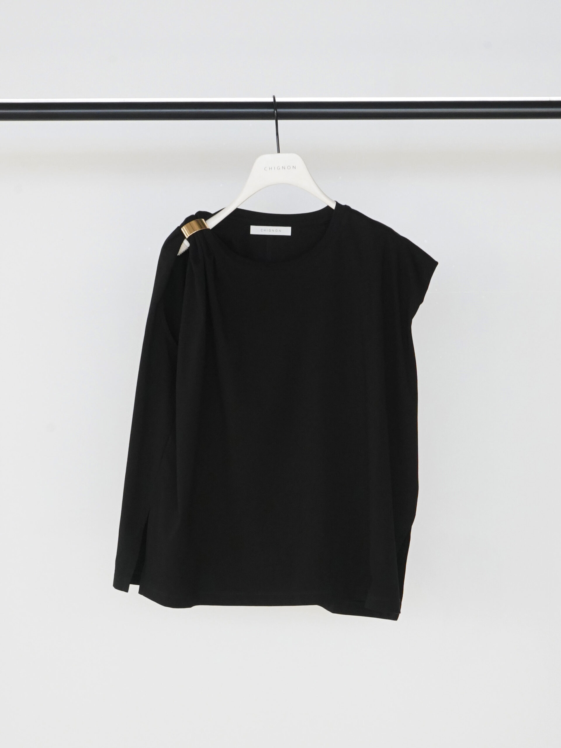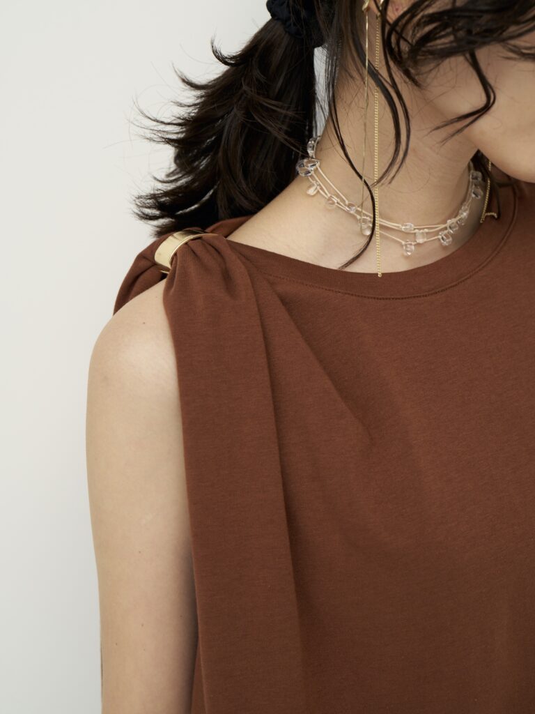 二の腕のラインを包んでくれるショルダータックが効いた、シンプルで着回しの効くトップスに、ゴールドのマグネット式メタルクリップをセット。