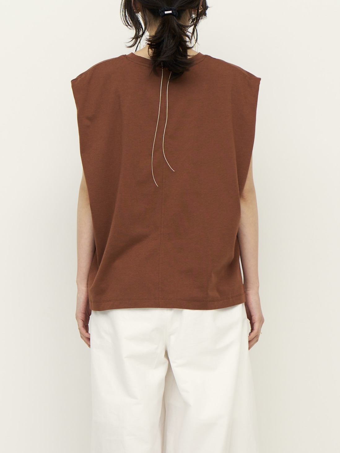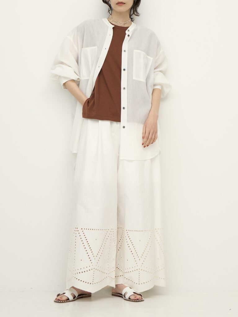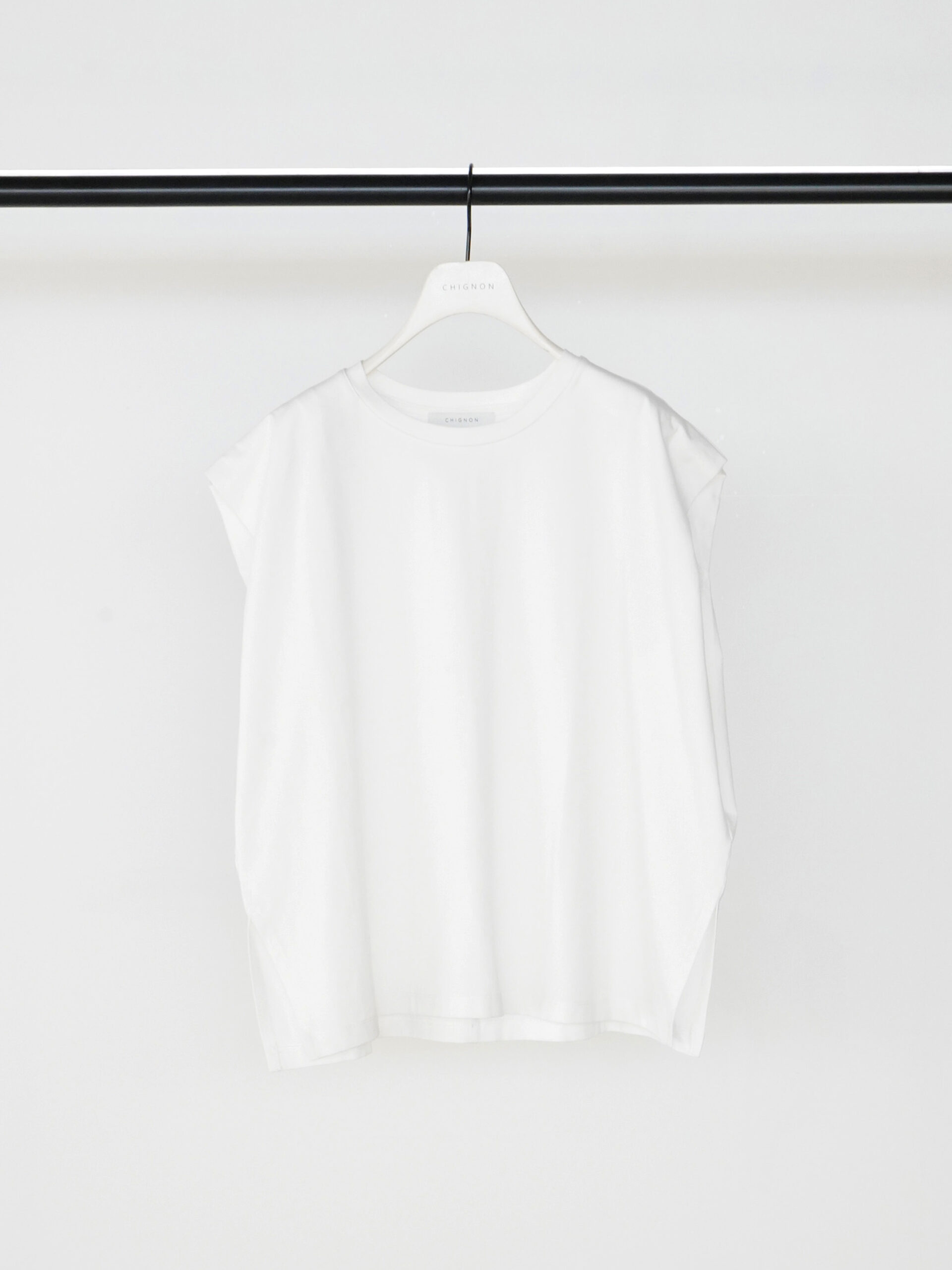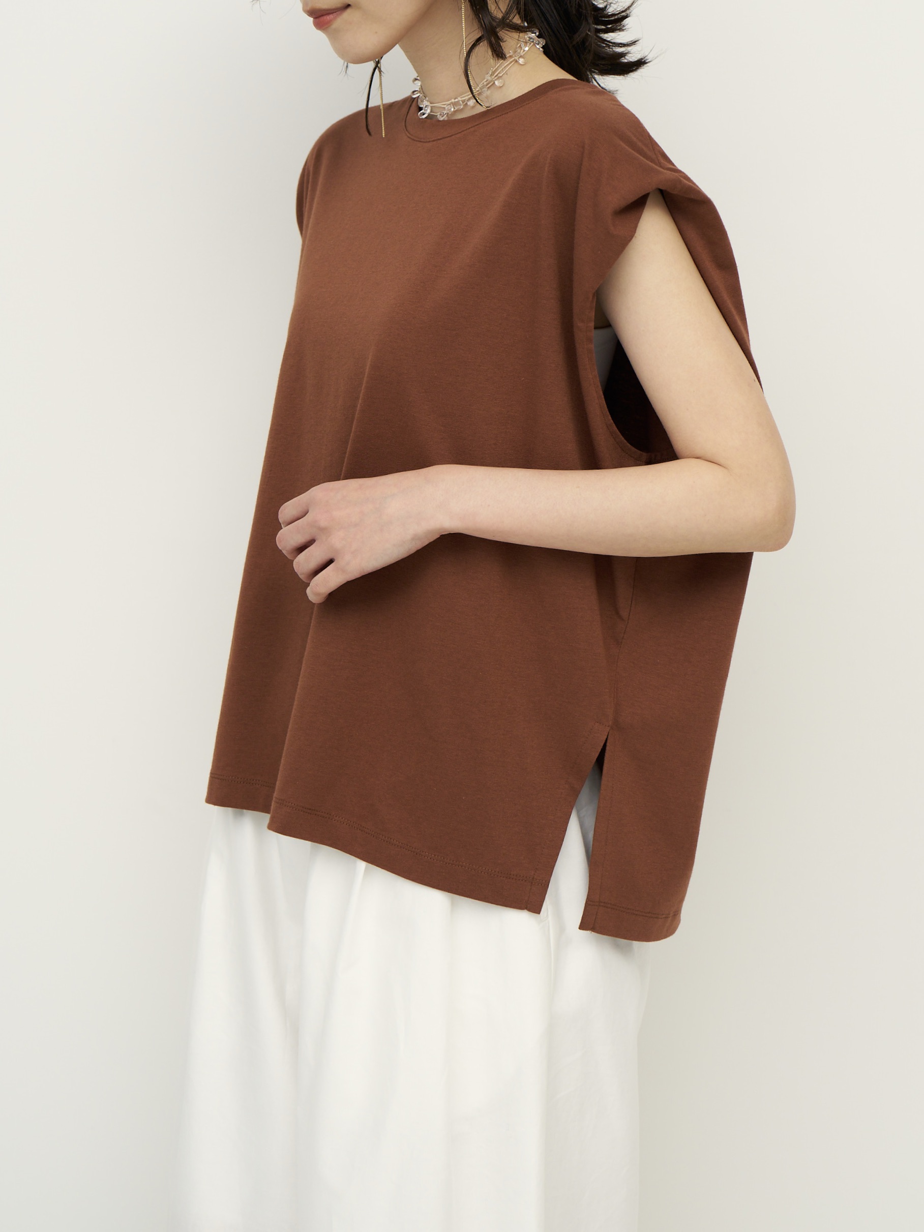 二の腕のラインを包んでくれるショルダータックが効いた、シンプルで着回しの効くトップスに、ゴールドのマグネット式メタルクリップをセット。