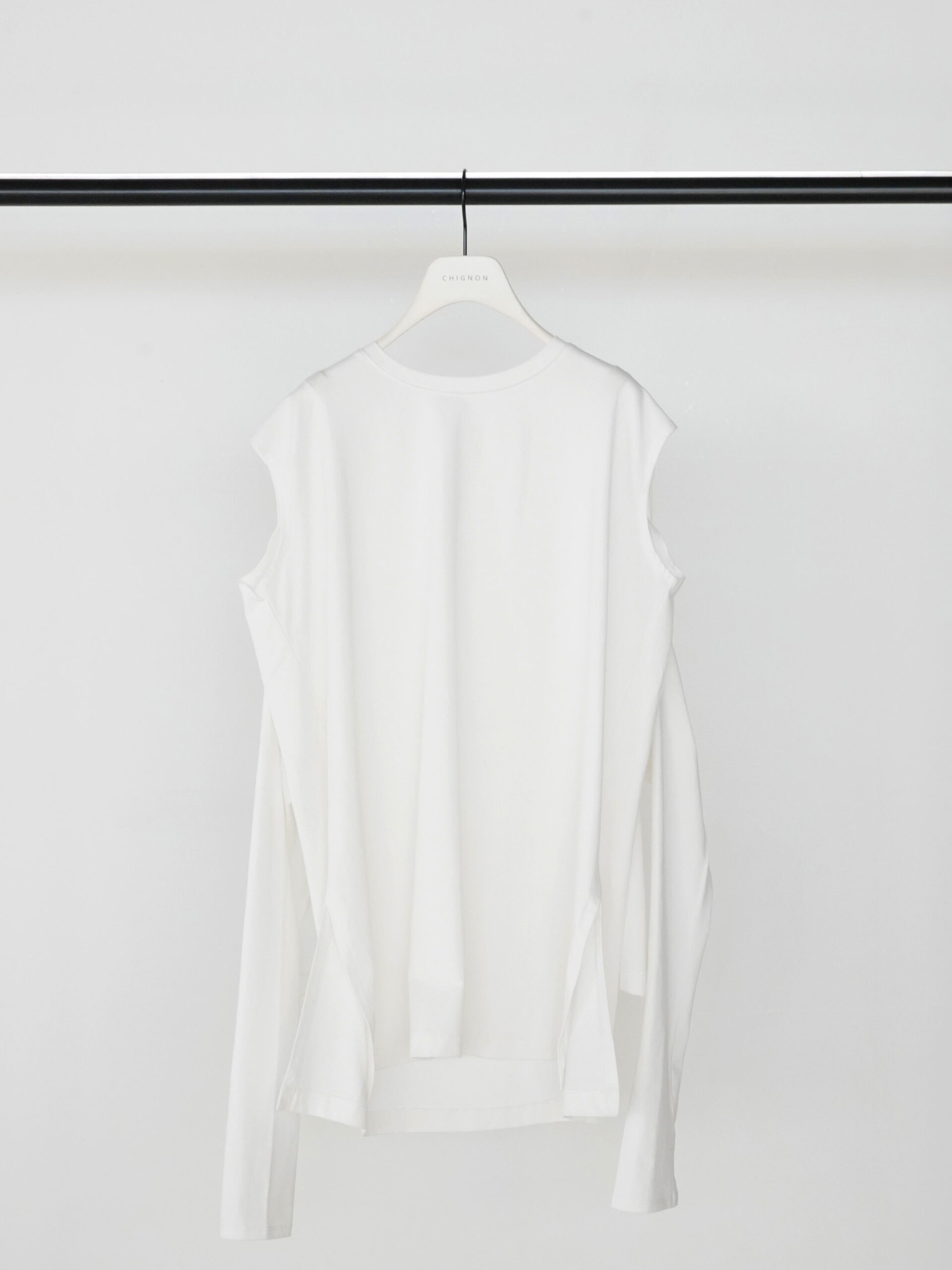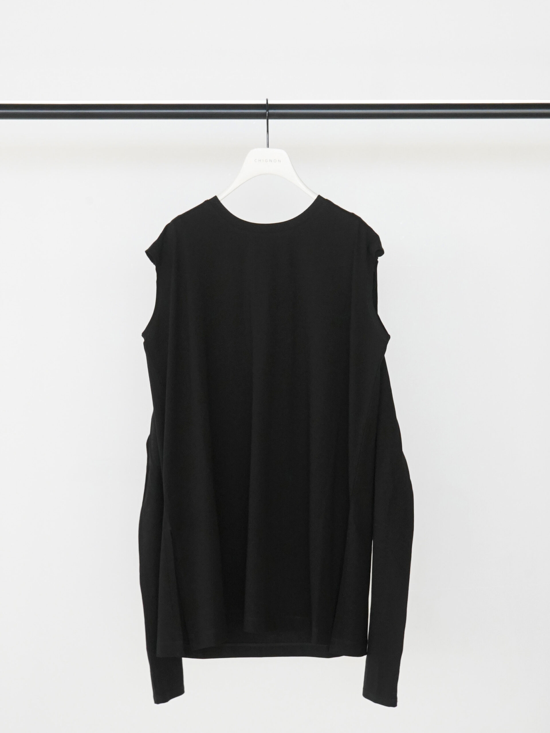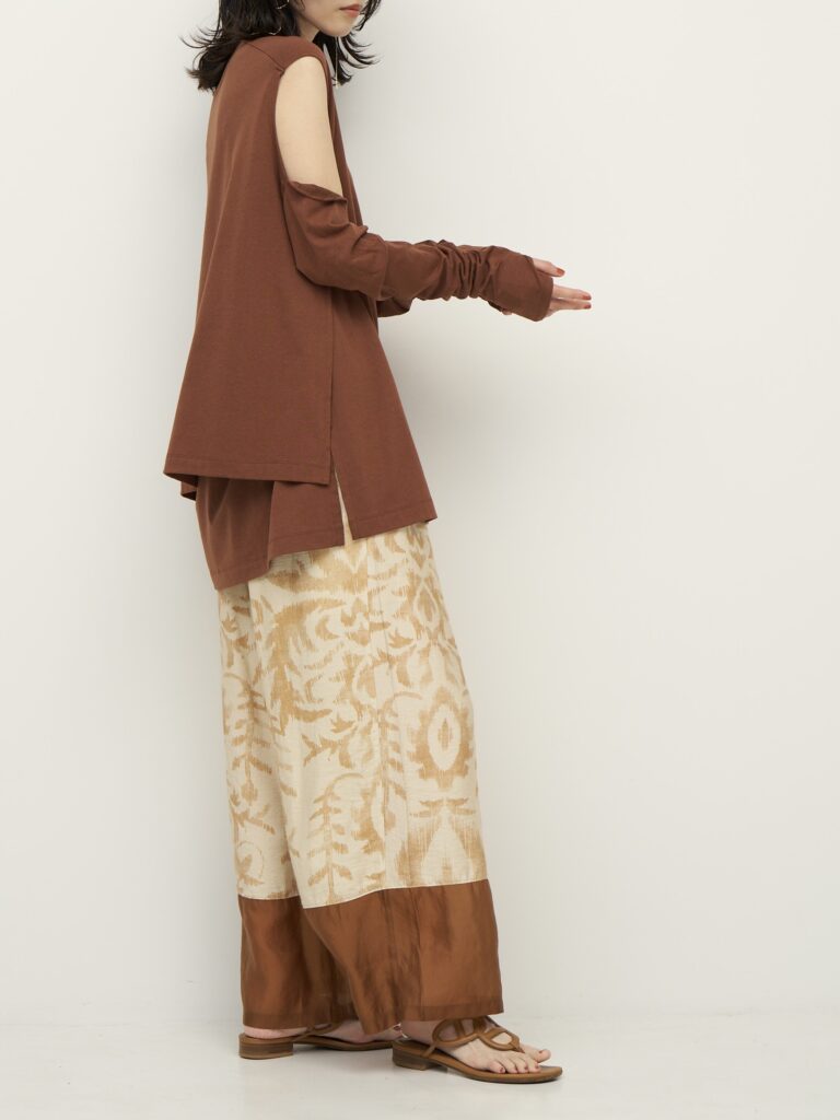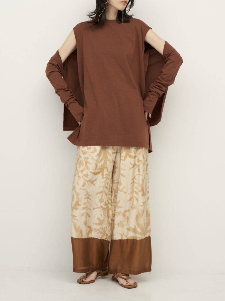 レイヤード風デザインながら、すっきりとしたIラインが作れるトップスなので、様々なシルエットのボトムスと相性抜群。