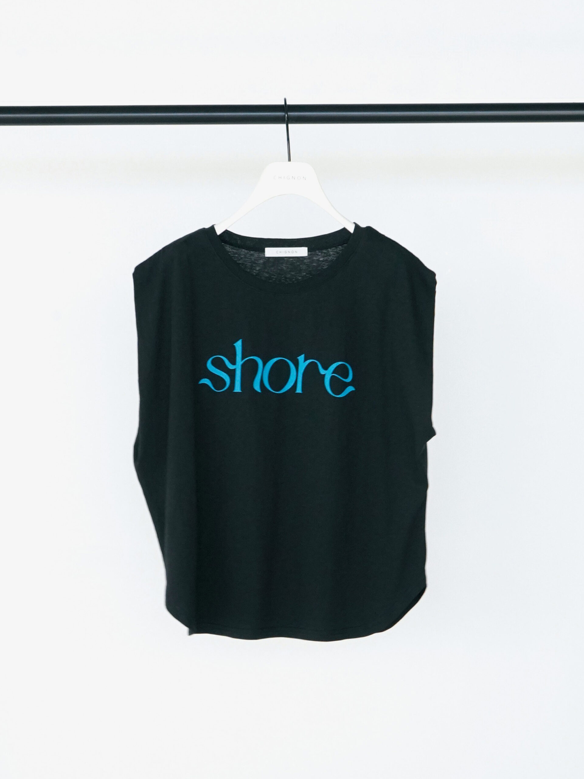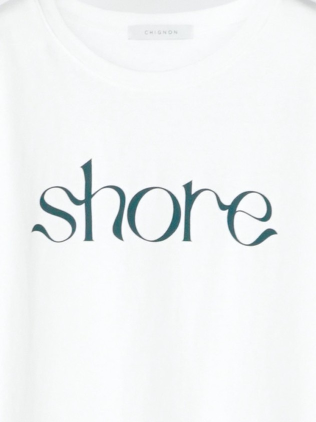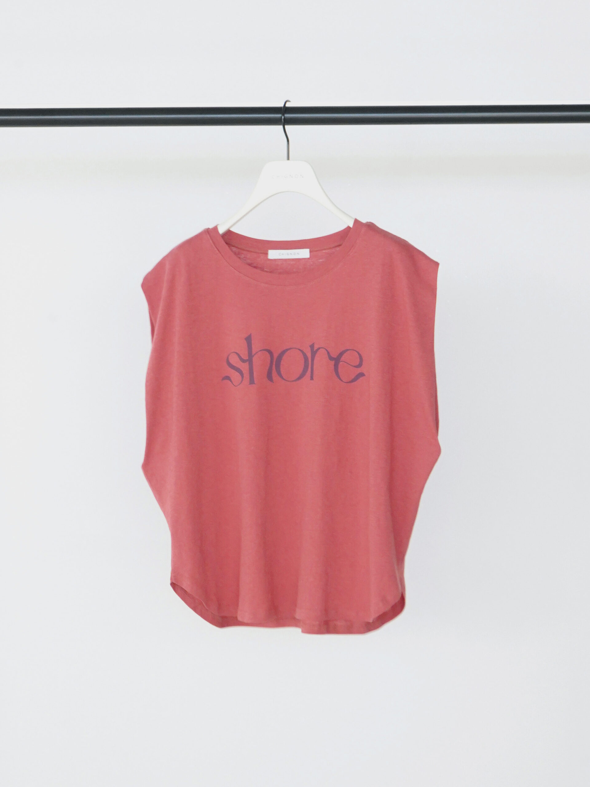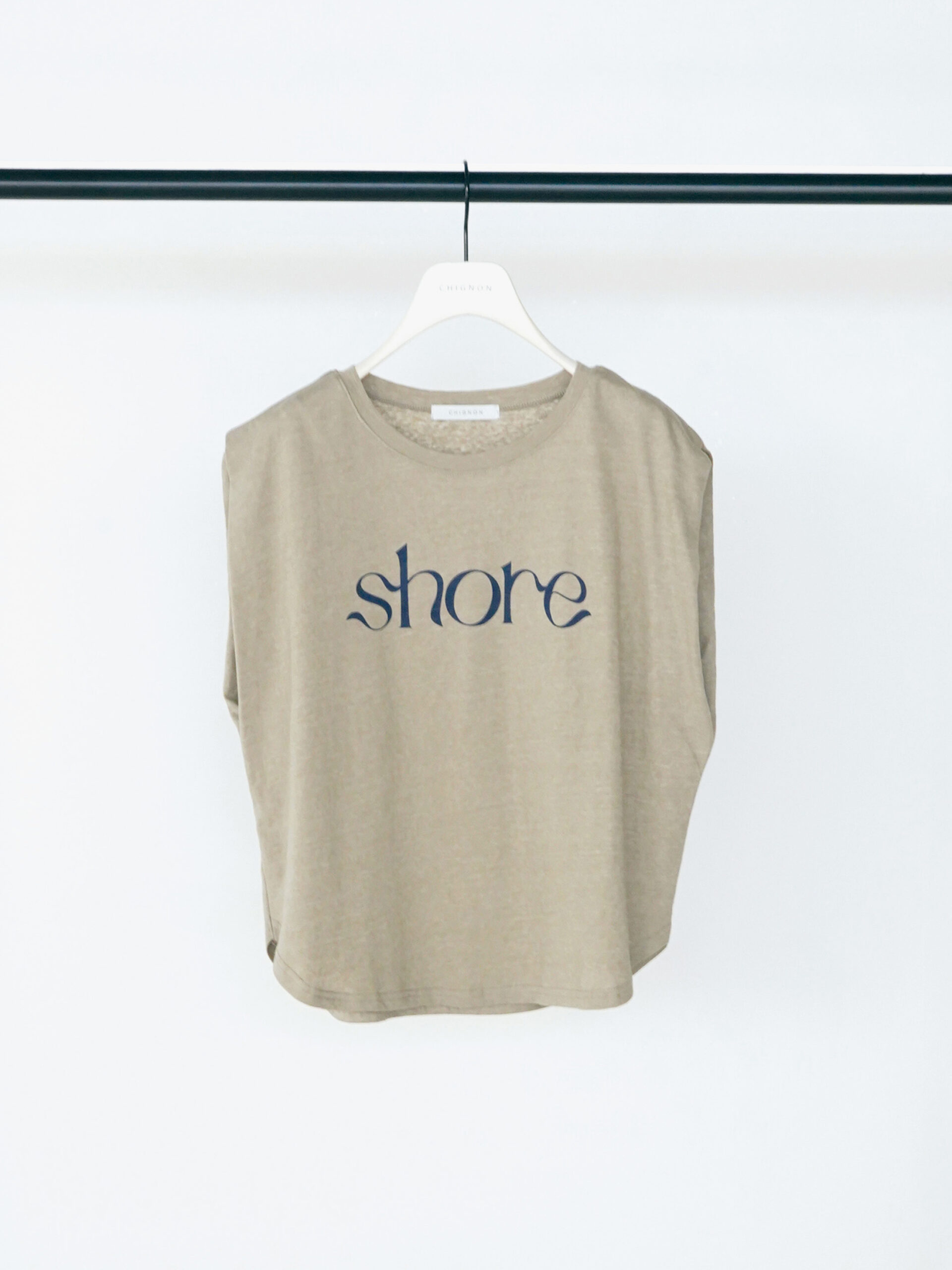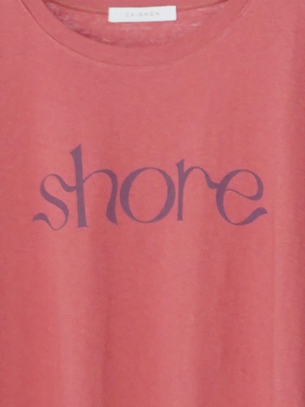 綿麻の夏らしいドライタッチな生地をセレクトしたコンパクトシルエットのフレンチスリーブT。フロントに流れるようなロゴ”SHORE”(海辺)をプリントし女性らしいプリントTに仕上がりました。シンプルながらもスタイリングのアクセントになる、1枚で着映えするデザイン。