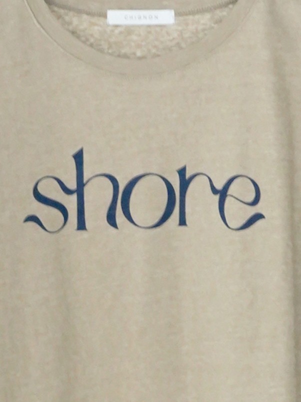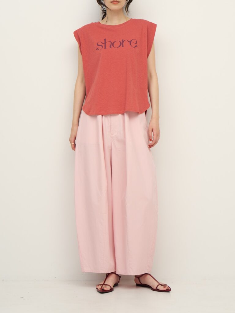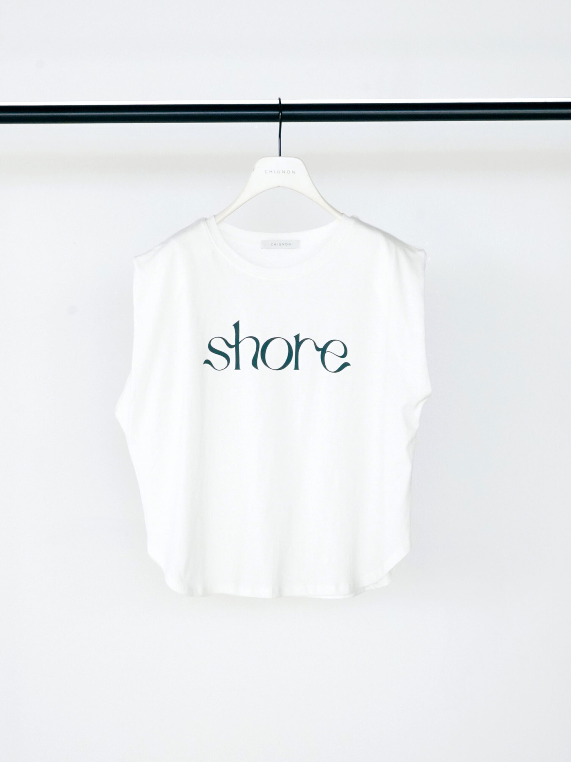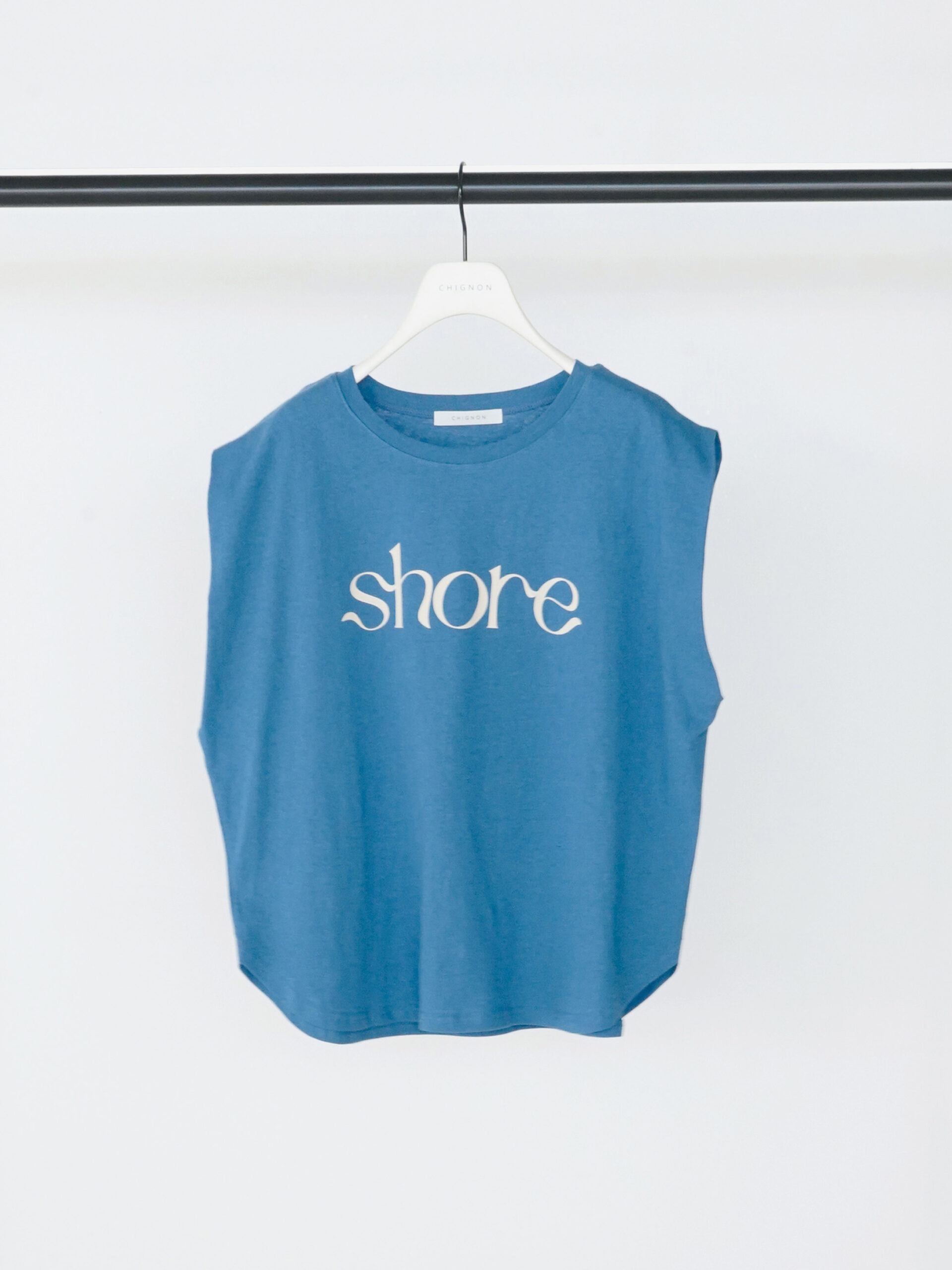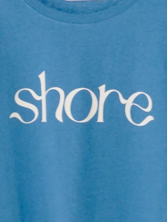 綿麻の夏らしいドライタッチな生地をセレクトしたコンパクトシルエットのフレンチスリーブT。フロントに流れるようなロゴ”SHORE”(海辺)をプリントし女性らしいプリントTに仕上がりました。シンプルながらもスタイリングのアクセントになる、1枚で着映えするデザイン。