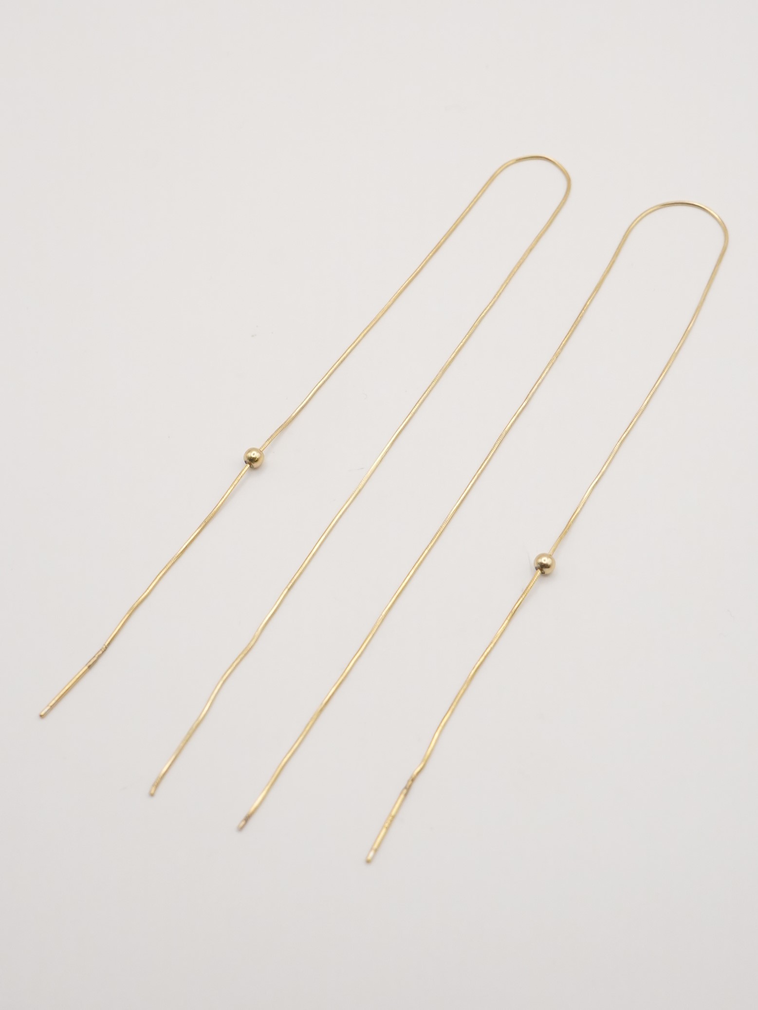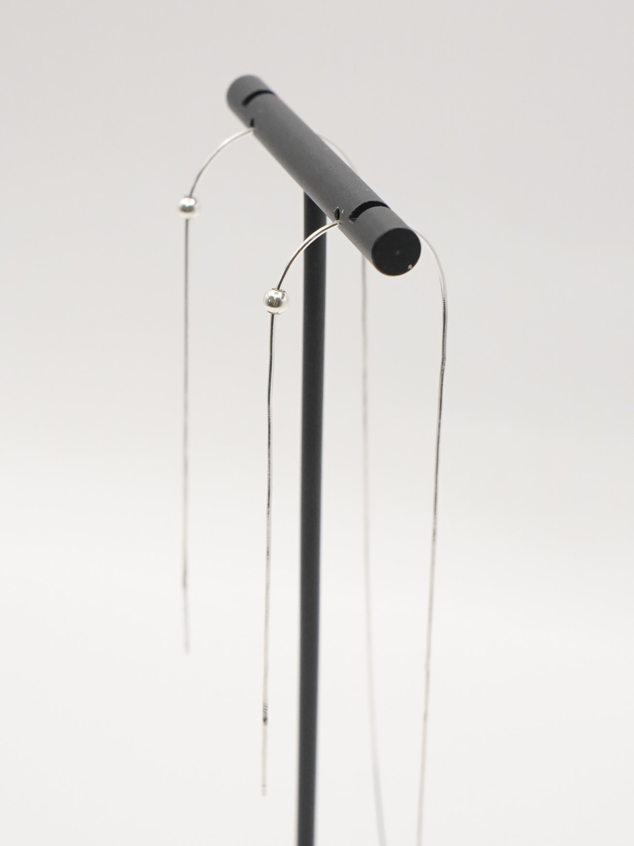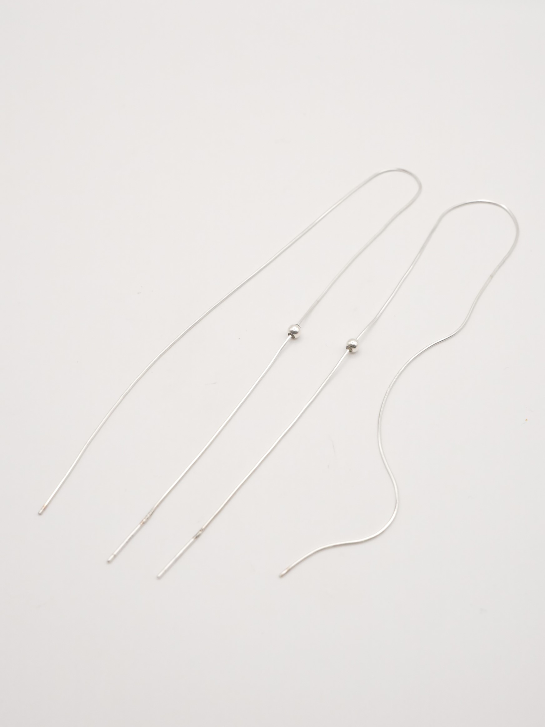 Silver925の角スネークチェーンを使用したロングアメリカンピアス。アメリカンピアスは先端のポストから耳穴に通していただき、お好きな位置でチェーンをUターンさせる仕様になります。小さな丸玉キャッチも付いていますので、前を長くして垂らして後ろをキャッチで留めておくことも可能です。