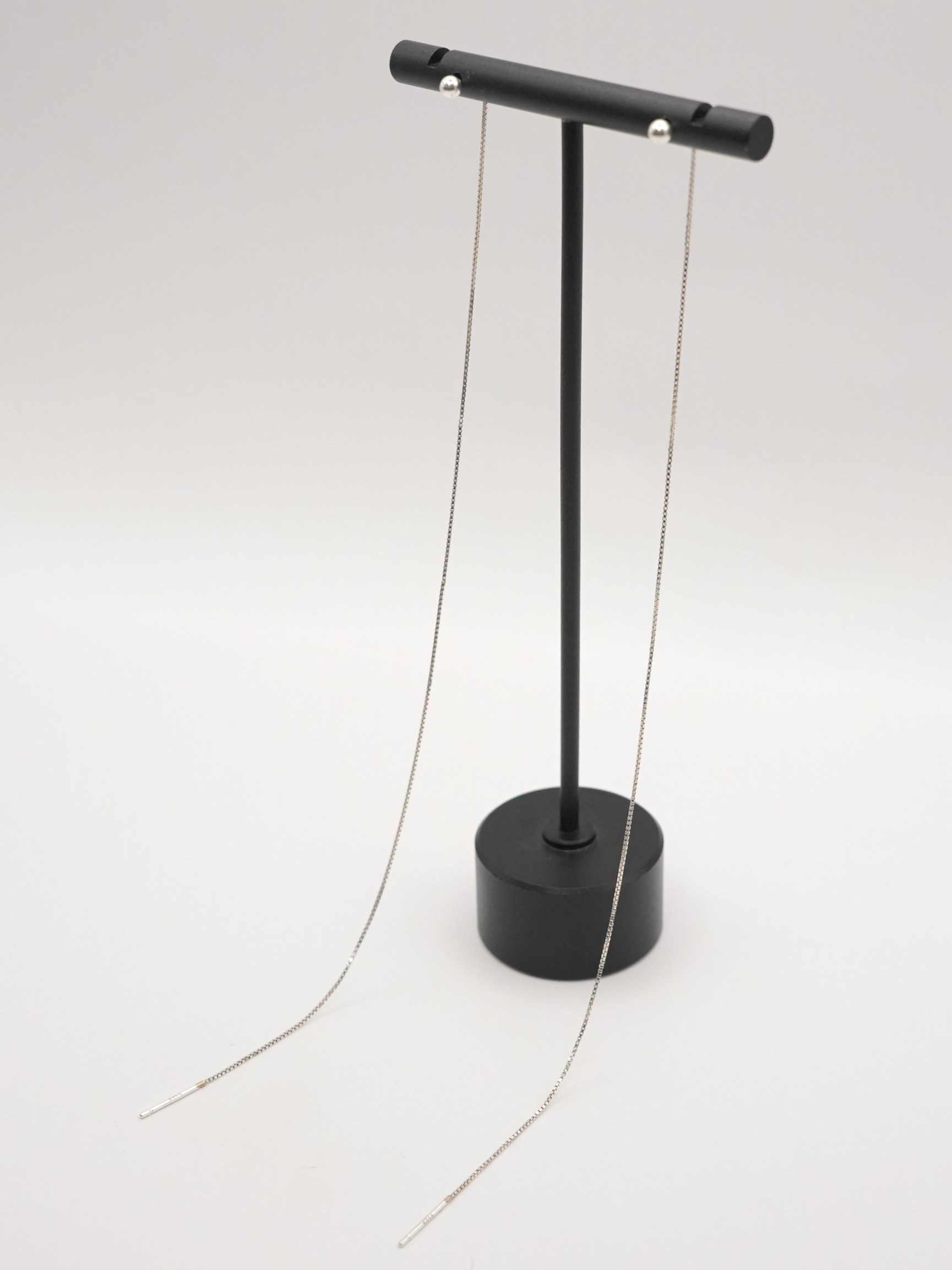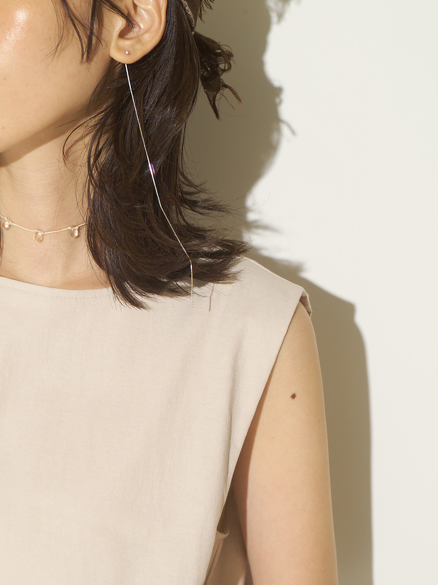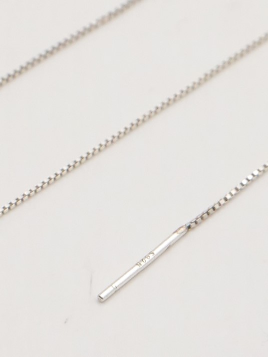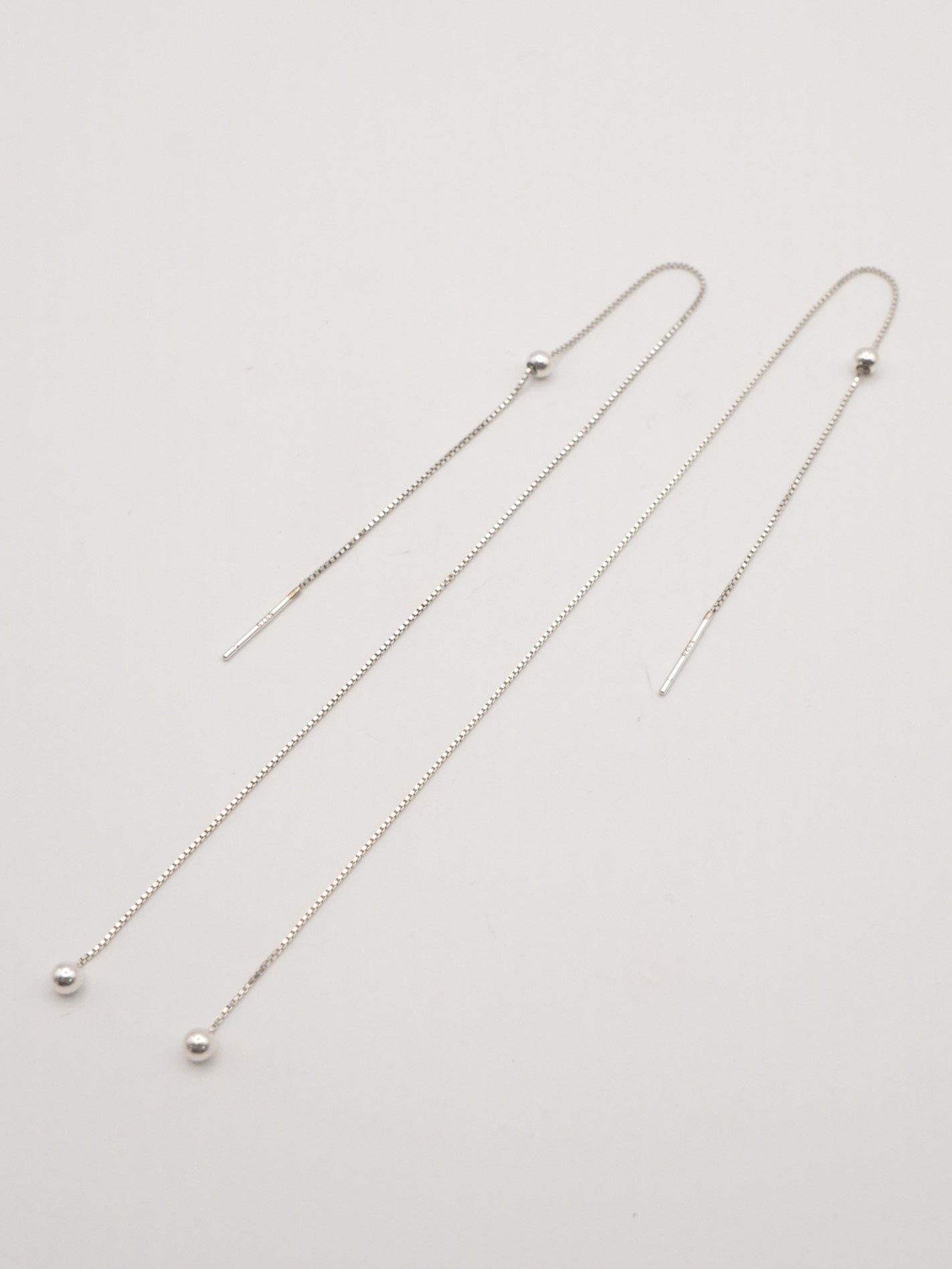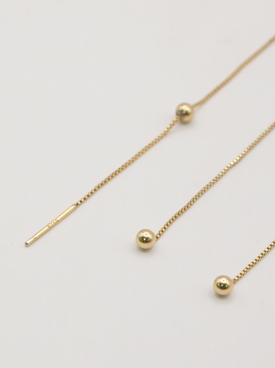 Silver925のボックスチェーンを使用したアメリカンピアス。アメリカンピアスは先端のポストから耳穴に通していただき、お好きな位置でチェーンをUターンさせる仕様になります。小さな丸玉キャッチも付いていますので、前を長くして垂らして後ろをキャッチで留めておくことも可能です。また、チェーン先端に丸玉を施していますので、丸玉部分が耳穴につくまでチェーンを後ろに垂らしてロングピアス風に着用するのもオススメです。