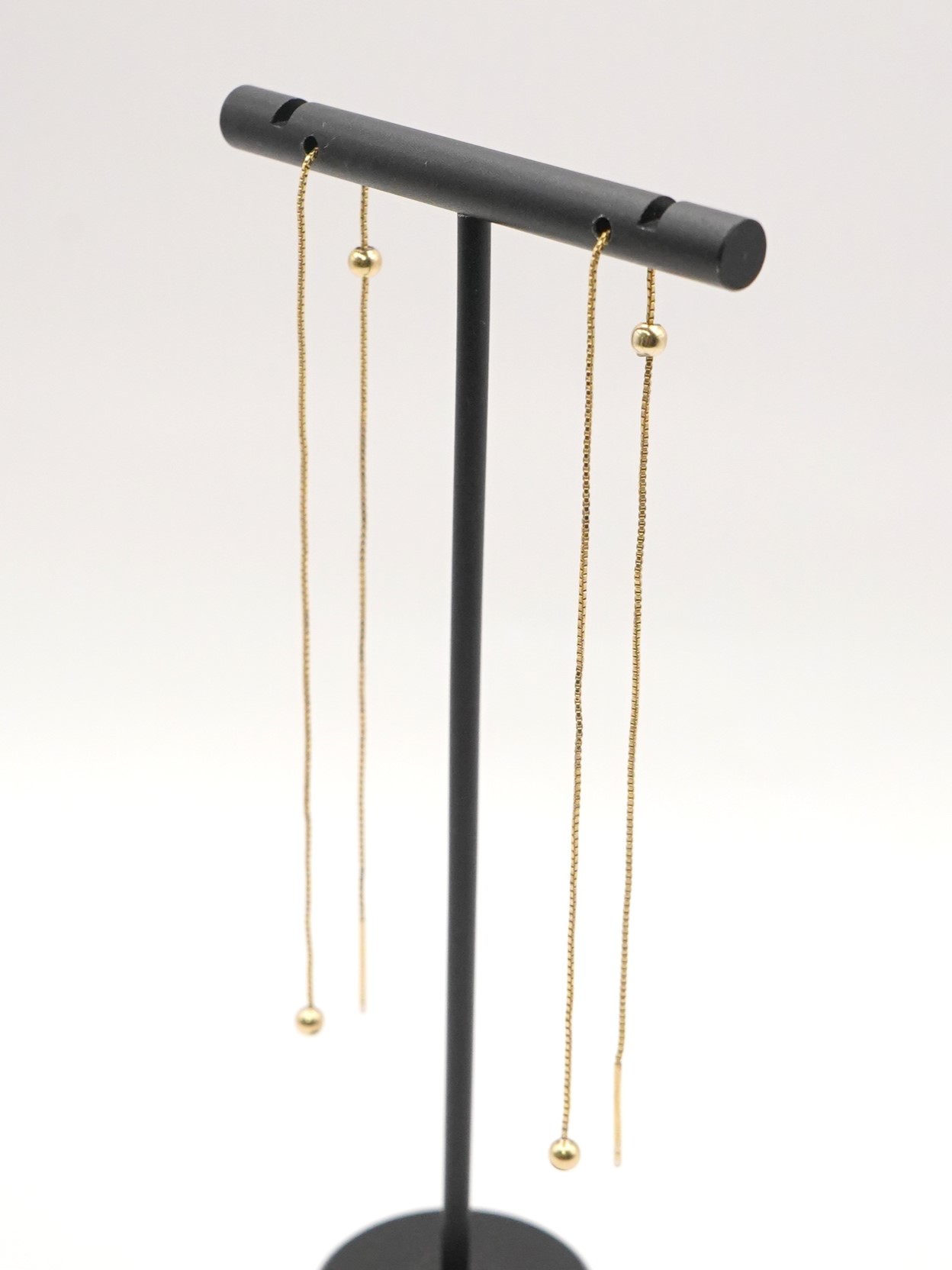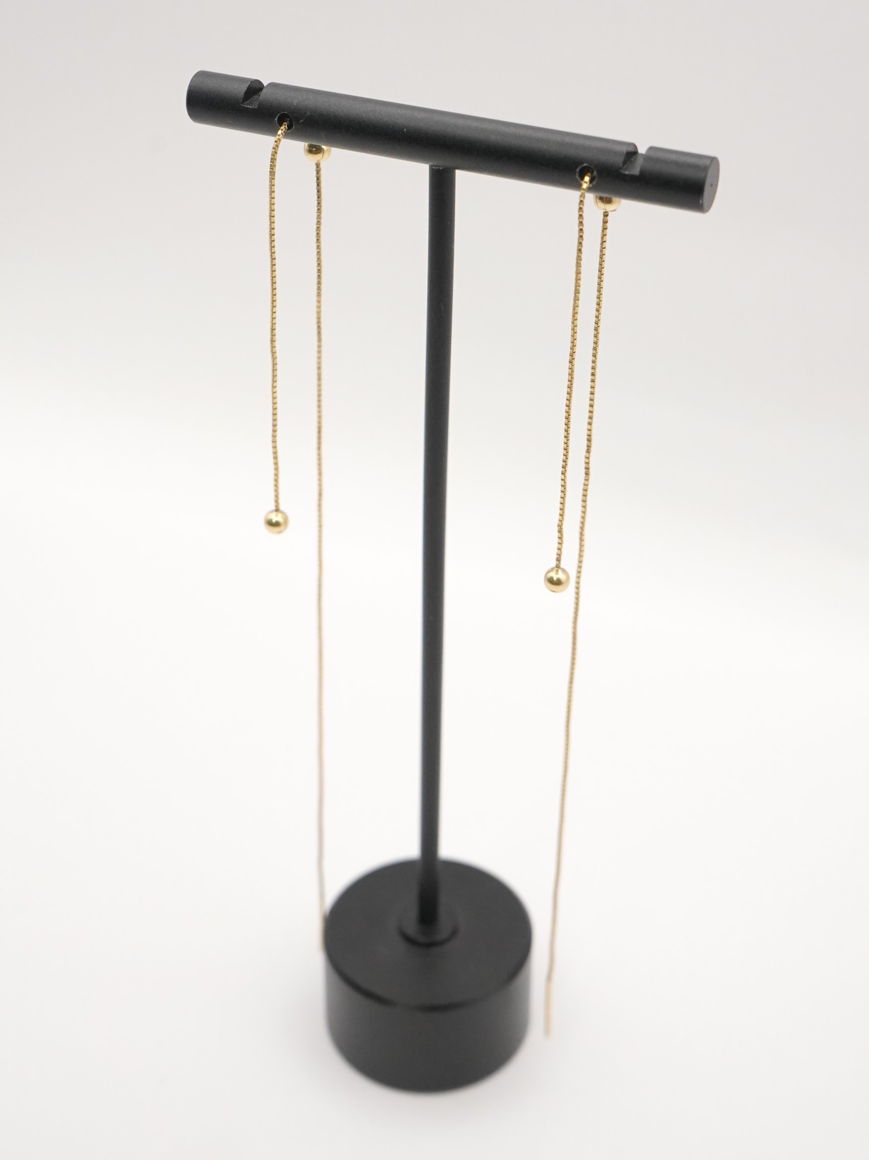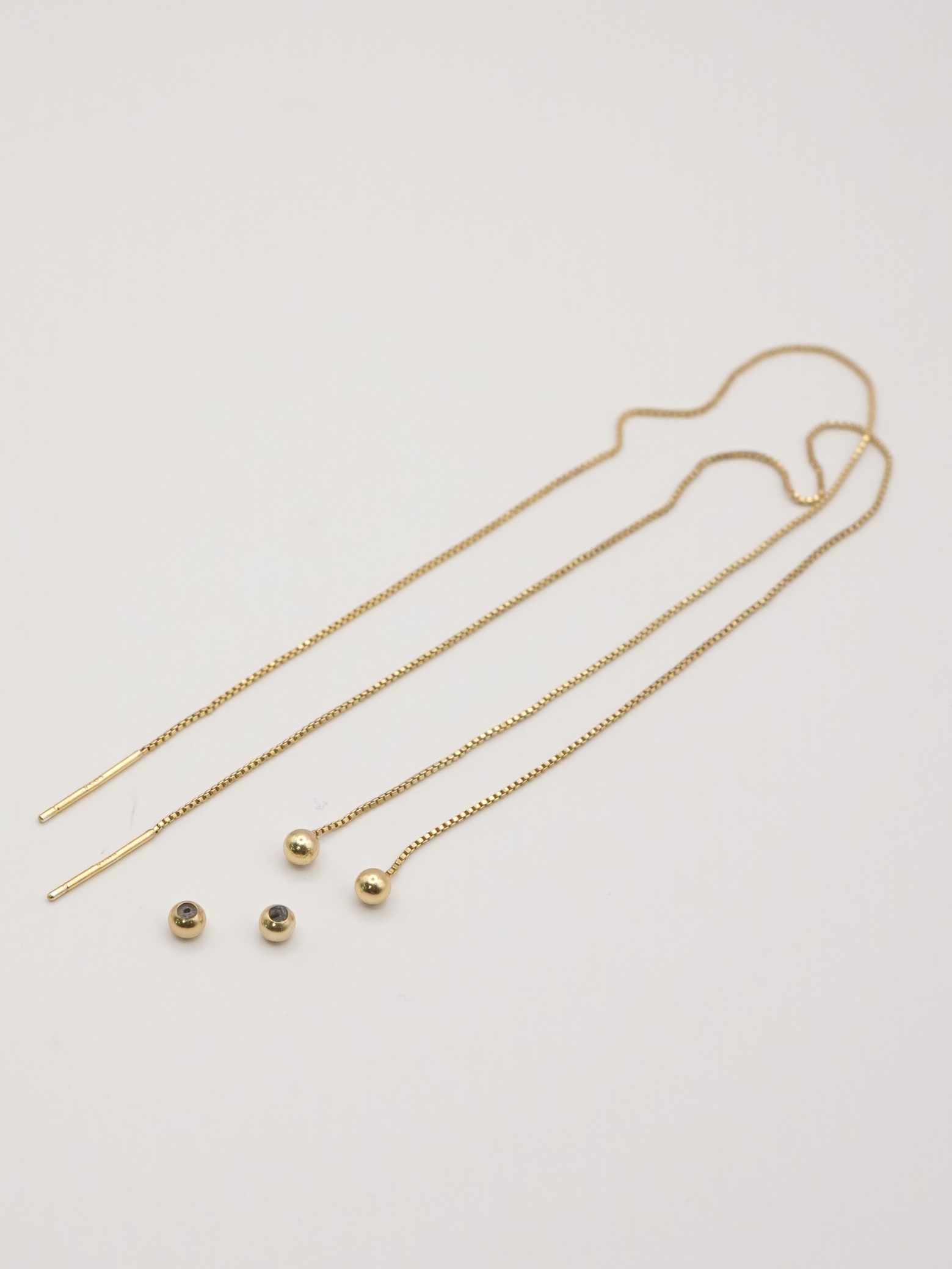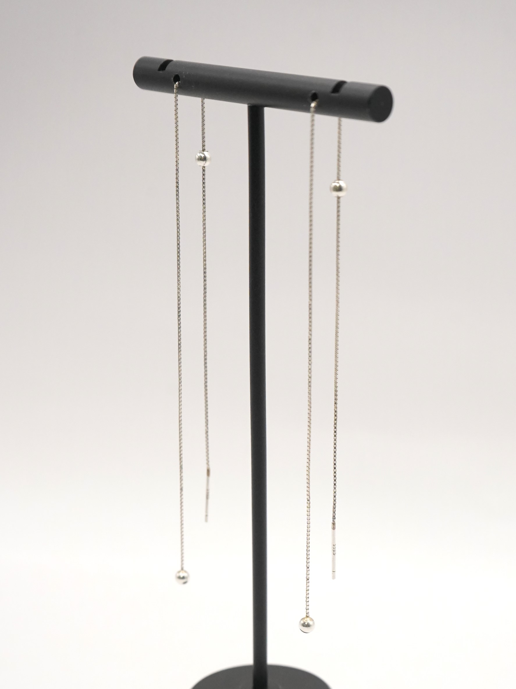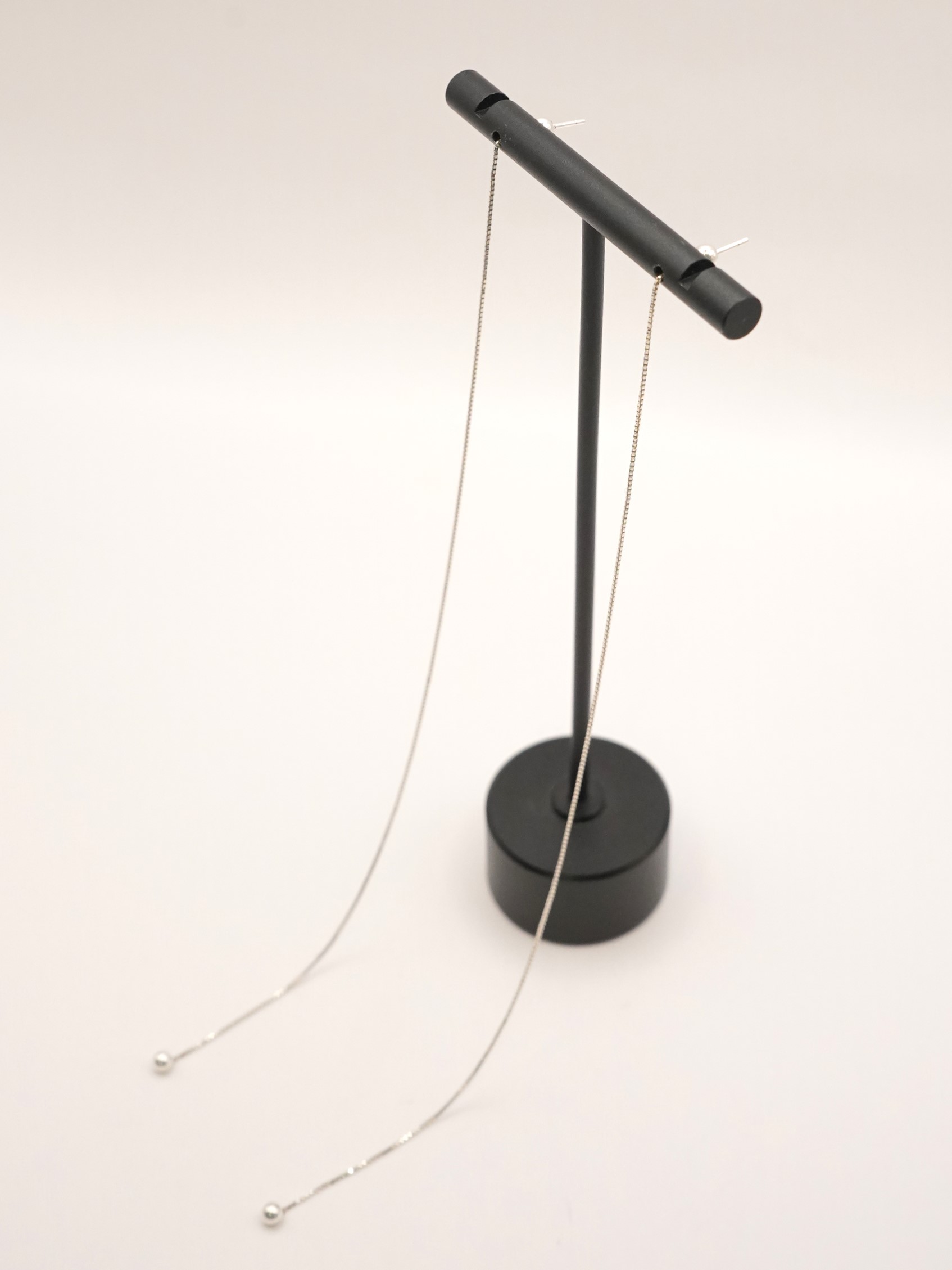 Silver925のボックスチェーンを使用したアメリカンピアス。アメリカンピアスは先端のポストから耳穴に通していただき、お好きな位置でチェーンをUターンさせる仕様になります。小さな丸玉キャッチも付いていますので、前を長くして垂らして後ろをキャッチで留めておくことも可能です。また、チェーン先端に丸玉を施していますので、丸玉部分が耳穴につくまでチェーンを後ろに垂らしてロングピアス風に着用するのもオススメです。