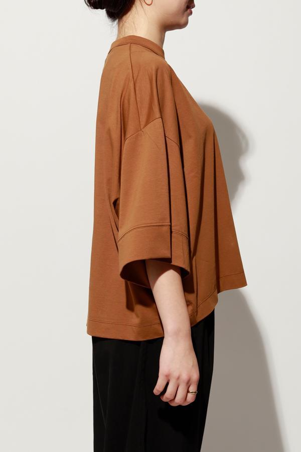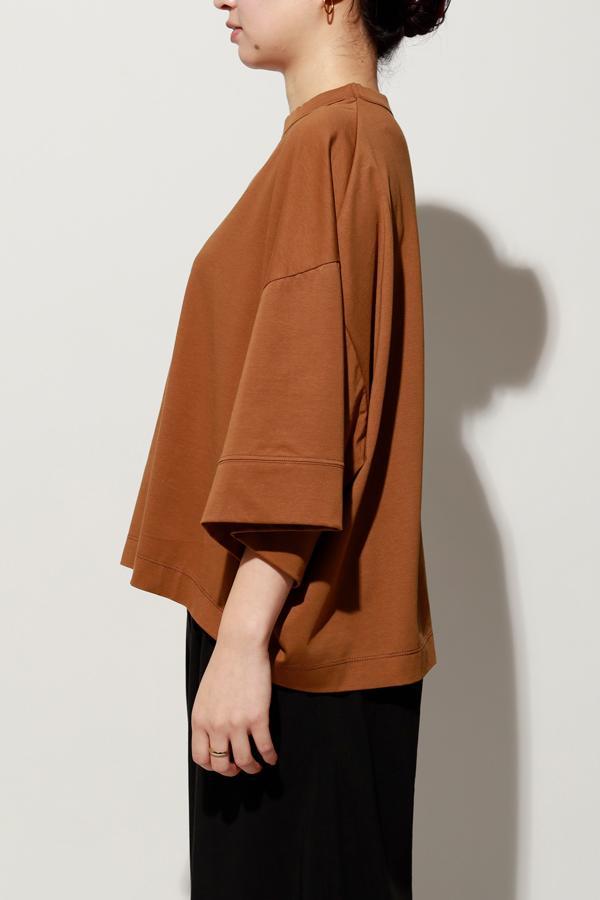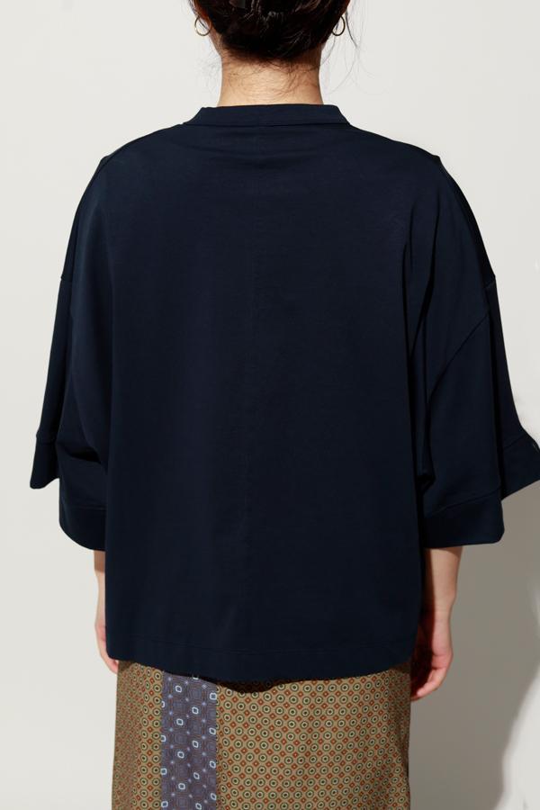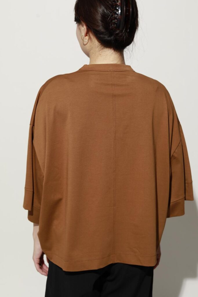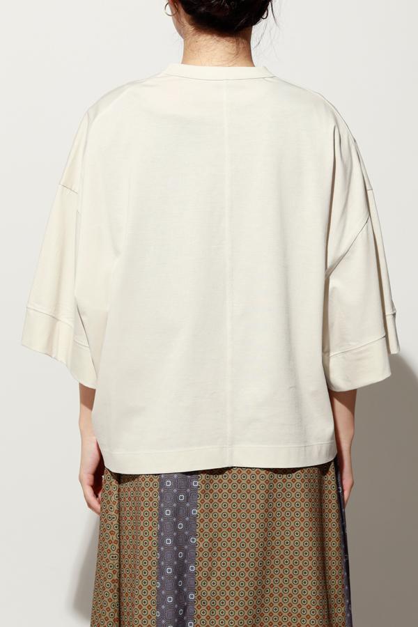 どんなボトムともバランスが取りやすい着丈に、五分袖がさり気なく二の腕をカバー。ワイドパンツやフレアスカートと合わせると、クリーンで端正なシルエットが完成します。