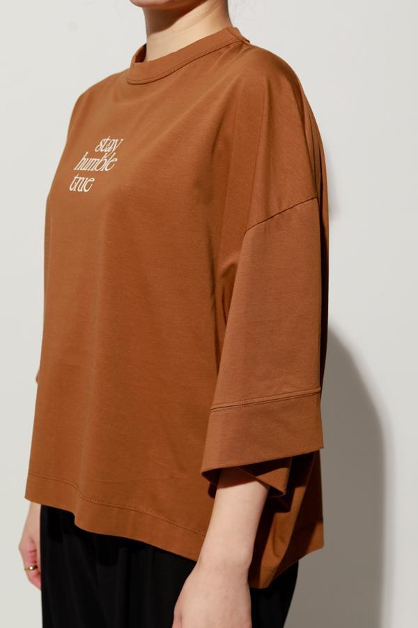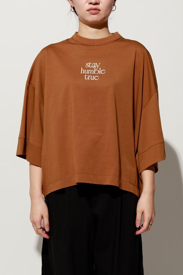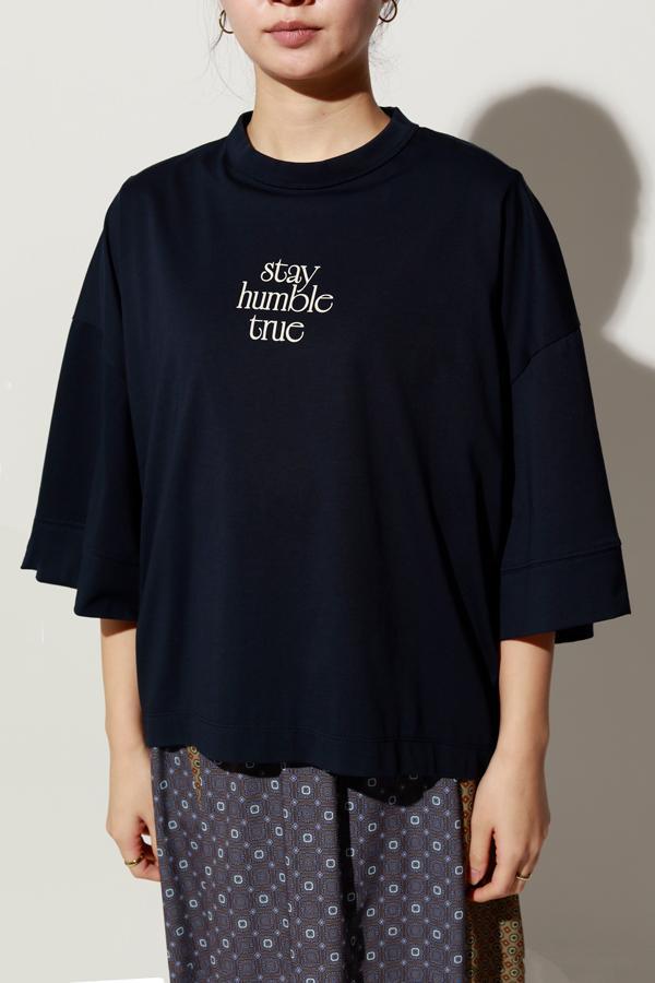 カジュアルなロゴも上品素材で大人見えするので、ゴールドアクセやレザー小物を添えるだけで洗練されたスタイルに仕上がる一枚です。