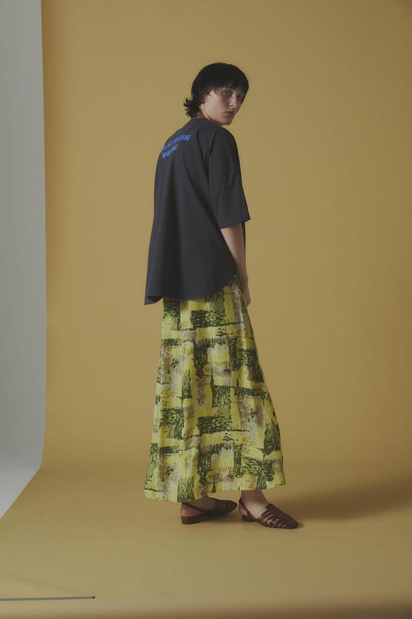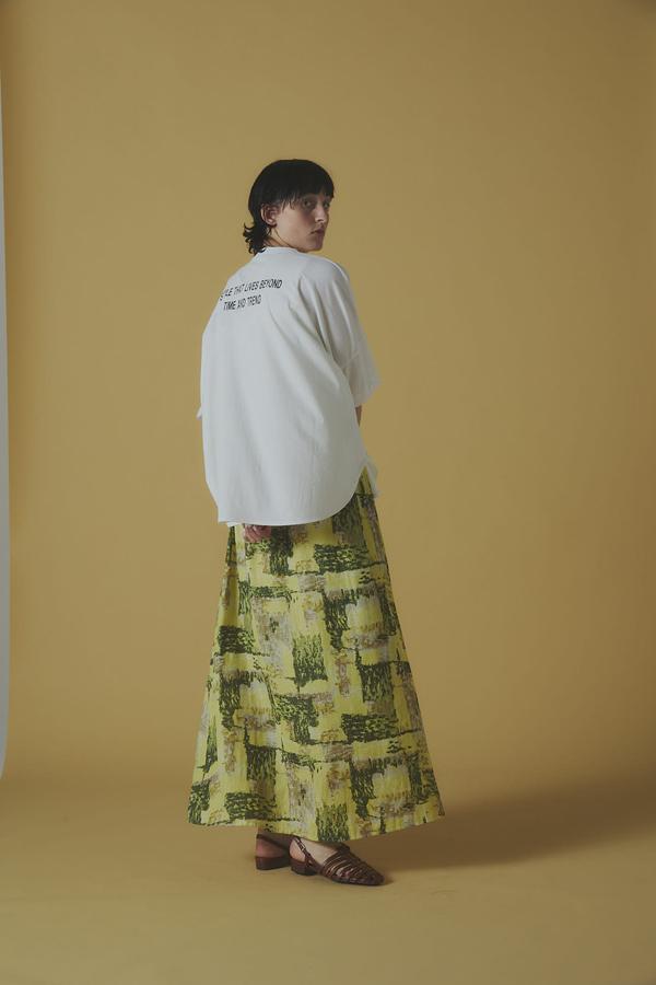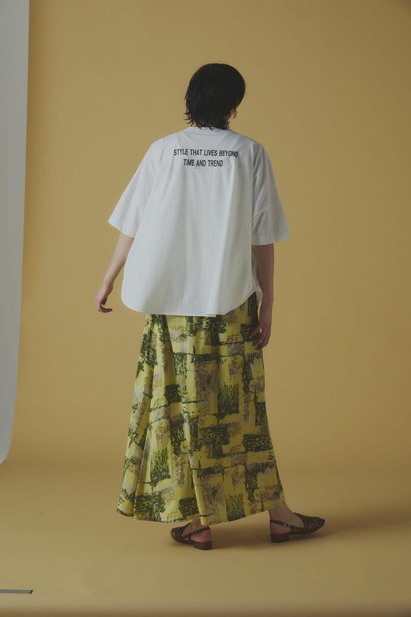 前はすっきり見せつつ、裾を軽くインしてバックプリントをさり気なく見せるのが今年らしい着こなし。