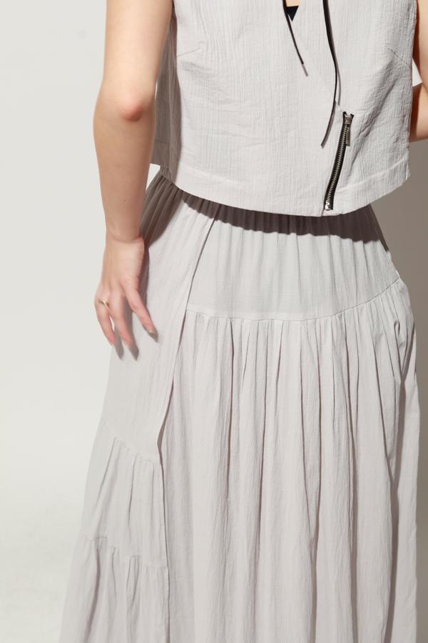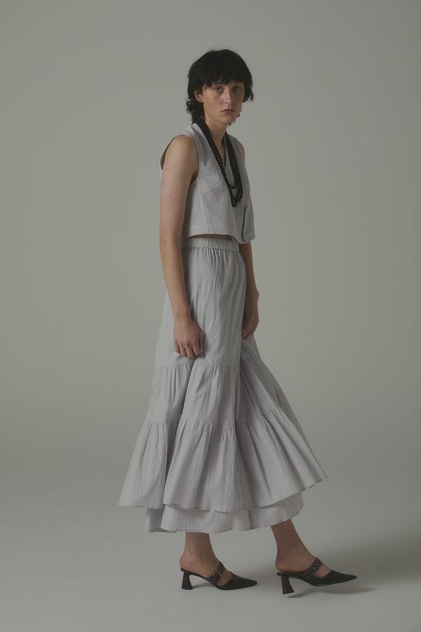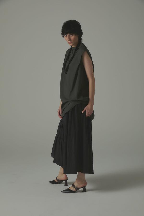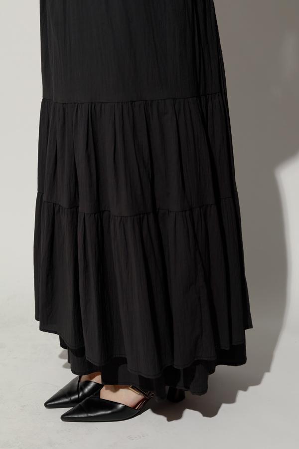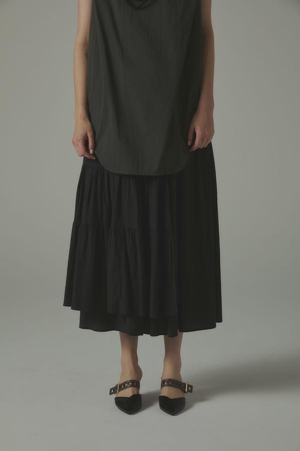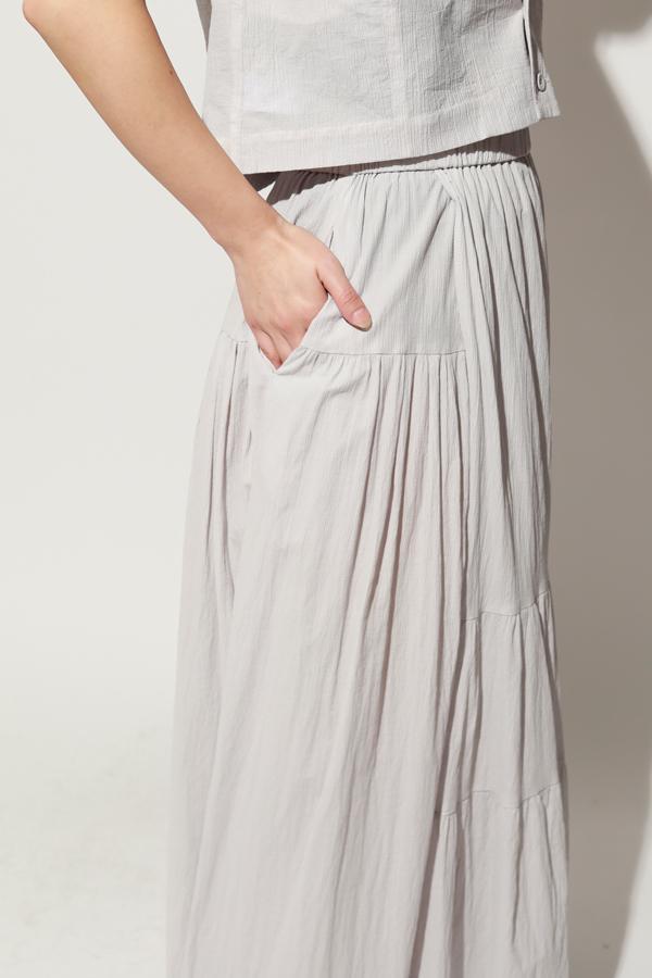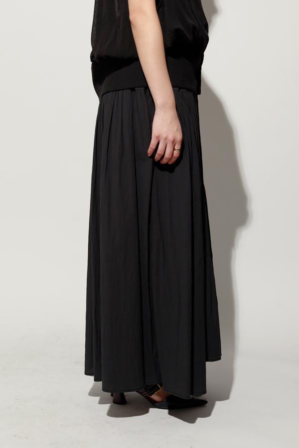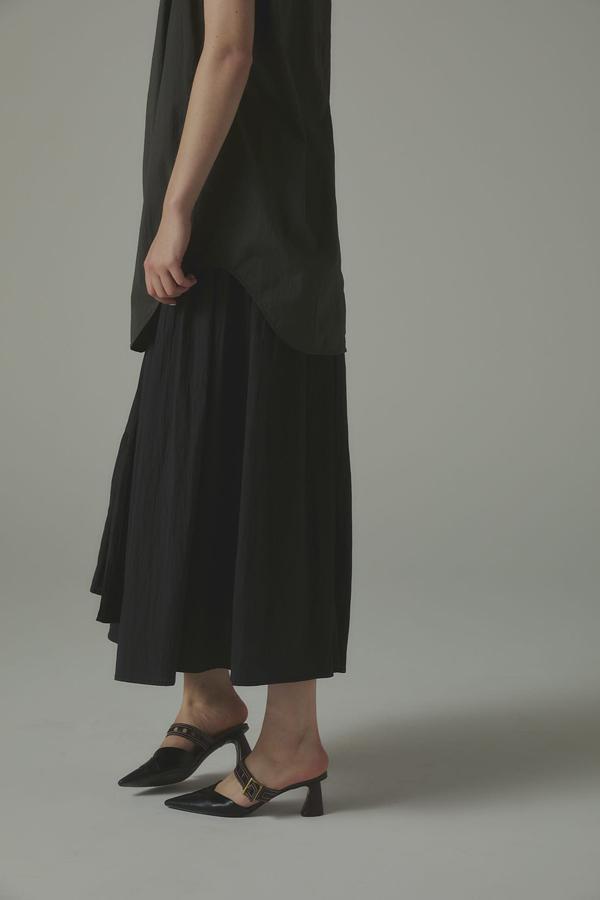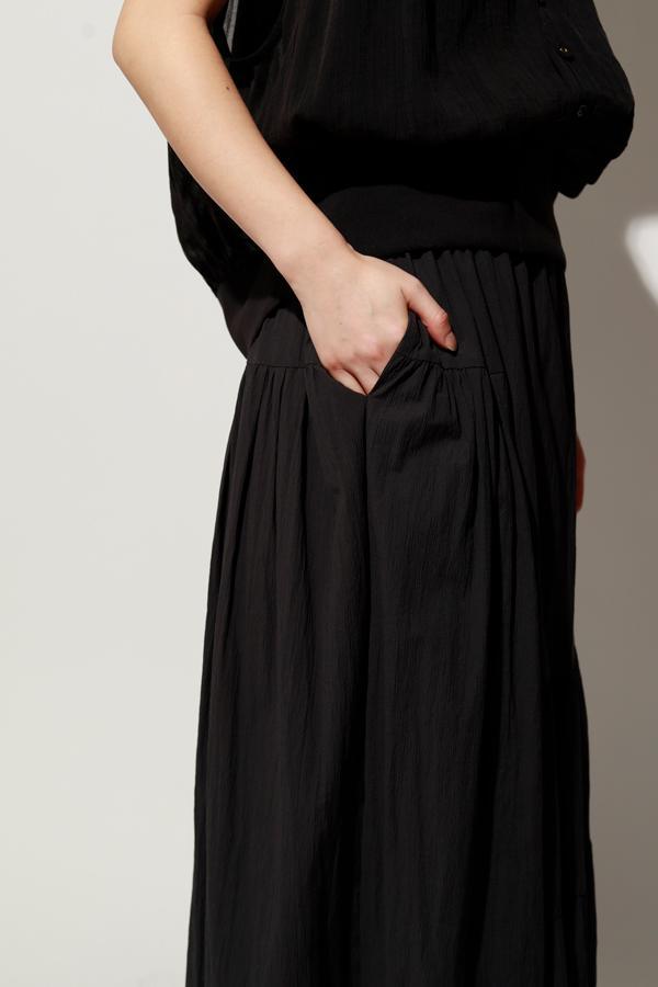 表地を二枚重ねることで動きに奥行きが生まれ、歩くたびに軽やかな立体感を描きます。ウエストはゴム仕様でリラックスでき、体型を選ばず自然にシルエットを整えてくれる万能さも魅力。