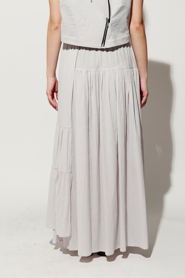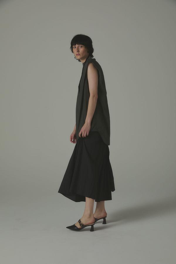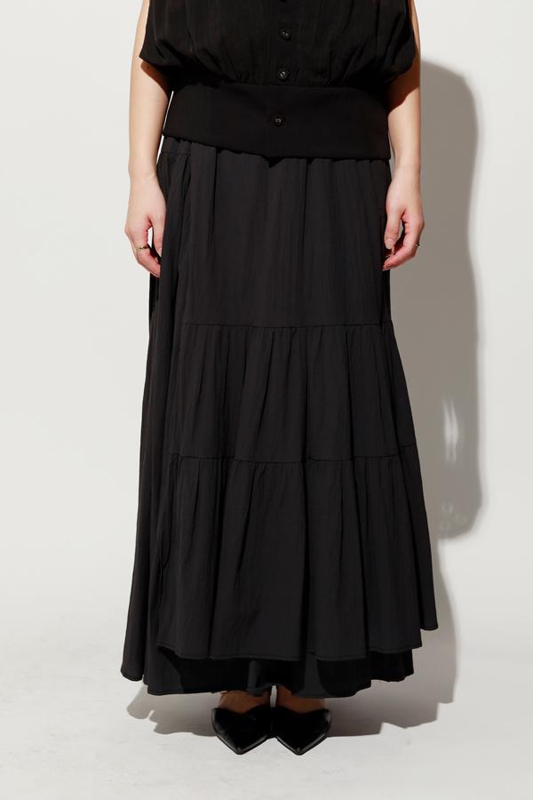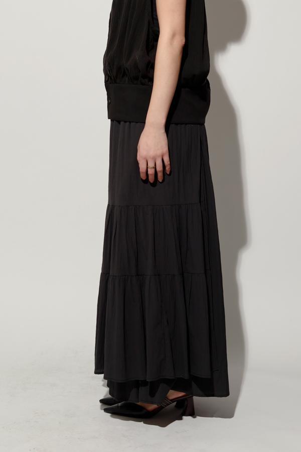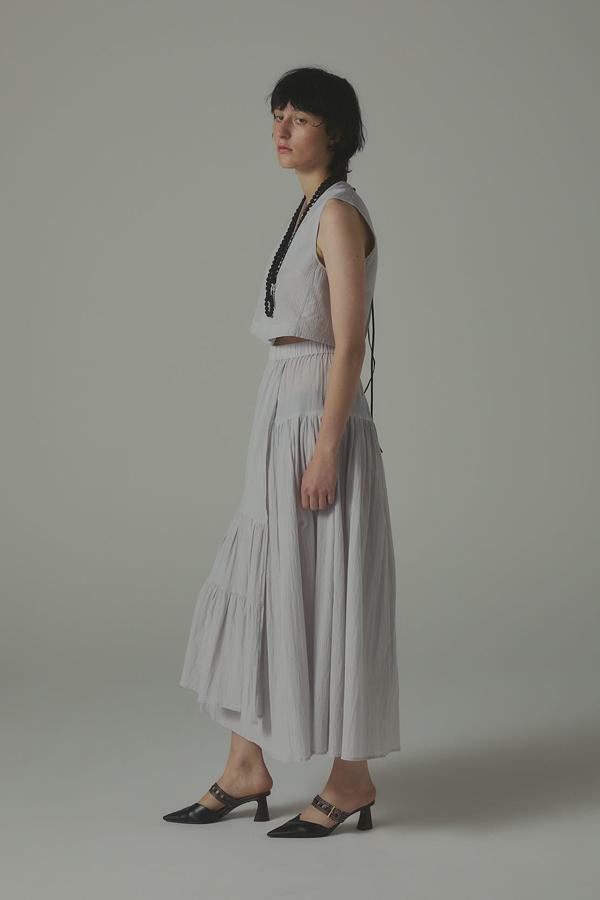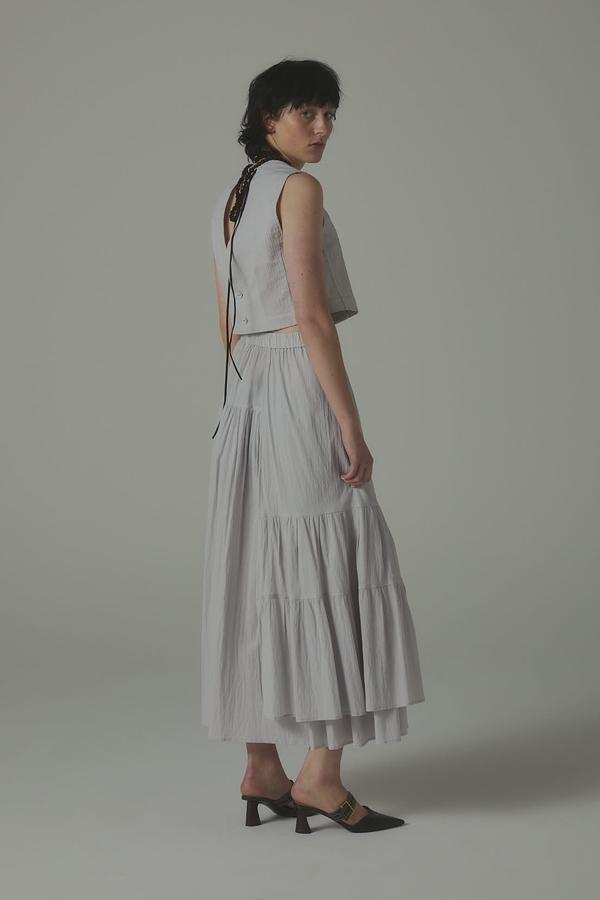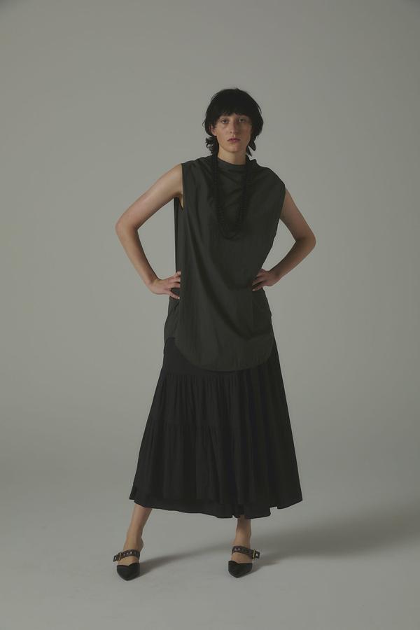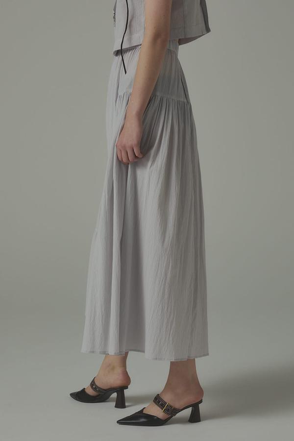表地を二枚重ねることで動きに奥行きが生まれ、歩くたびに軽やかな立体感を描きます。ウエストはゴム仕様でリラックスでき、体型を選ばず自然にシルエットを整えてくれる万能さも魅力。