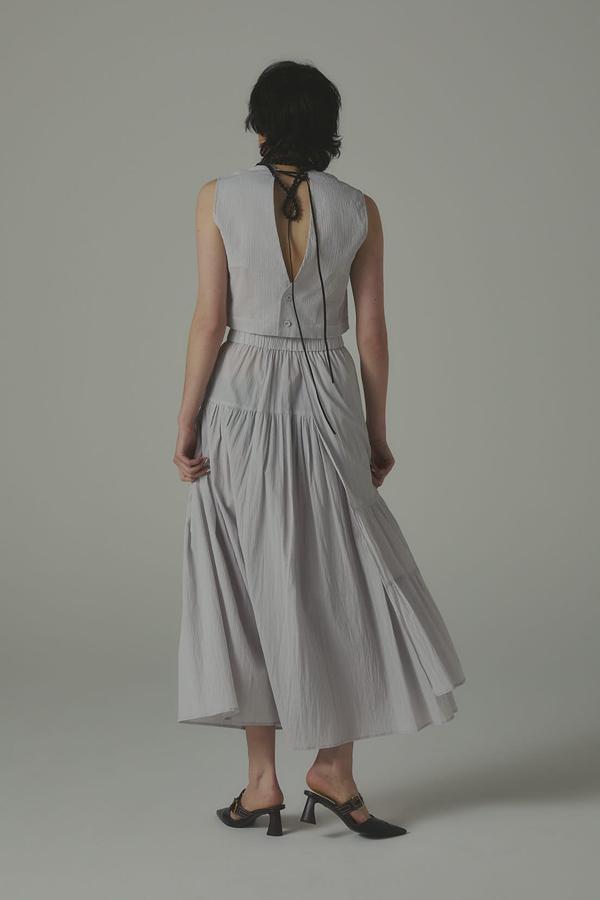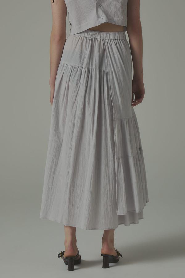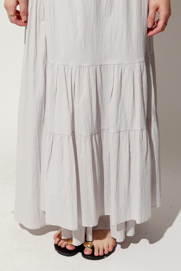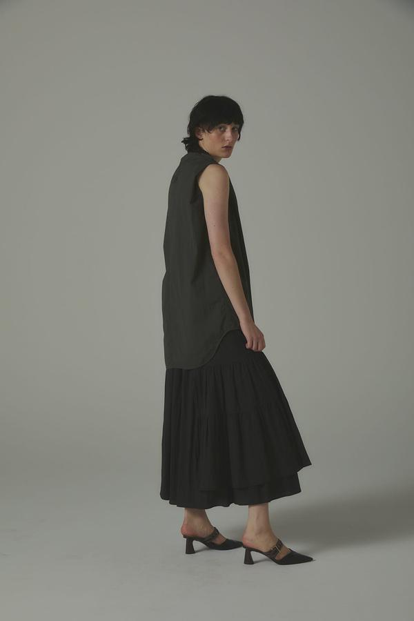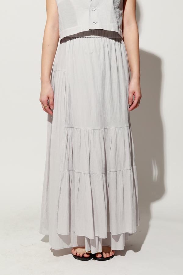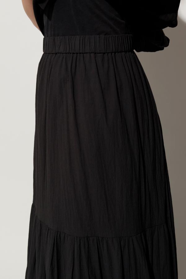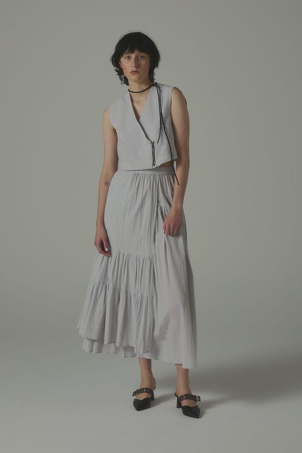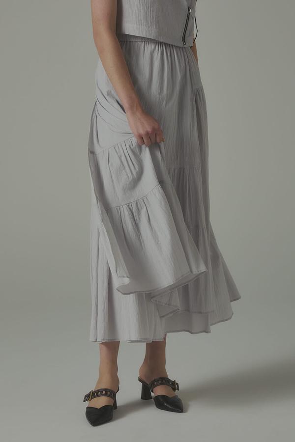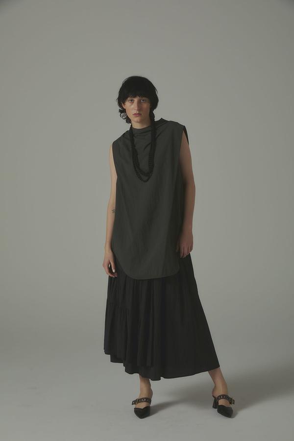 表地を二枚重ねることで動きに奥行きが生まれ、歩くたびに軽やかな立体感を描きます。ウエストはゴム仕様でリラックスでき、体型を選ばず自然にシルエットを整えてくれる万能さも魅力。