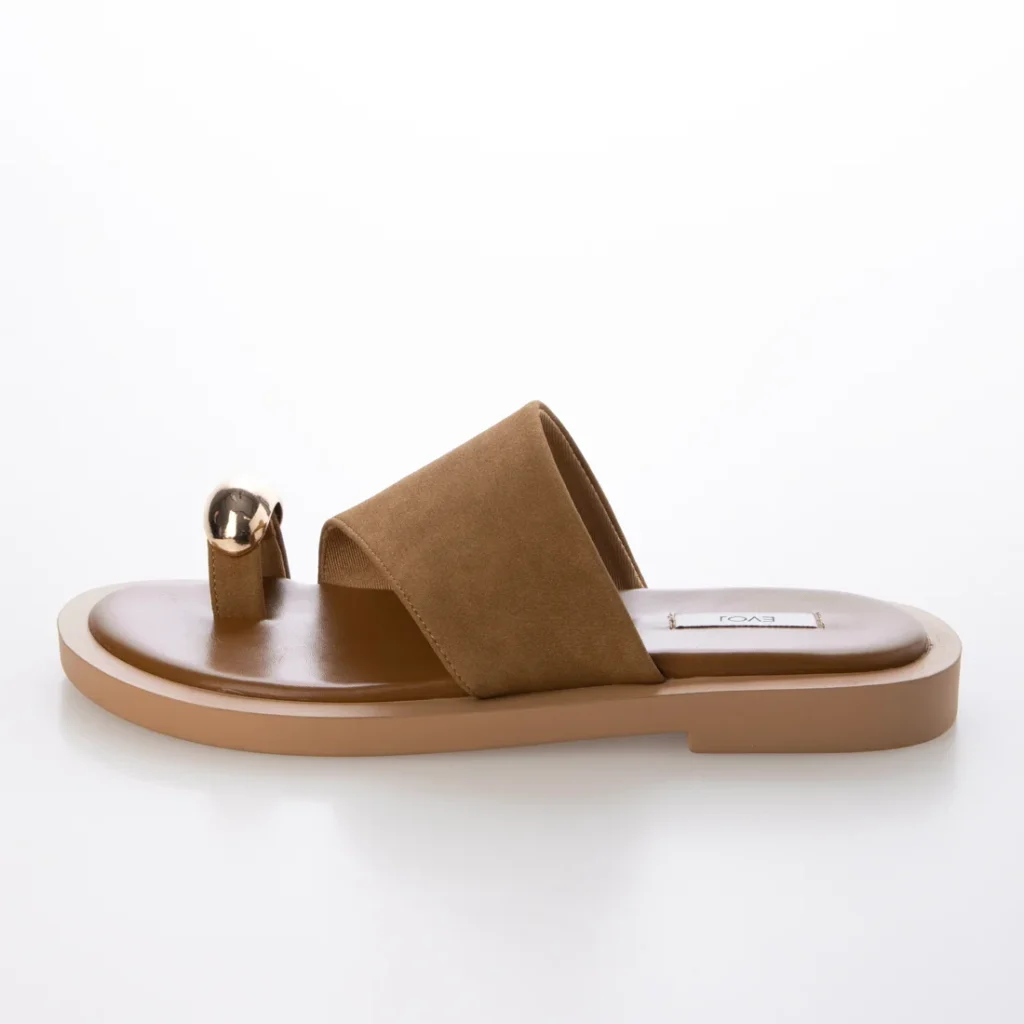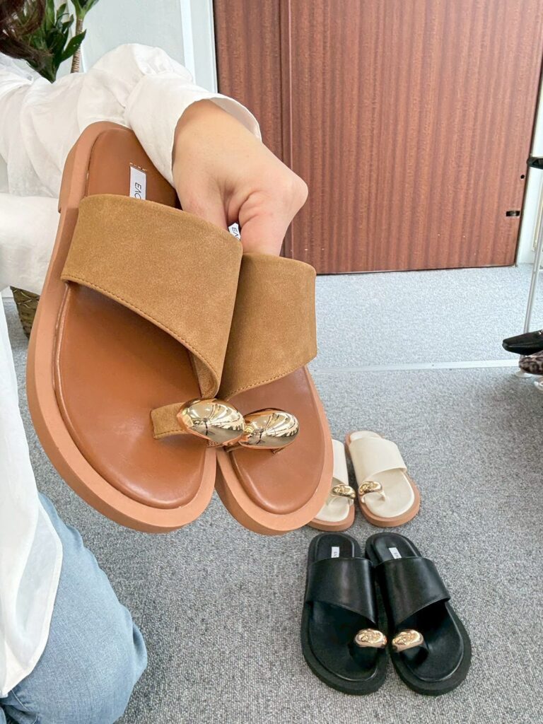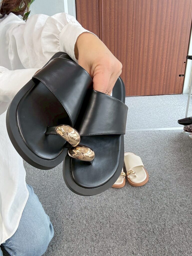 ★大きなゴールドパーツが目を惹くトングサンダル。トレンドのナローストラップを合わせ、こなれ感のある大人っぽい印象に仕上げました。パーツ部分は本革を使用しているため、足馴染みが良く高級感があるのもポイント!ボリュームのあるソールは驚くほど軽量で、スタイルアップを叶えつつ安定感のある履き心地です◎