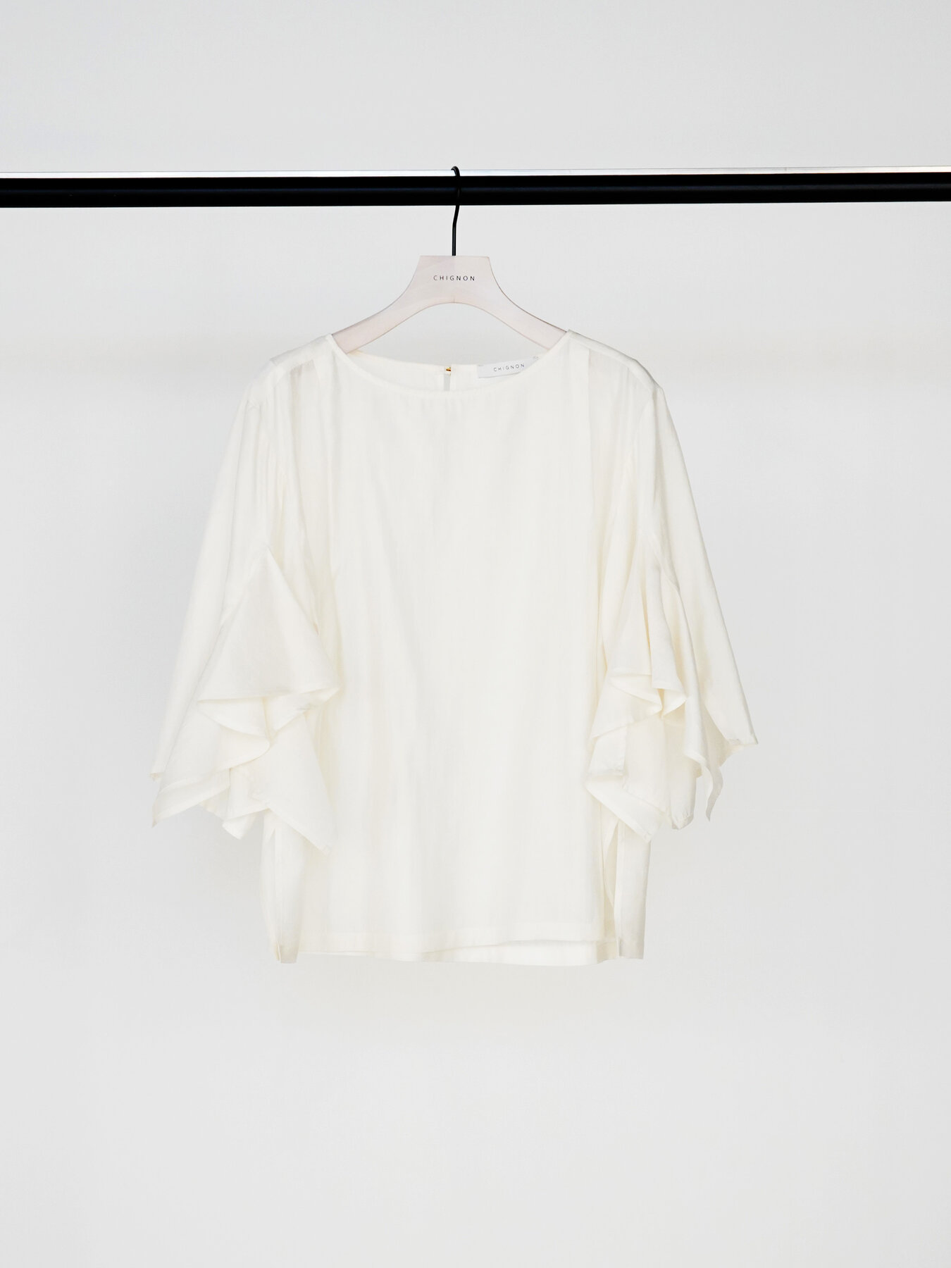 動くたびに揺れるフリルが女性らしさを引き立て、スリットを入れることで抜け感のある軽やかな印象に仕上げました。甘くなりすぎないよう、パターンにこだわった立体的なディテールがポイントです。