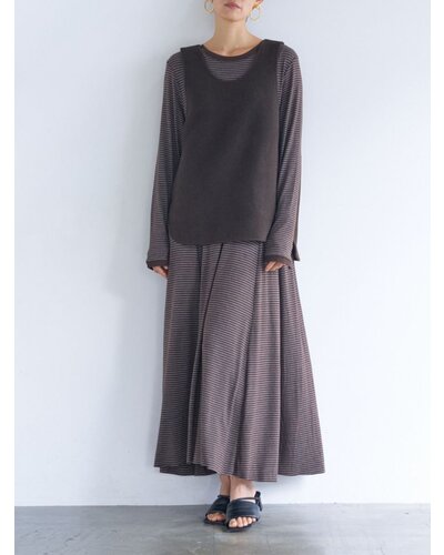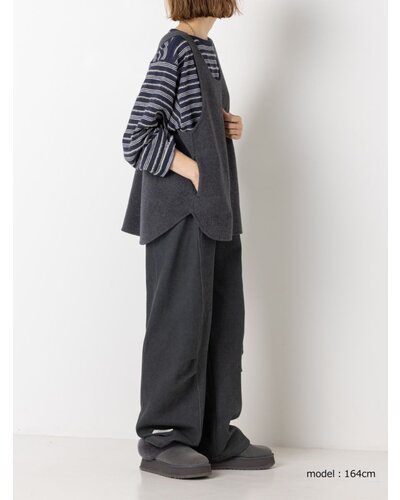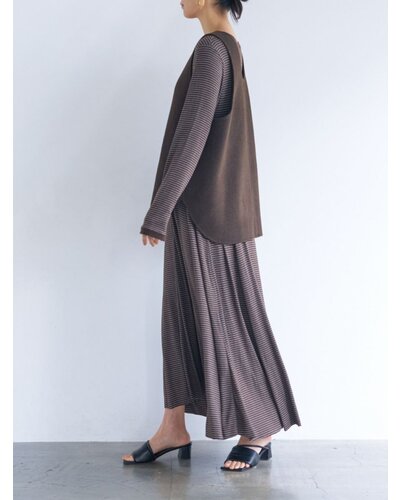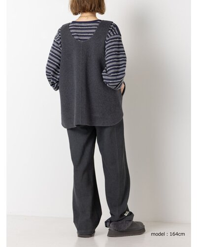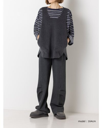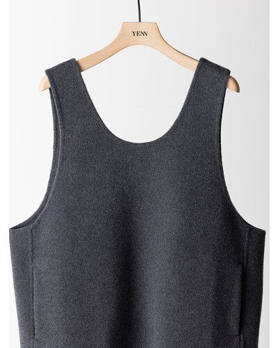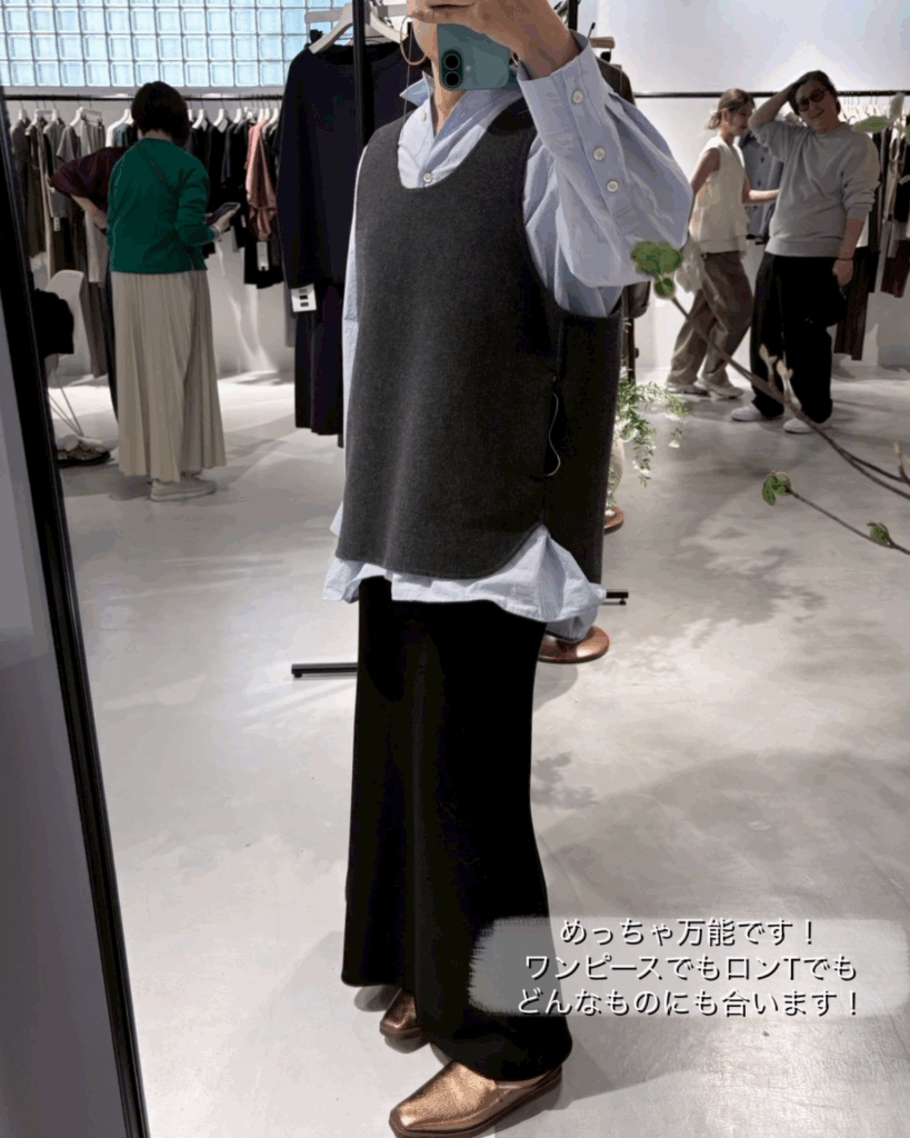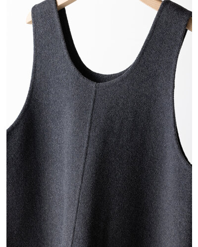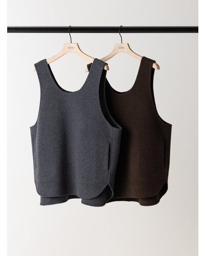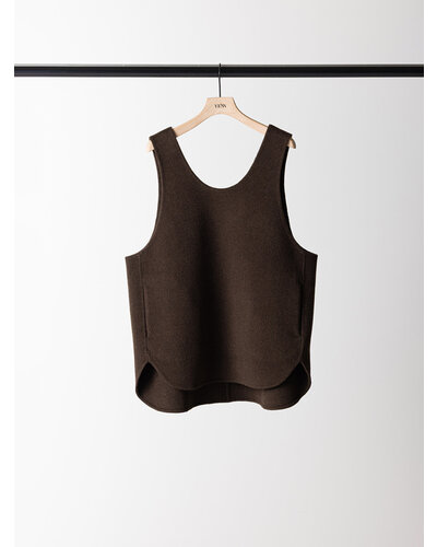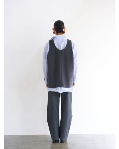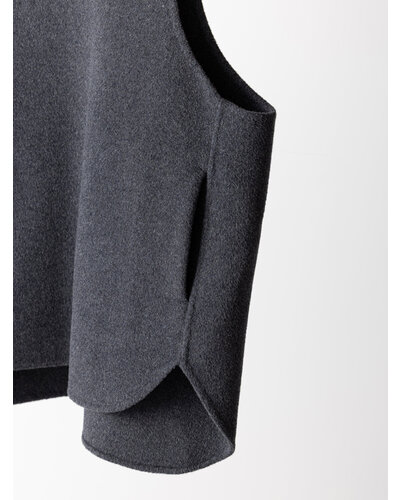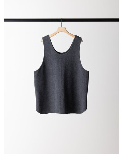 リバー仕立てのプルオーバー型ベストです。 リバー仕立てとは、2枚の生地を貼り合わせ、手作業でまつり縫いをすることで、縫い目が見えない洗練されたデザインになる仕立てで、軽くて柔らかい着心地が特徴です。 ウール70%の高級感のある生地を使用、暖かさと軽やかさを両立したなめらかな肌触りが特徴の生地です。 深く衿ぐりをあけたUネックデザインと大胆にあいたアームホールは中に着るものを選ばず、着脱もイージーにしていただけます。通常はコート等に使用する厚手で上質な素材を使用、ミニマルなデザインながら存在感があり、シンプルな日常のコーディネートを格上げしてくれるアイテムです。