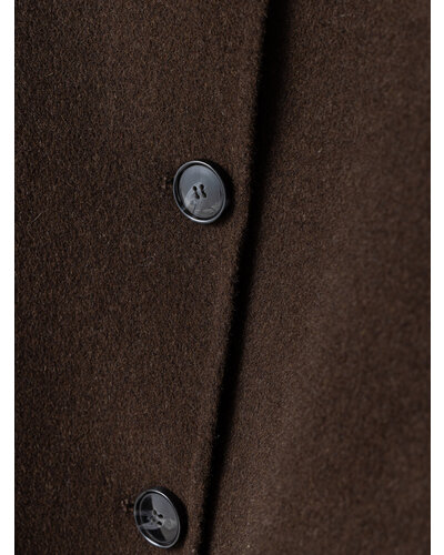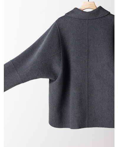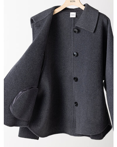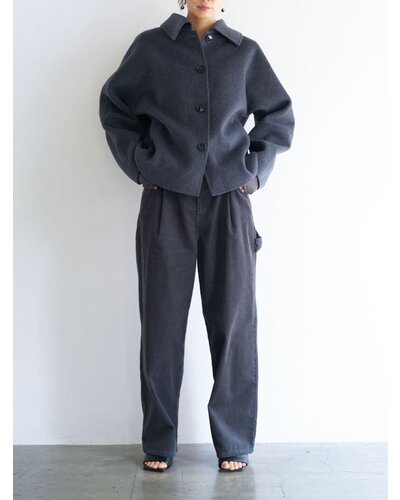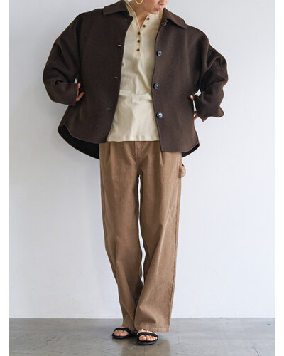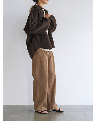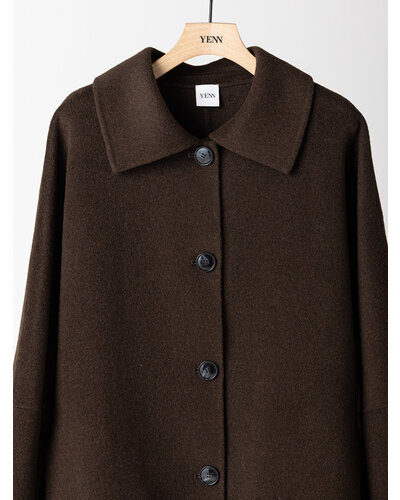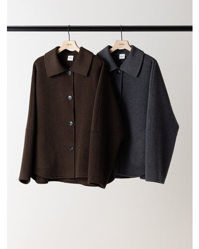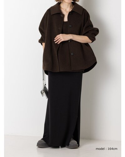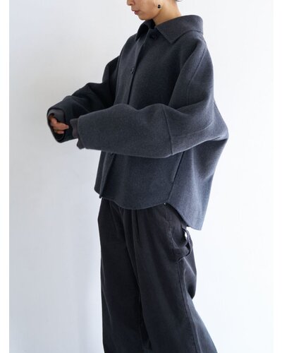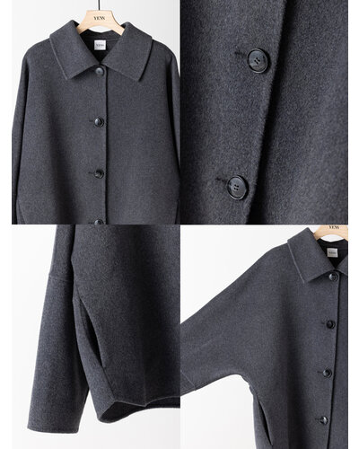 リバー仕立ての衿付きミドル丈コートです。 リバー仕立てとは、2枚の生地を貼り合わせ、手作業でまつり縫いをすることで、縫い目が見えない洗練されたデザインになる仕立てで、軽くて柔らかい着心地が特徴です。 ウール70%の高級感のある生地を使用、暖かさと軽やかさを両立したなめらかな肌触りが特徴の生地です。 シンプルなステンカラー風のデザインがポイントできちんと感がありつつ主張しすぎないバランスに。 コンパクトな丈感と程よくゆとりのあるボックスシルエットで、装飾を極力省いたミニマルな設計に。素材の上質感が際立つようデザインされています。きれいめからカジュアルまで幅広いスタイリングに対応。軽やかな着心地で、季節の変わり目にも活躍します。
