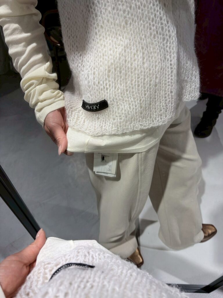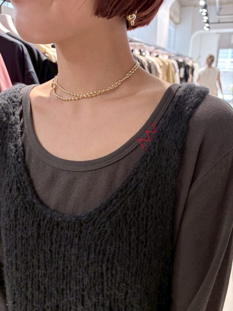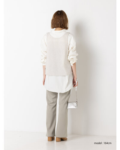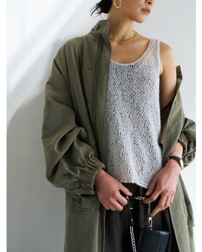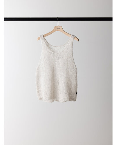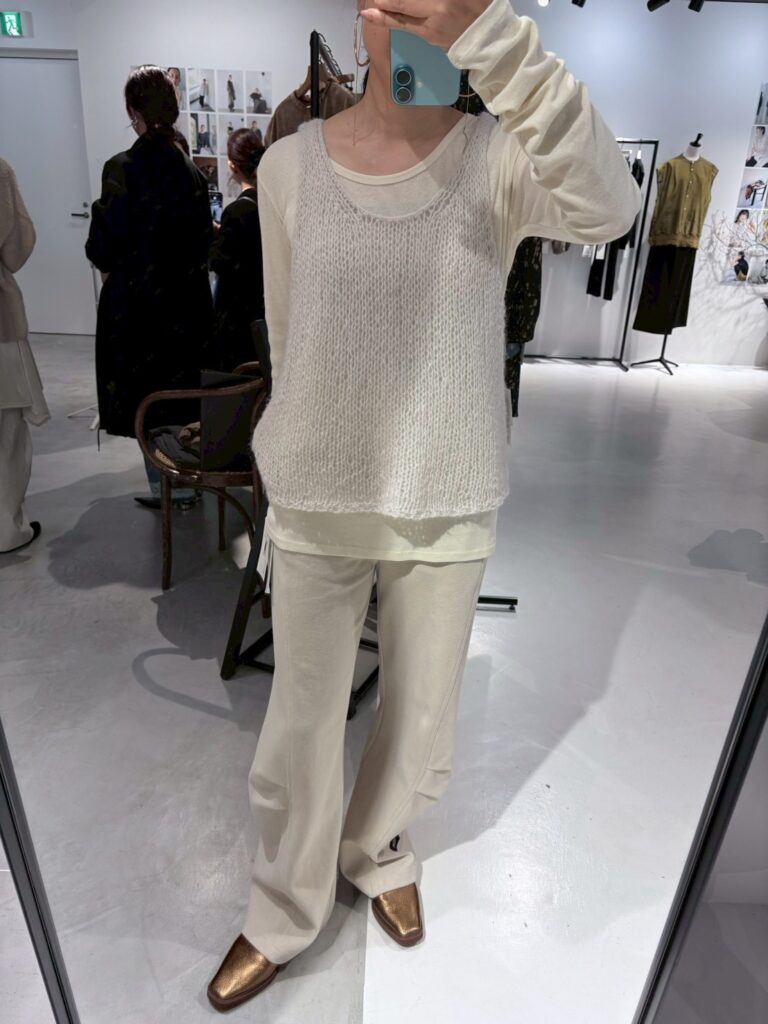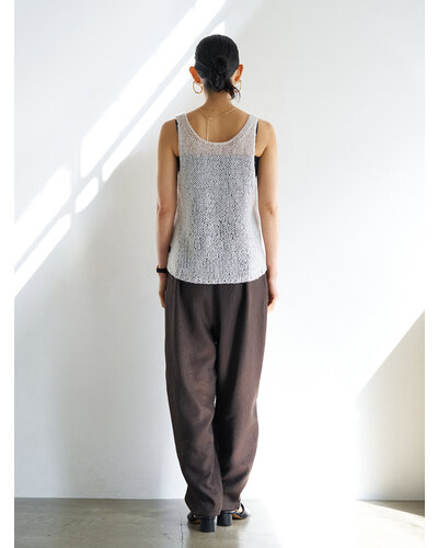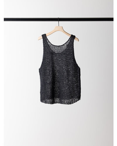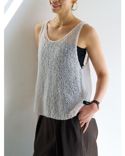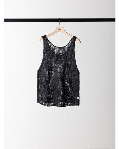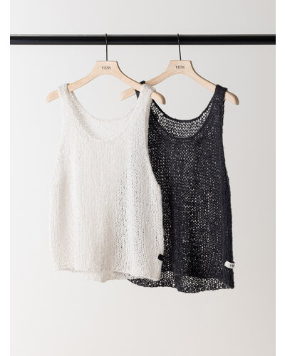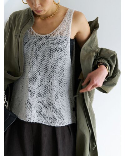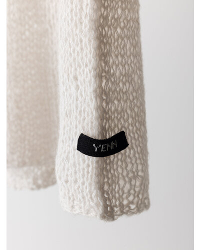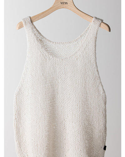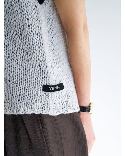 ふんわりした風合いが特徴のモヘア混の糸を使用したニットベストです。 手編みで編み立てて1目1目を大きく、そして軽く、シンプルながらも編地で魅せるベストです。 透け感があるのでまだ暑い時期からTシャツやタンクトップの上に重ねて秋の空気を感じるスタイリングに。 シャツの上に重ねても、今っぽさをプラスしてくれるアイテムです。 裾に施したYENNロゴテープもアクセントに。
