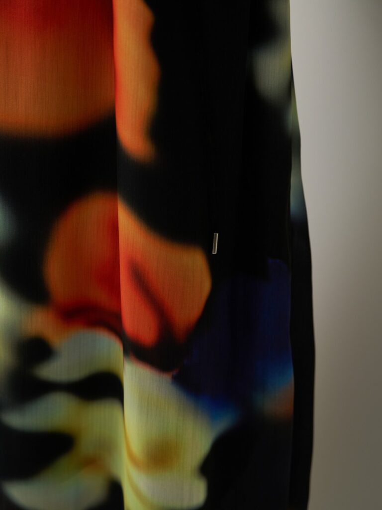 にじむように広がるブルーやオレンジの色彩が重なり、動くたびに柄の表情が変わる存在感のある一枚です。