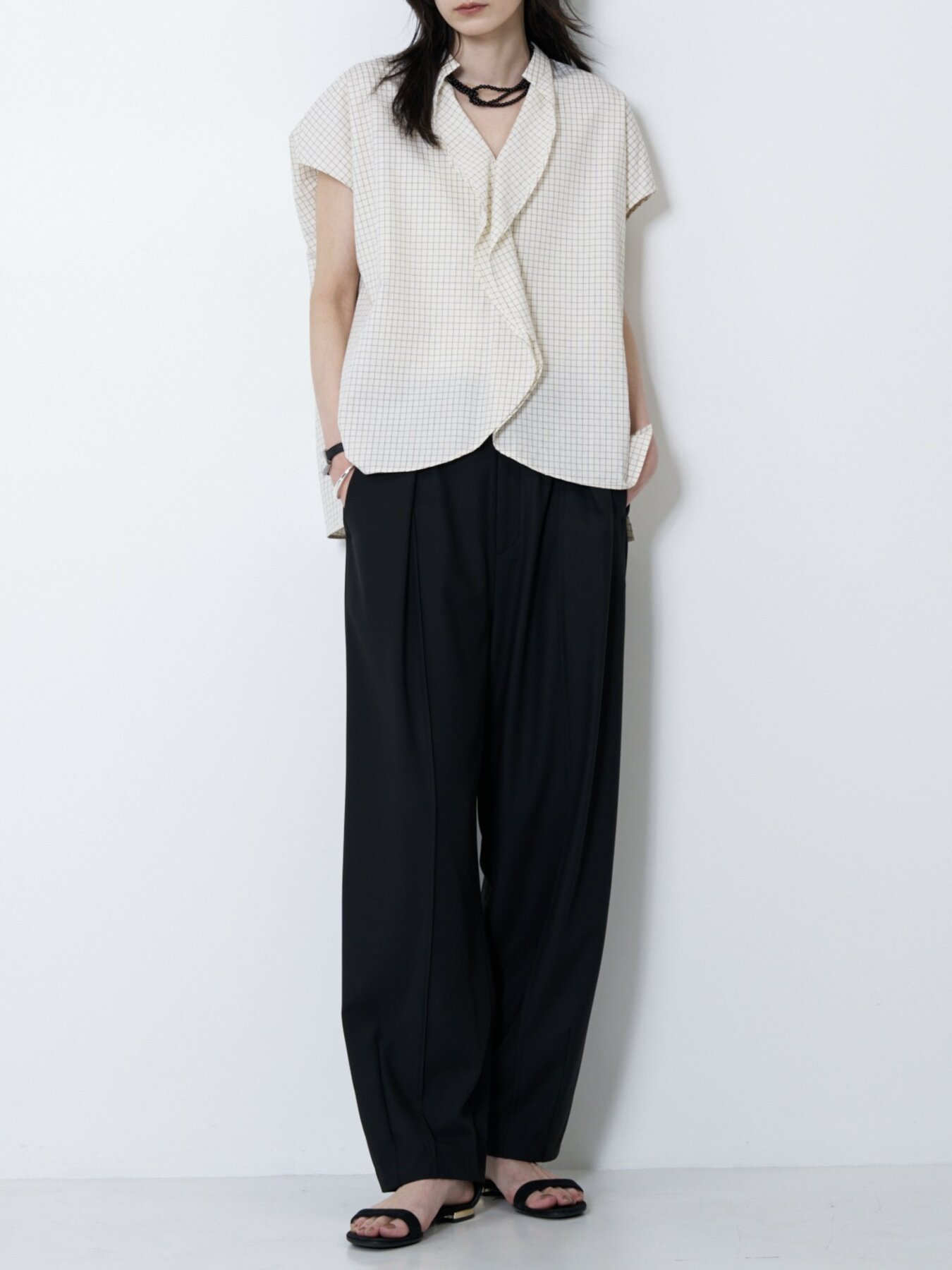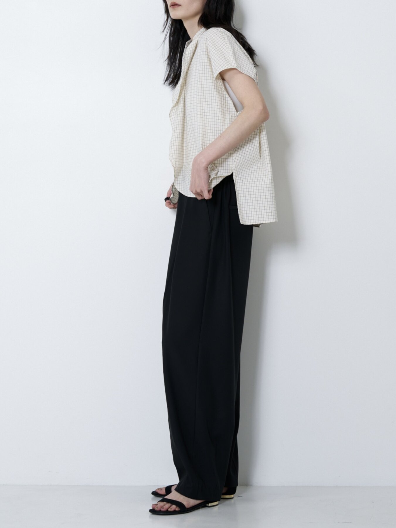 フロントに入れたピンタックが縦ラインを強調し、リラックス感がありながらもすっきりとした印象に仕上げています。