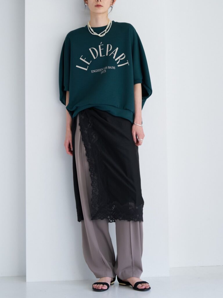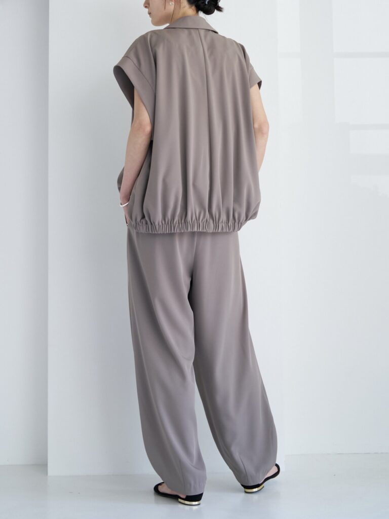 トップスをインしてもアウトでも決まりやすく、同素材で企画した構築的なビスチェ(1263-624MK)やジレ(4263-625MK)とのセットアップスタイルもおすすめ。