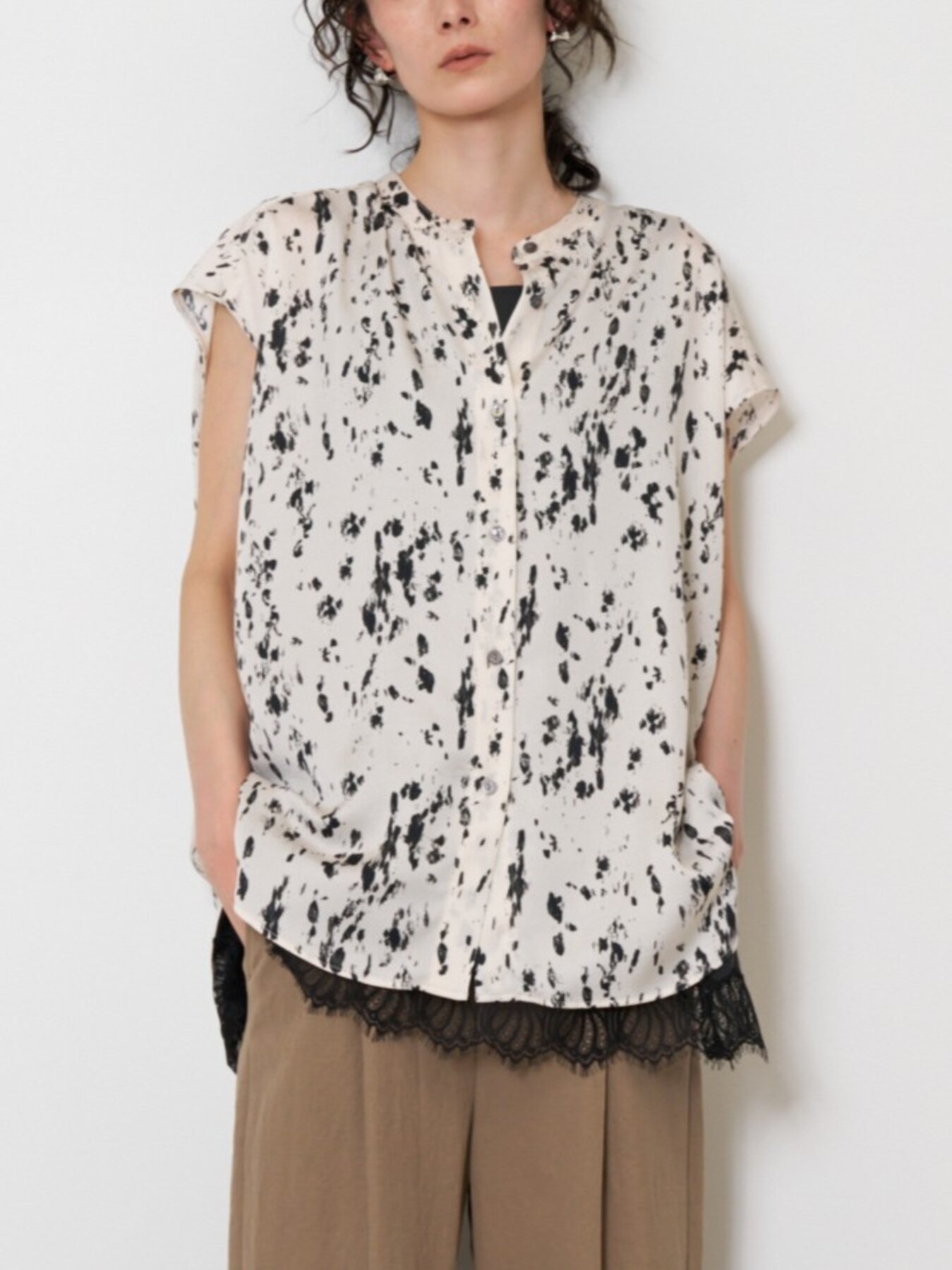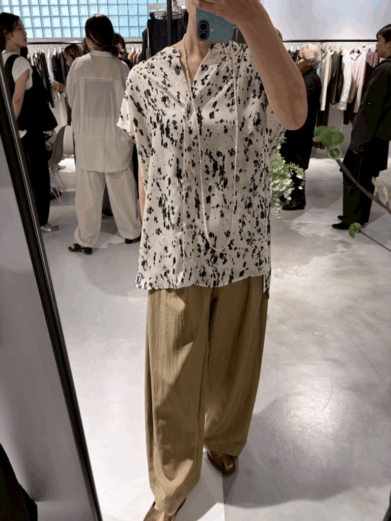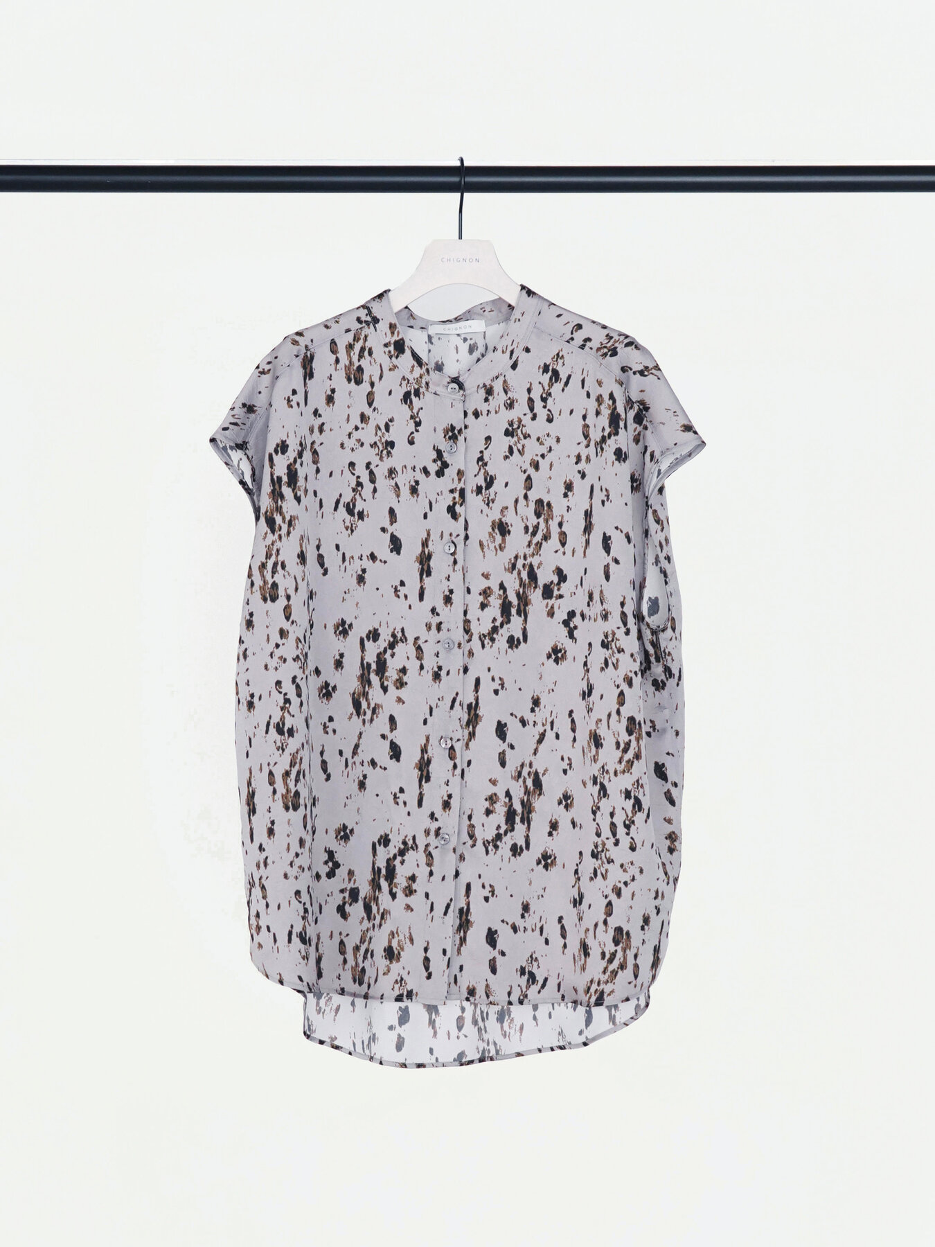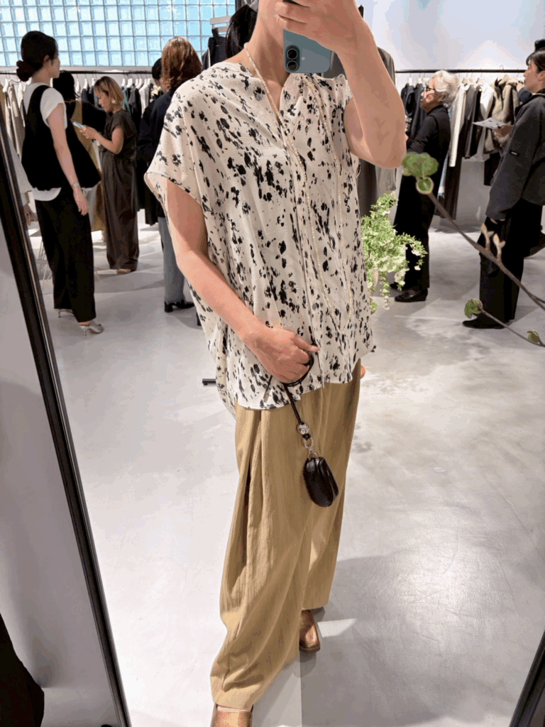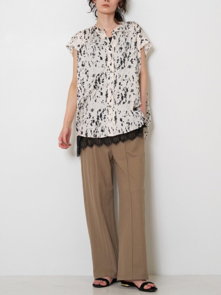落ち感のあるポリエステル素材を使用した、上品なレオパード柄ブラウス。派手になりすぎない大人なレオパード柄が、スタイリングにさりげないアクセントをプラスします。