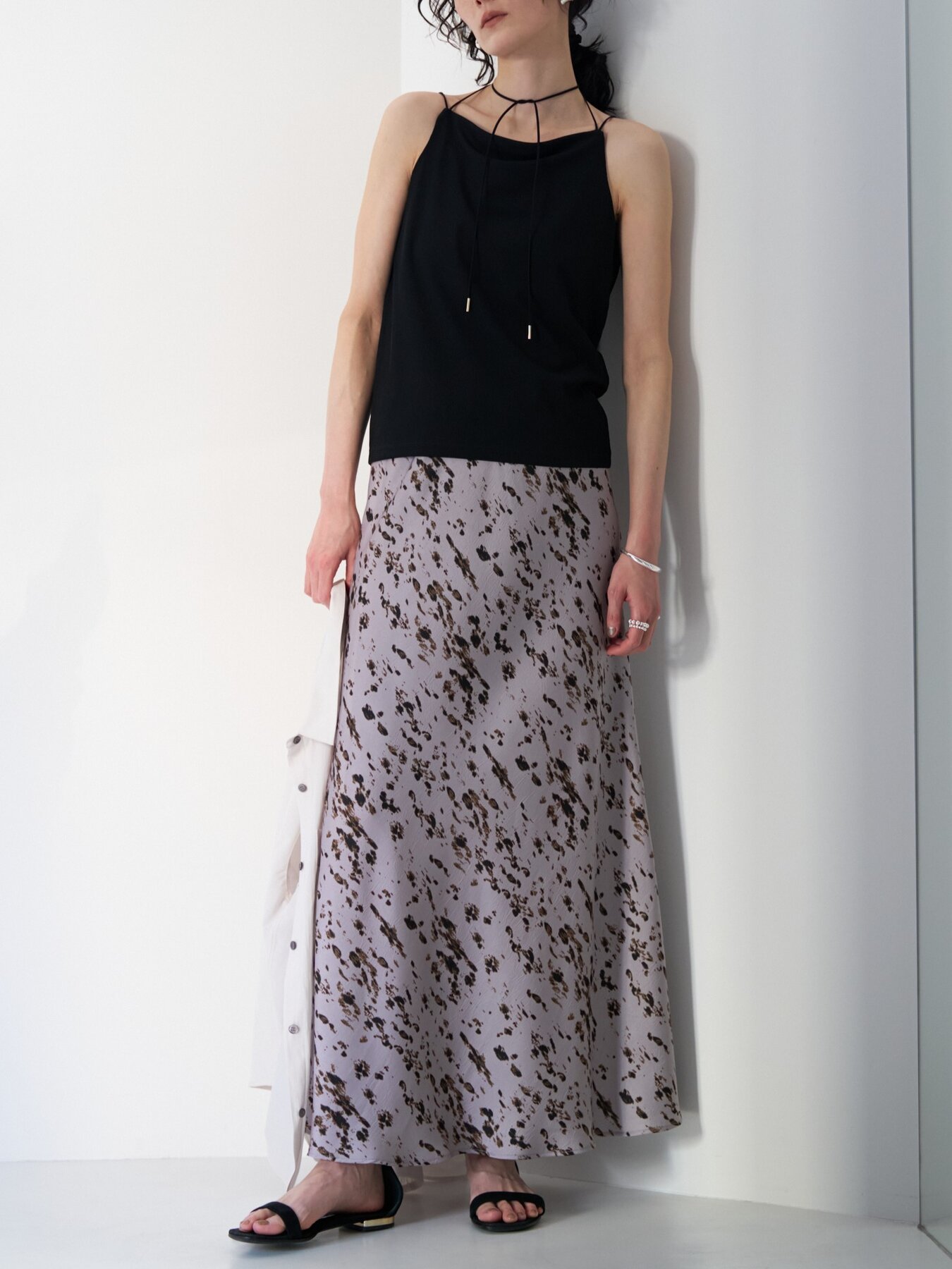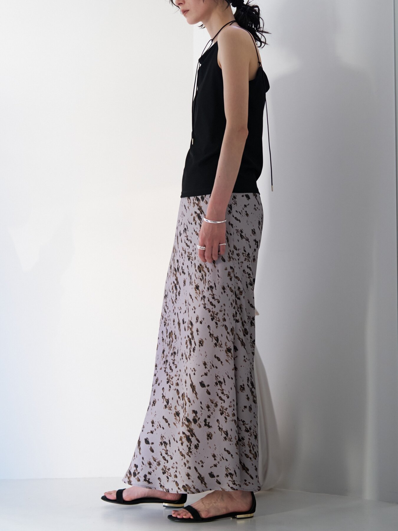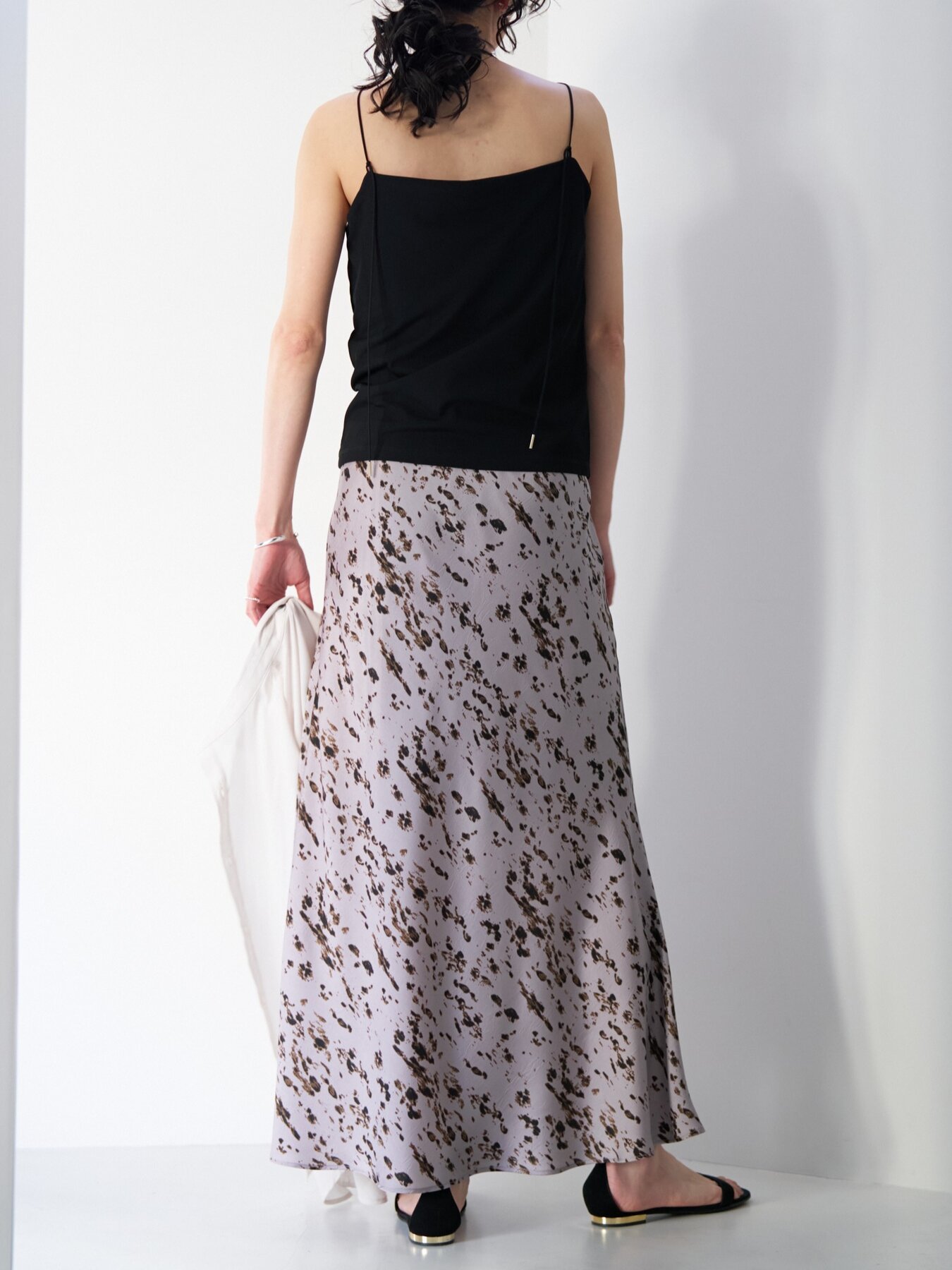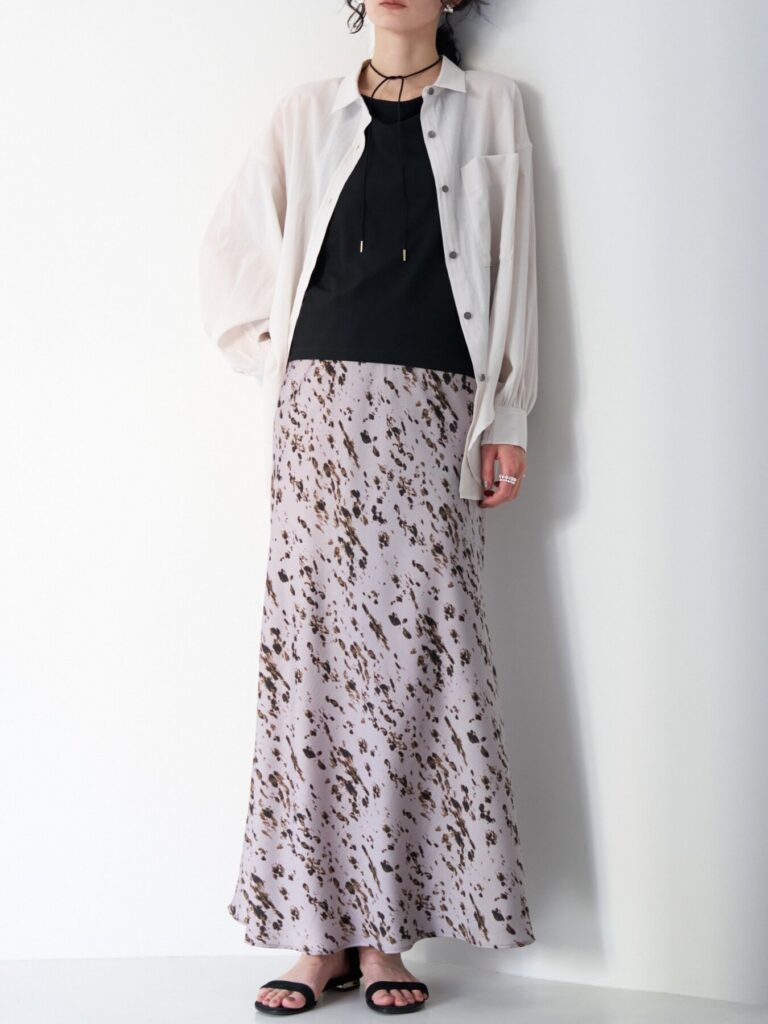 腰まわりはすっきりと、裾にかけて広がるマーメイドシルエットが女性らしいラインを演出。動くたびに揺れる軽やかなドレープ感も魅力です。