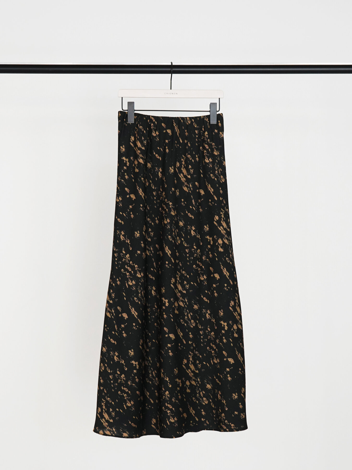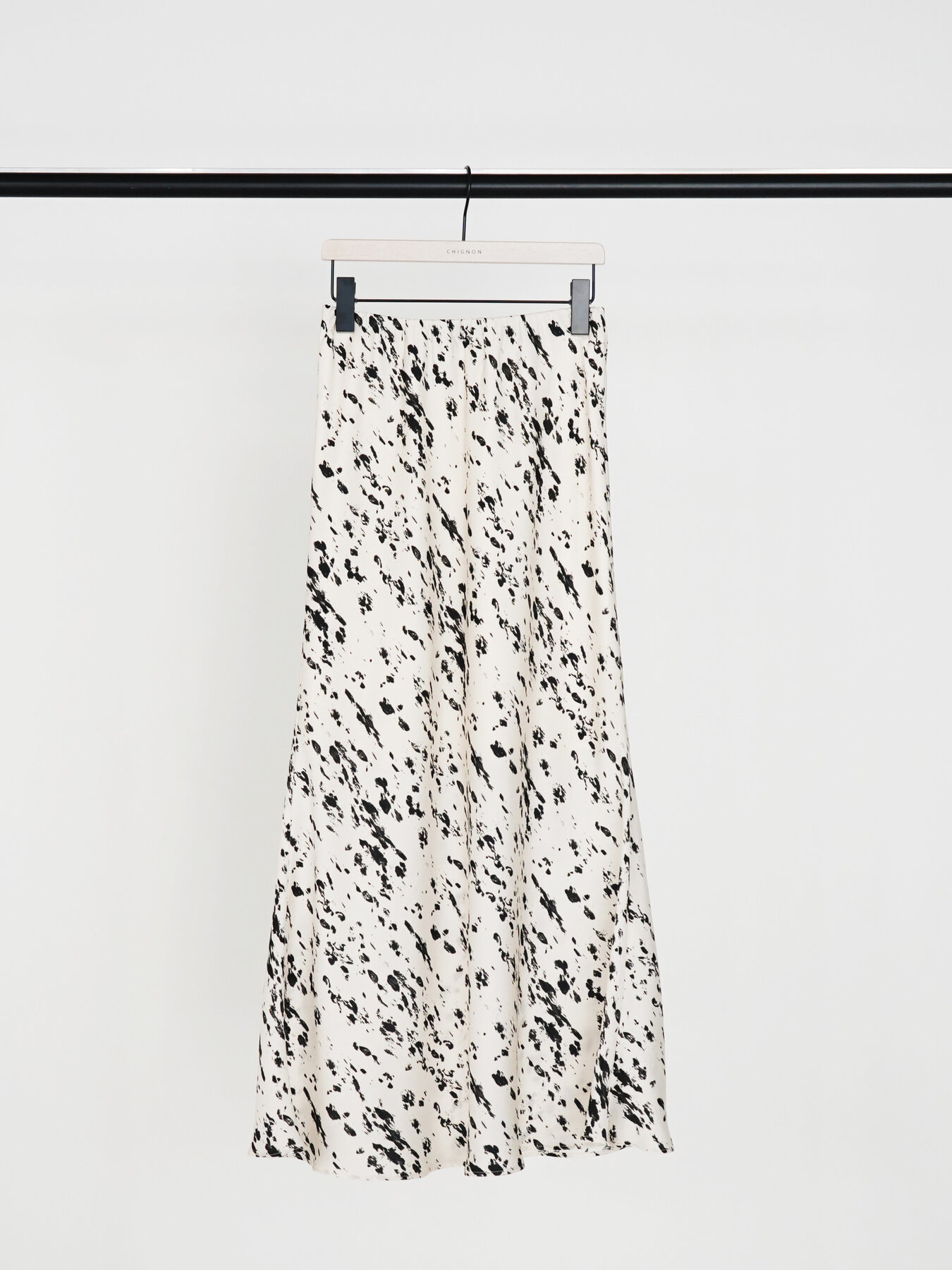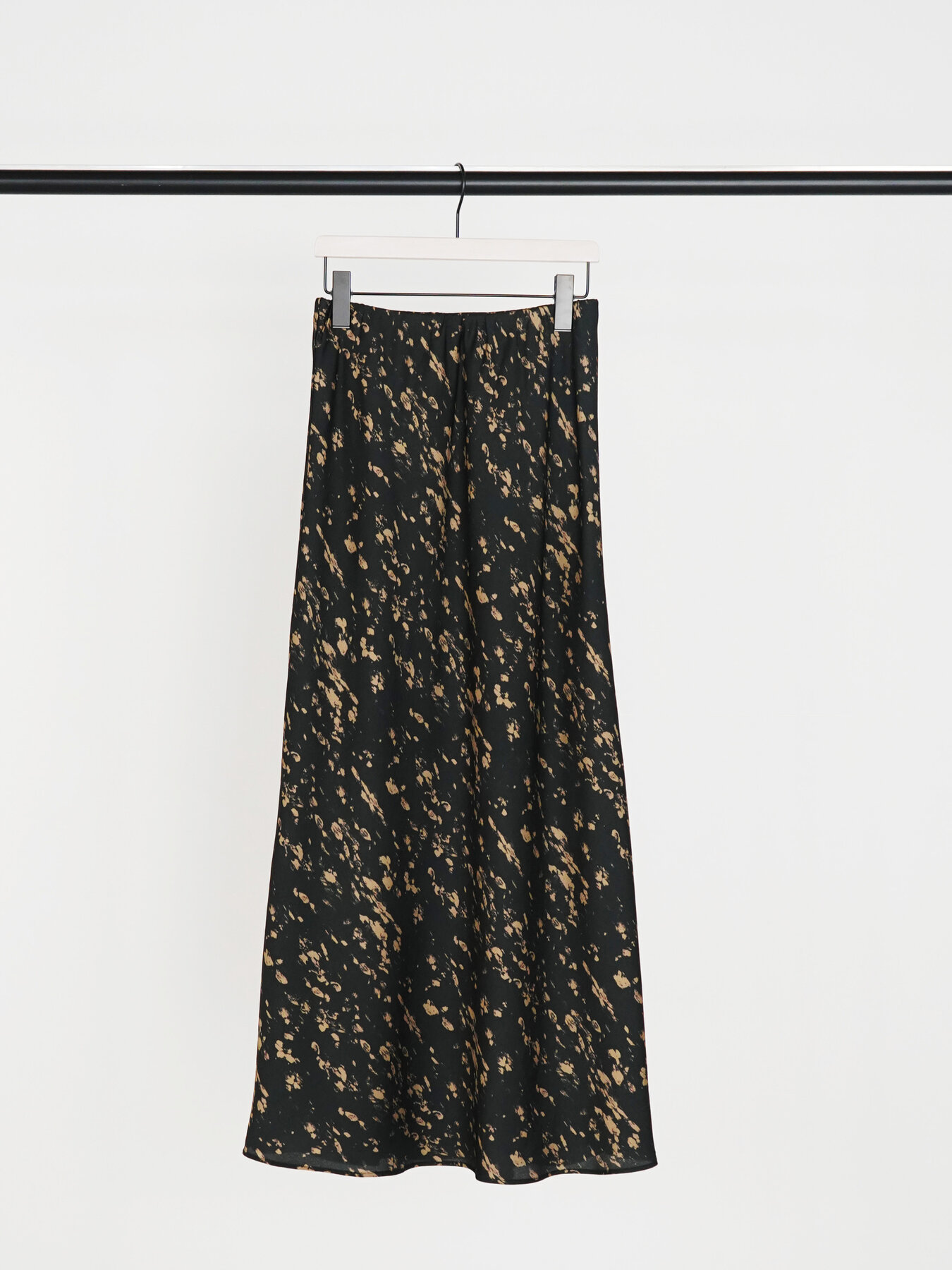 腰まわりはすっきりと、裾にかけて広がるマーメイドシルエットが女性らしいラインを演出。動くたびに揺れる軽やかなドレープ感も魅力です。