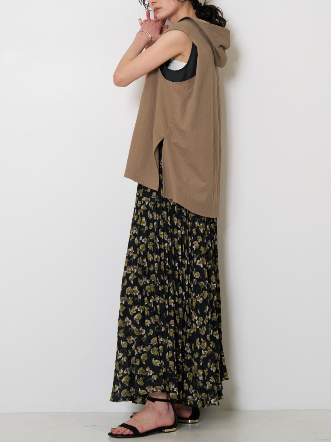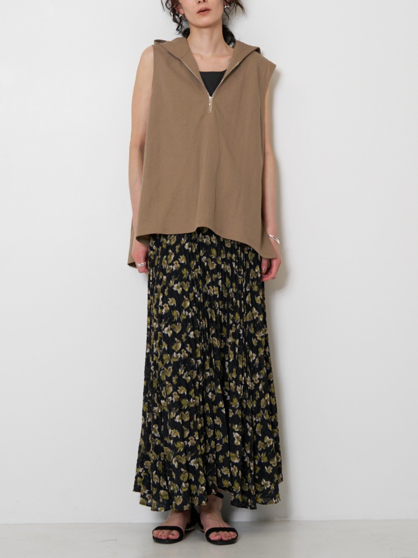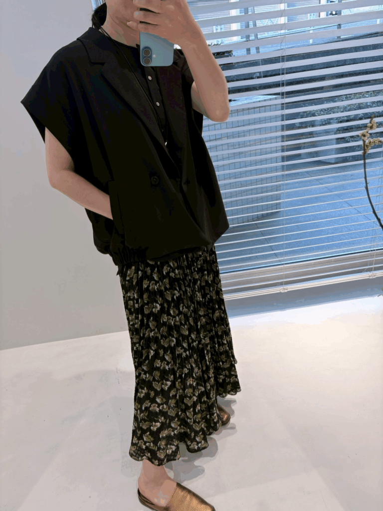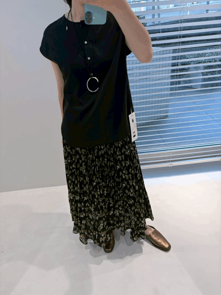 落ち着いたトーンのフラワープリントは甘くなりすぎず、大人のスタイリングに自然に馴染みます。