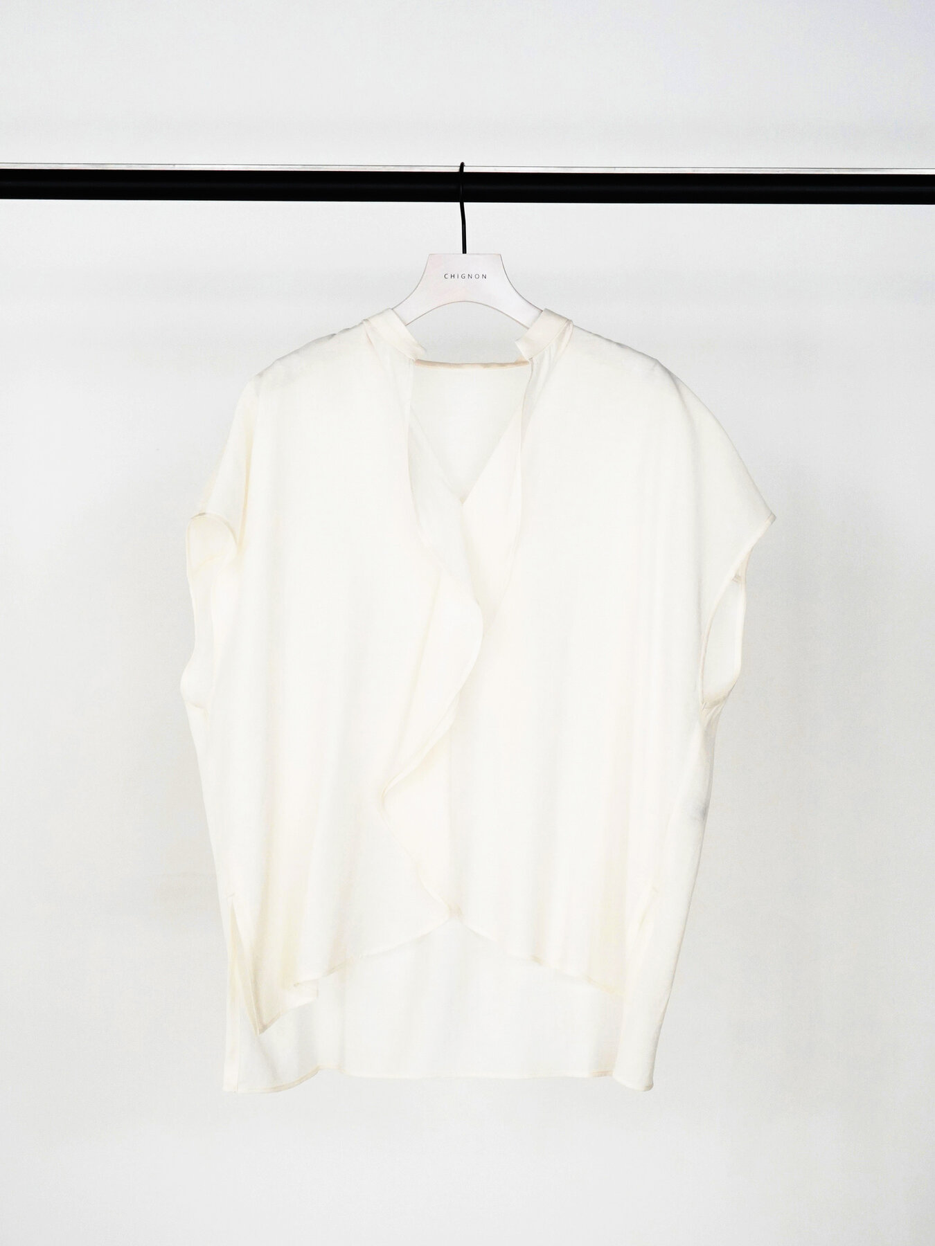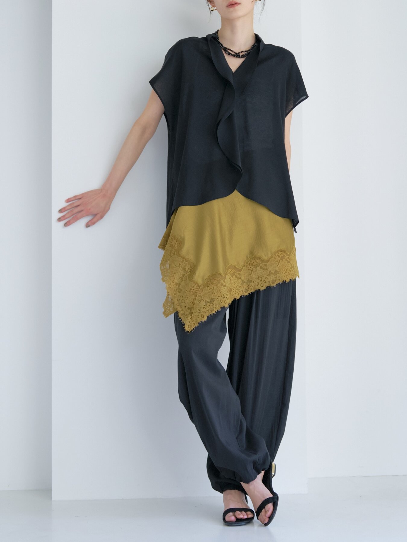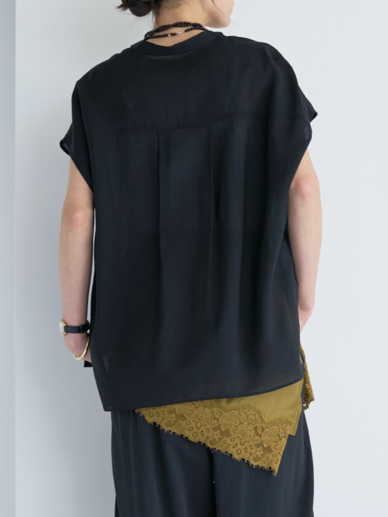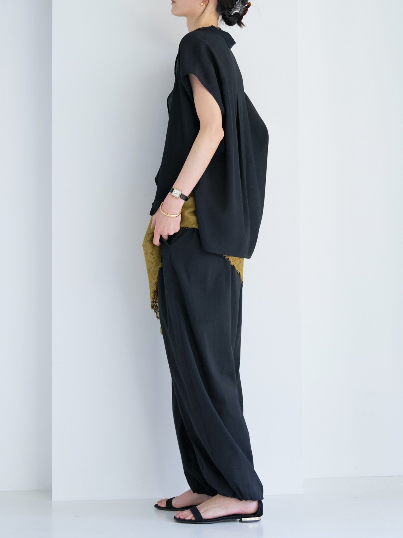 前後差のある着丈でタックインしやすく、ワイドパンツやテーパードパンツにさらりと合わせるだけで、ニュアンスのあるモードスタイルが完成。