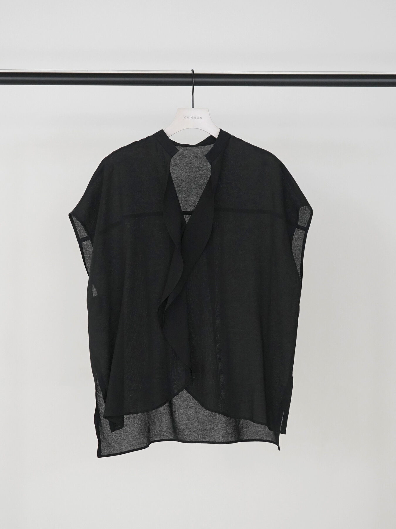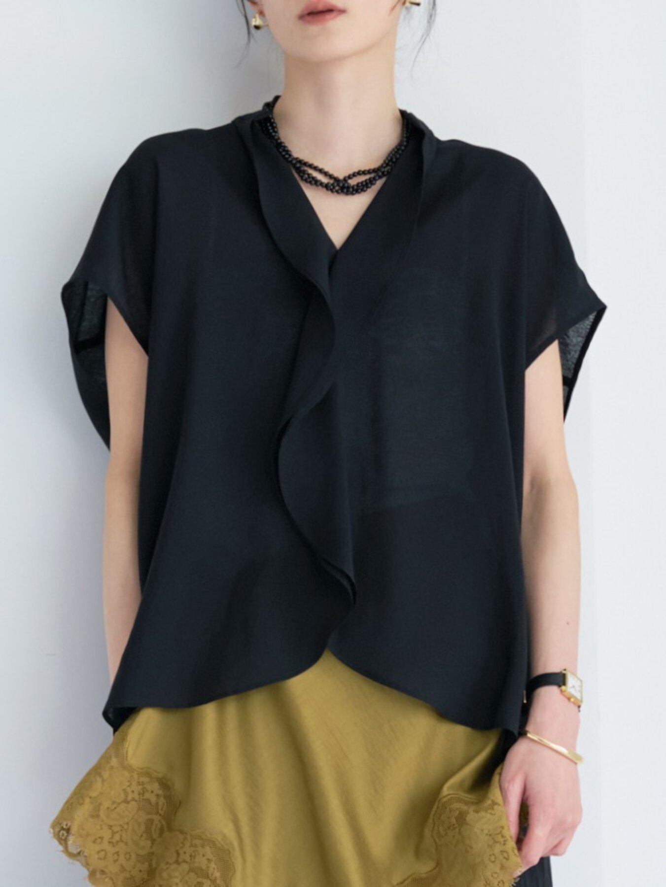 軽やかな透け感と、裾まで続く流れるようなラッフルが印象的なデザインブラウス。